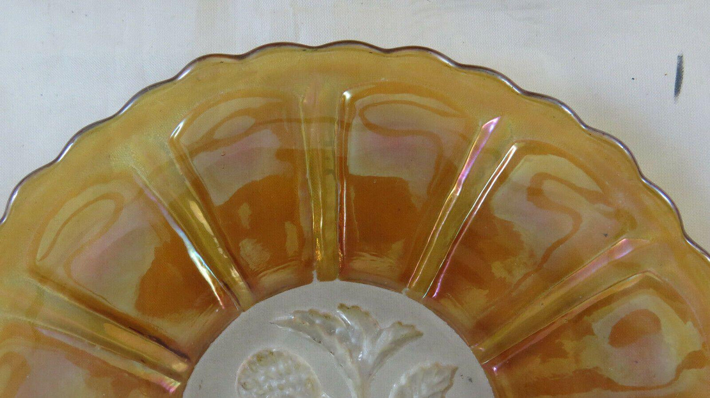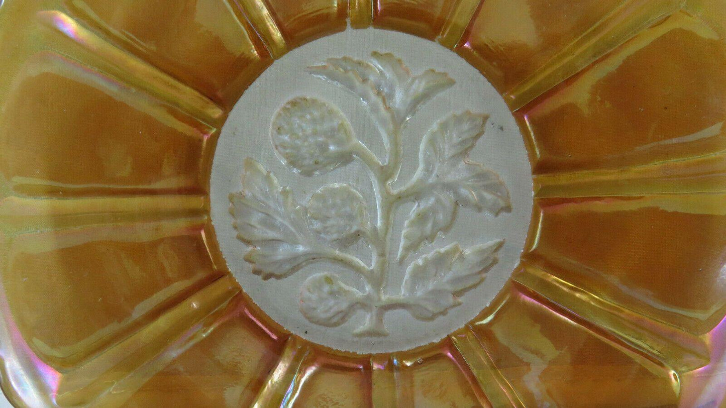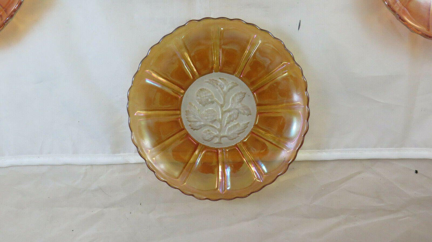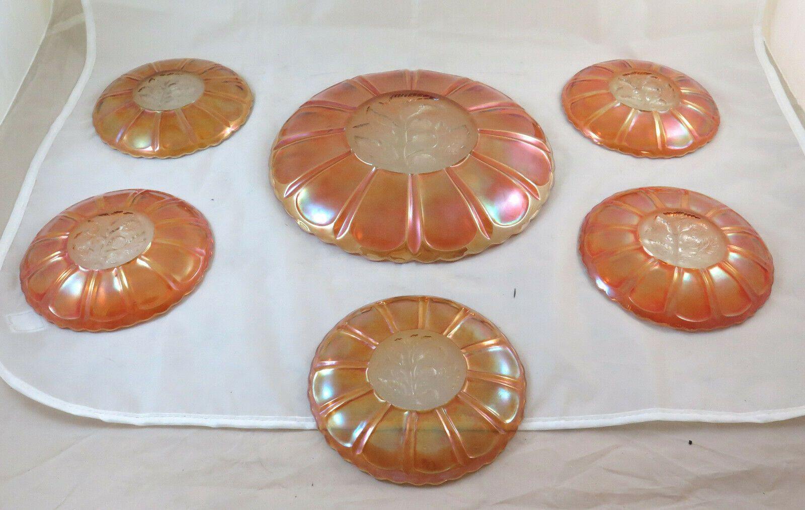 Six antique art nouveau glass plates with petals on the edge and flowers in the center.