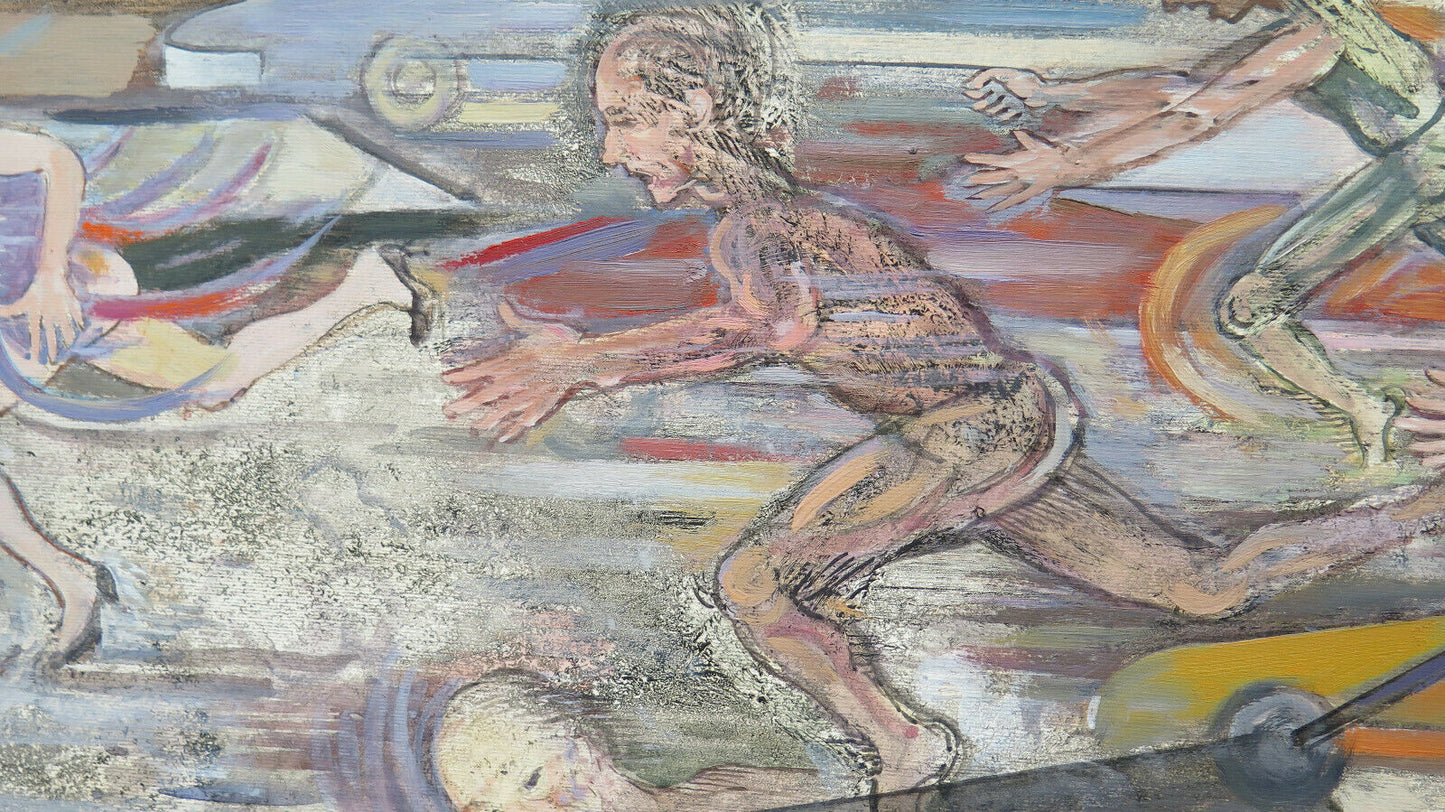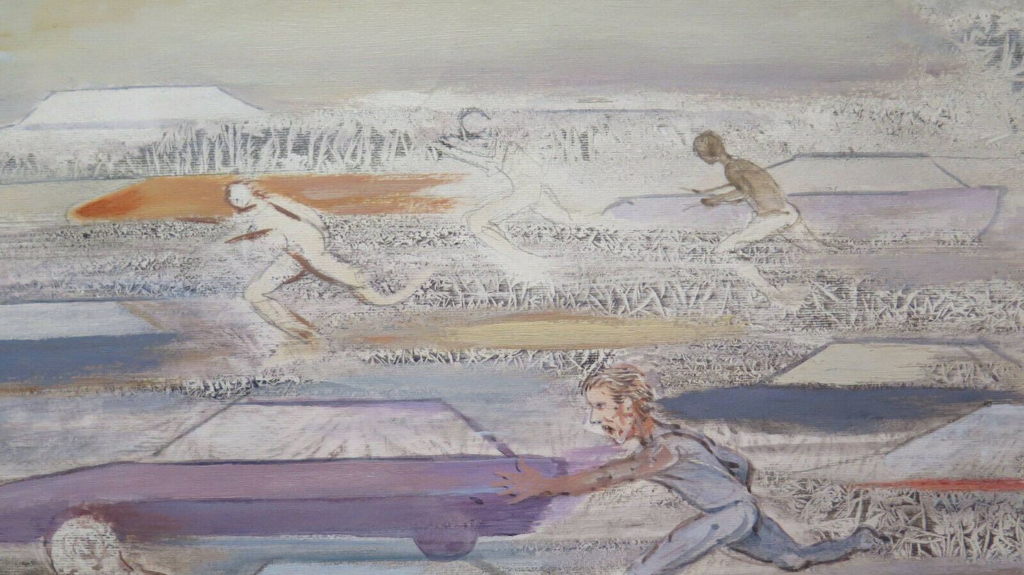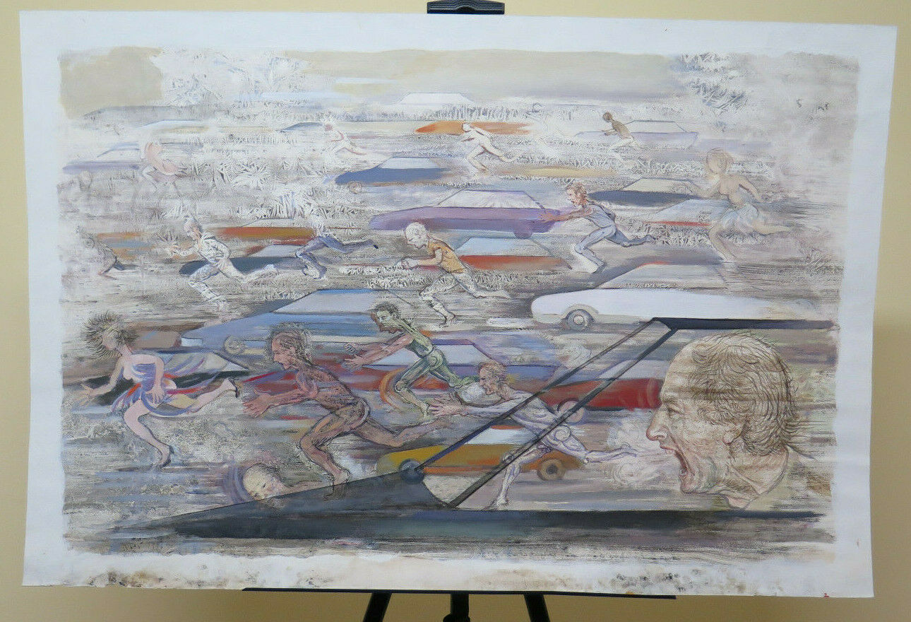 Soggetto: automobilisti stressati in uno scenario caotico astratto, parte della serie "stress" dipinta dal Maestro Pancaldi tra gli anni '70 e '90.