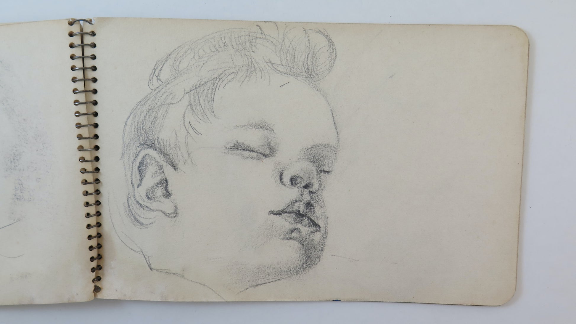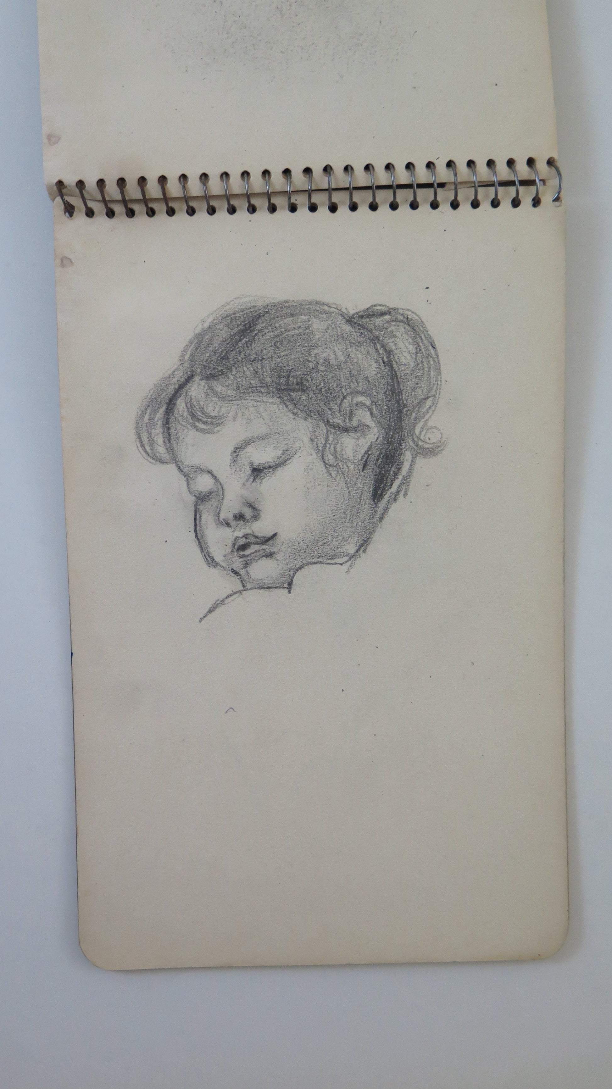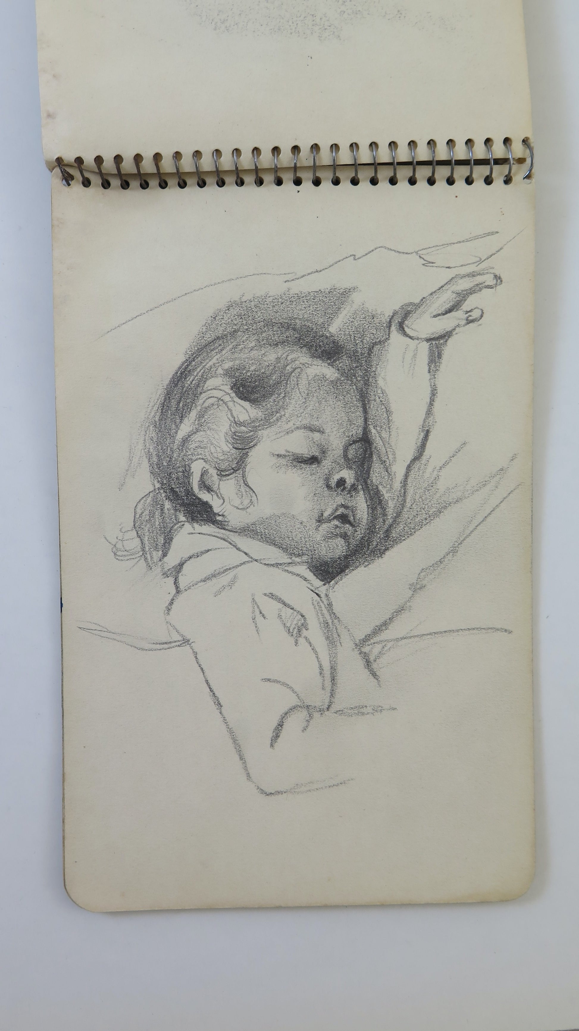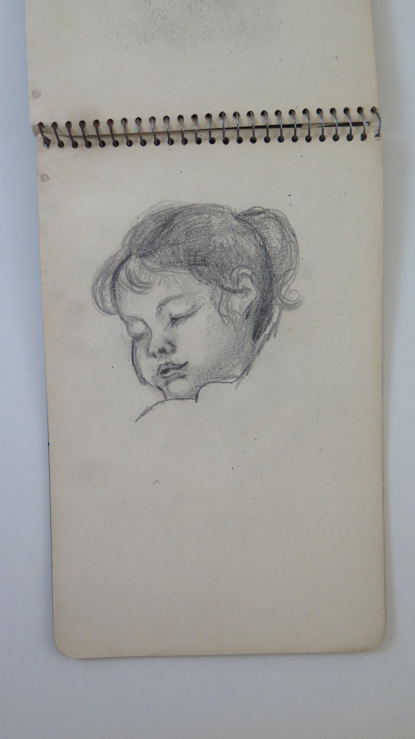 Antico album da disegno contenente 13 schizzi a matita su carta con ritratti di bambini che dormono.
