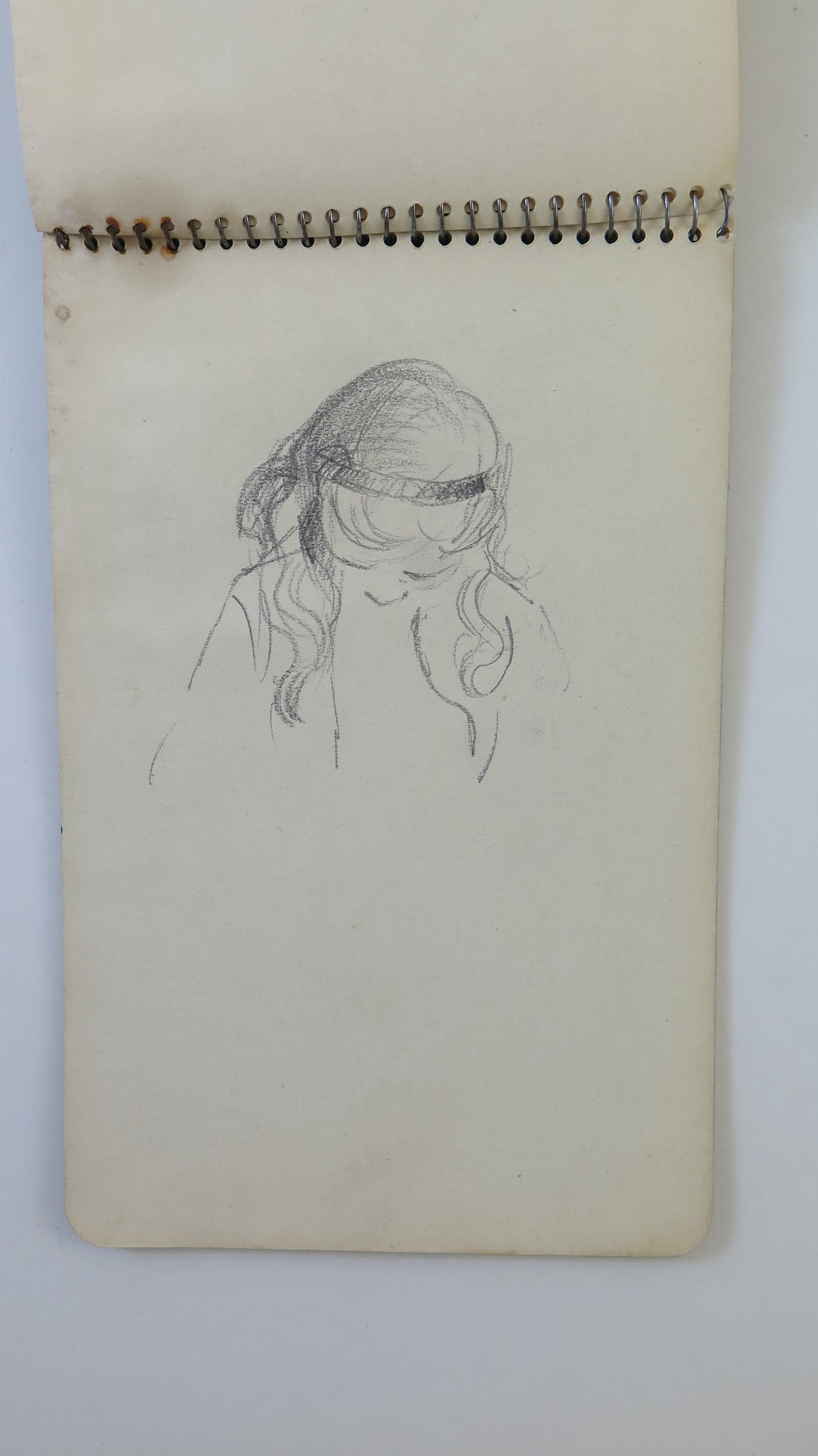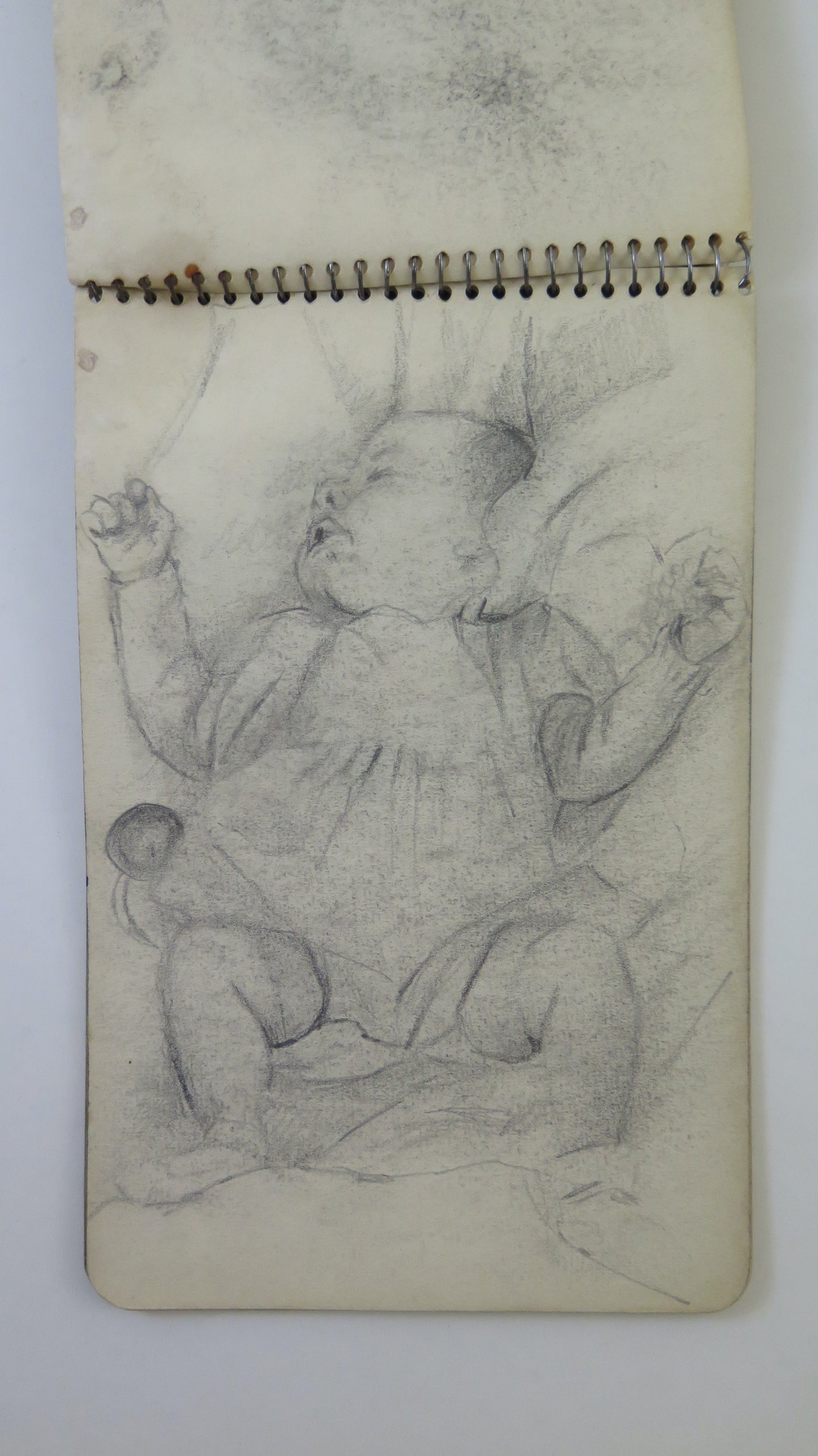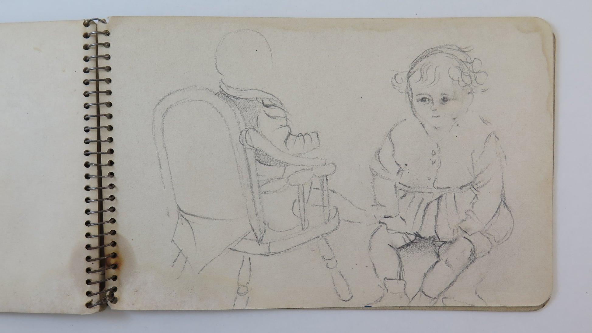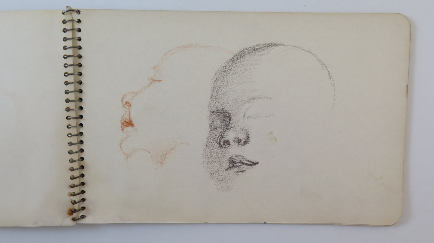 Antico album da disegno contenente 13 schizzi a matita su carta con ritratti di bambini che dormono.