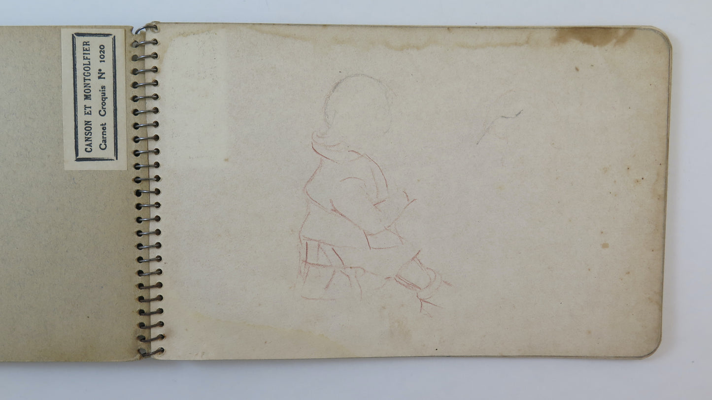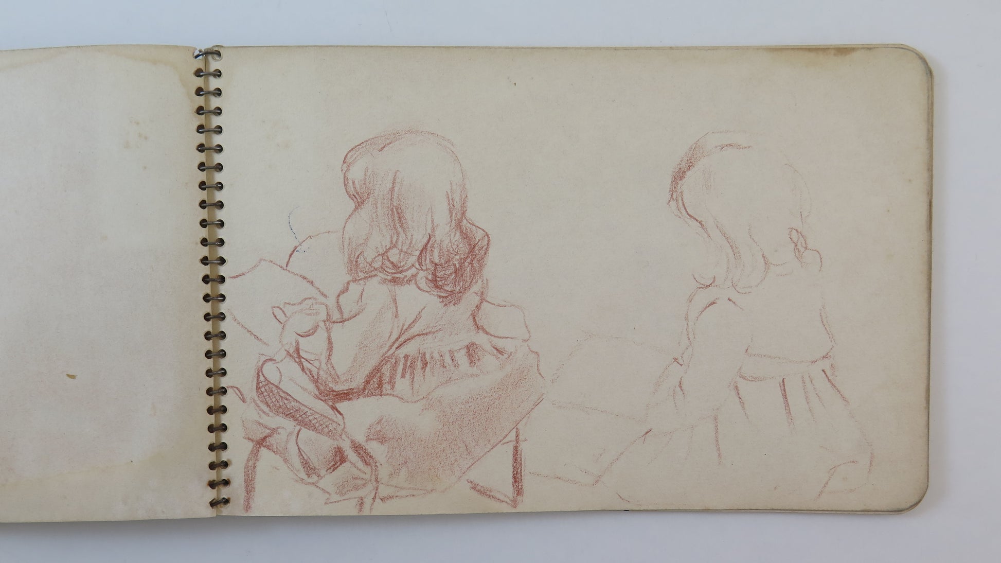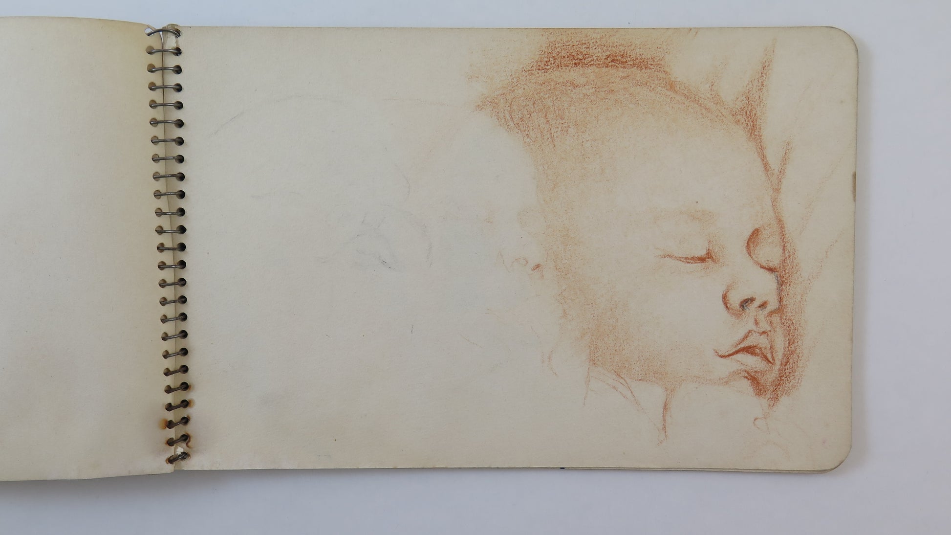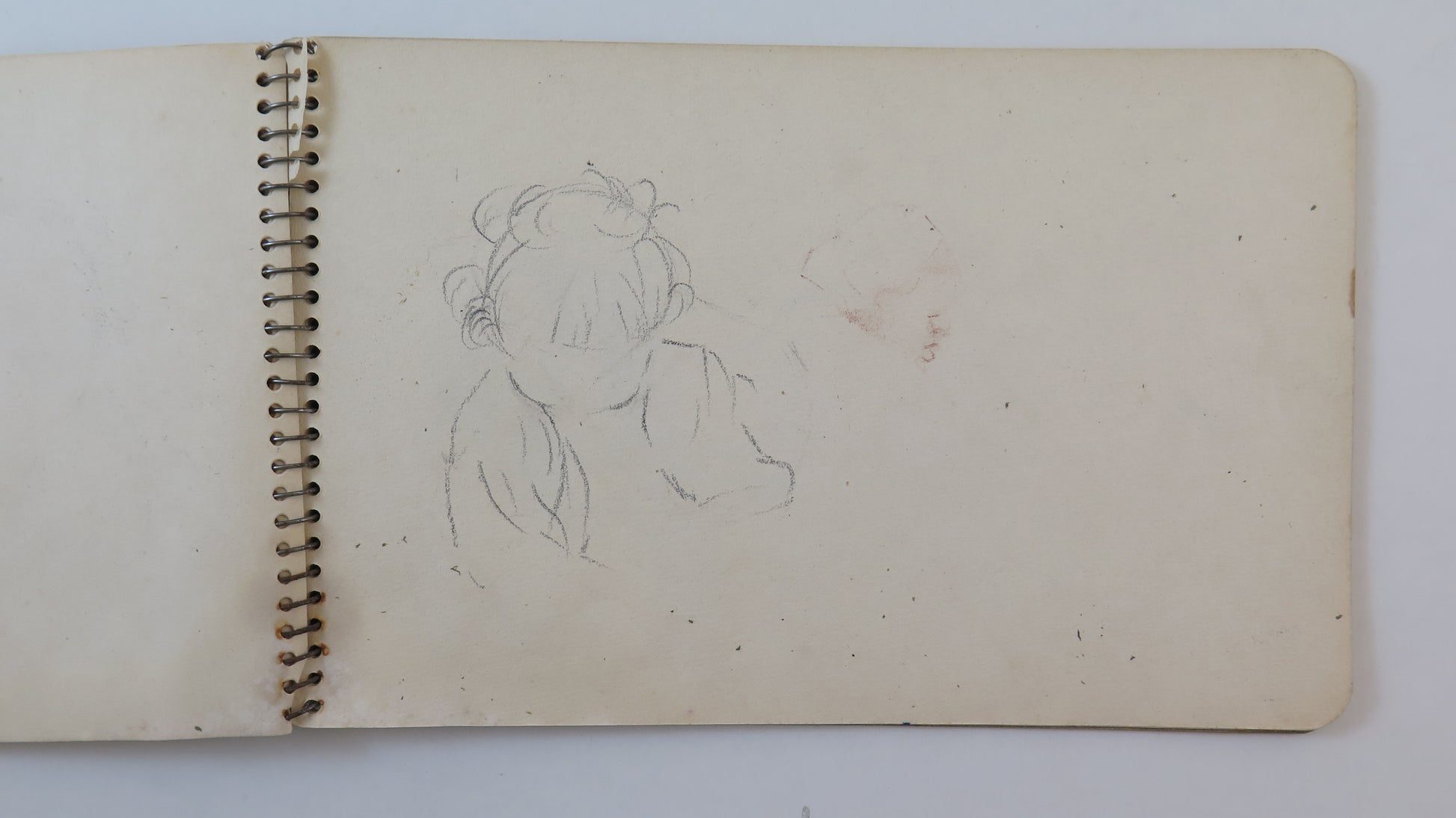 Antico album da disegno contenente 13 schizzi a matita su carta con ritratti di bambini che dormono.