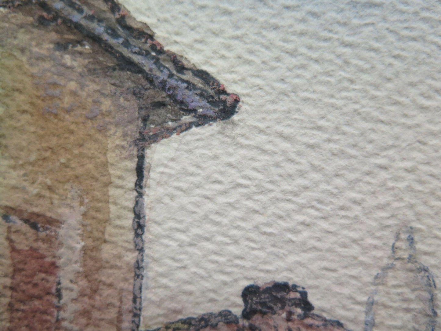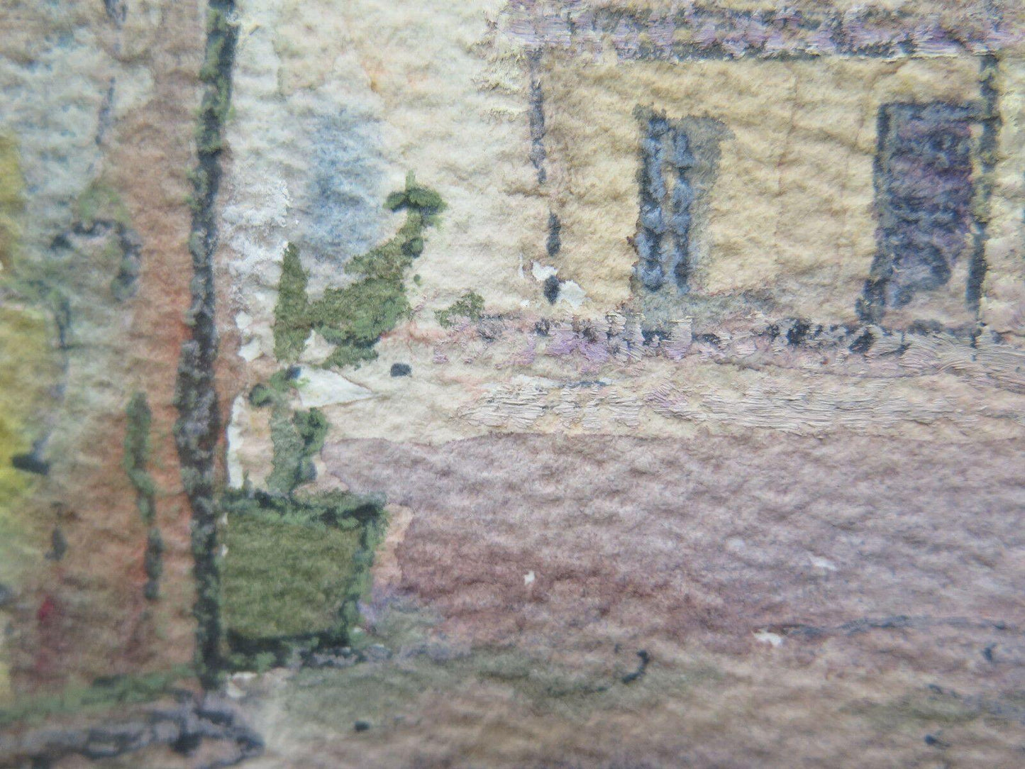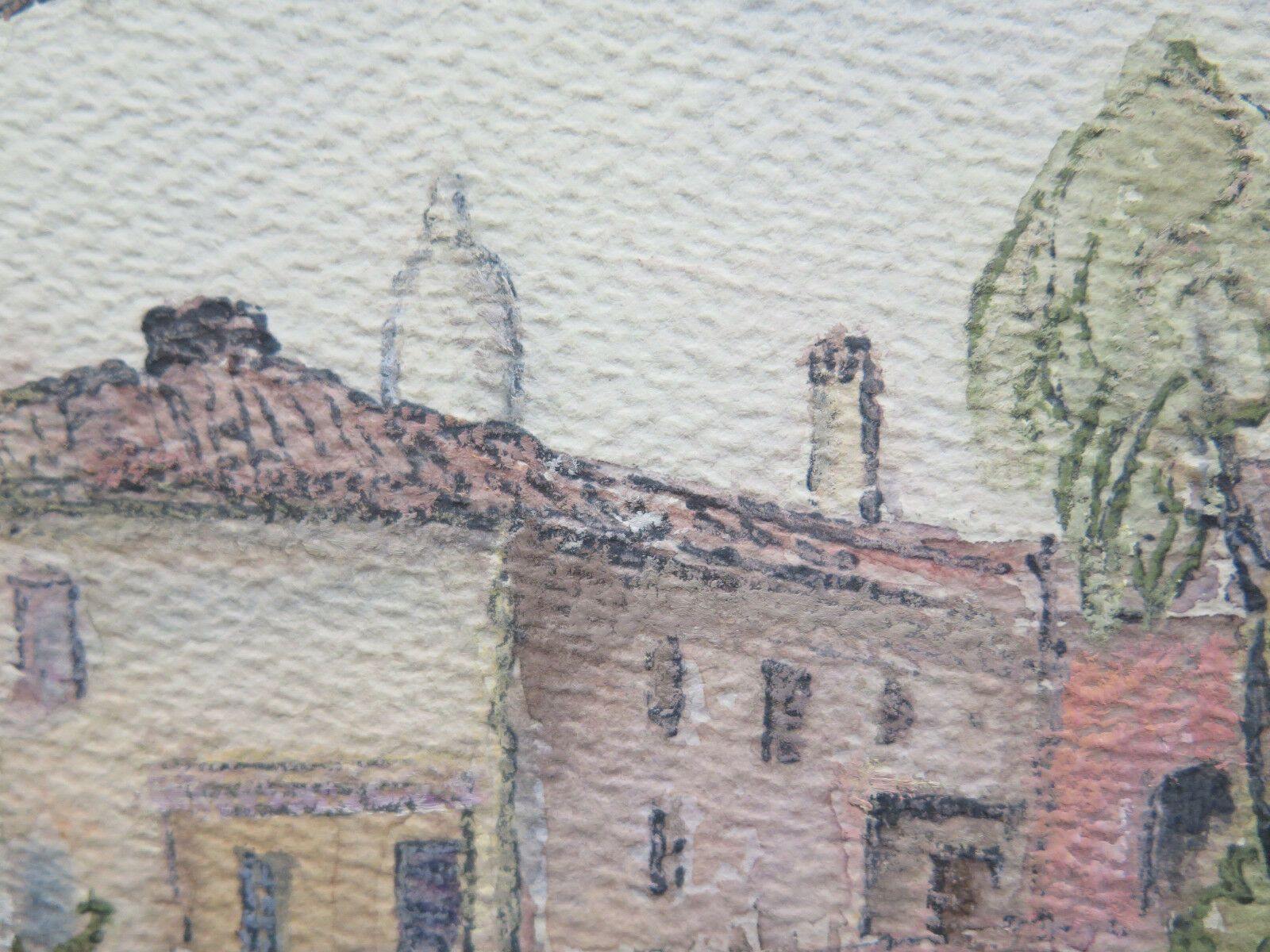 Particolare dipinto ad acquerello su carta opera del pittore Gaetano Pancaldi (1922-2014) di Piumazzo di Castelfranco Emilia raffigurante uno scorcio di un borgo di campagna.