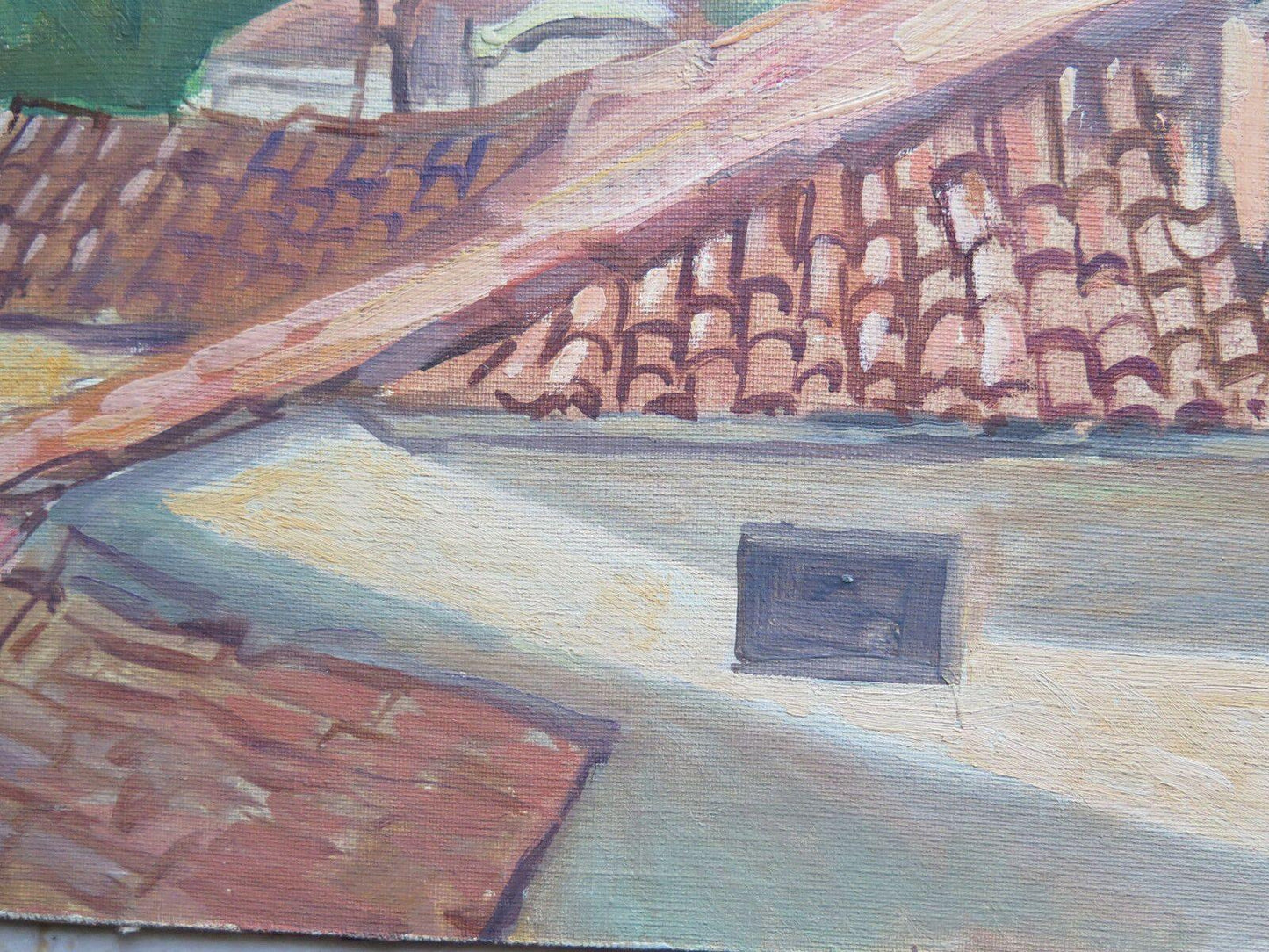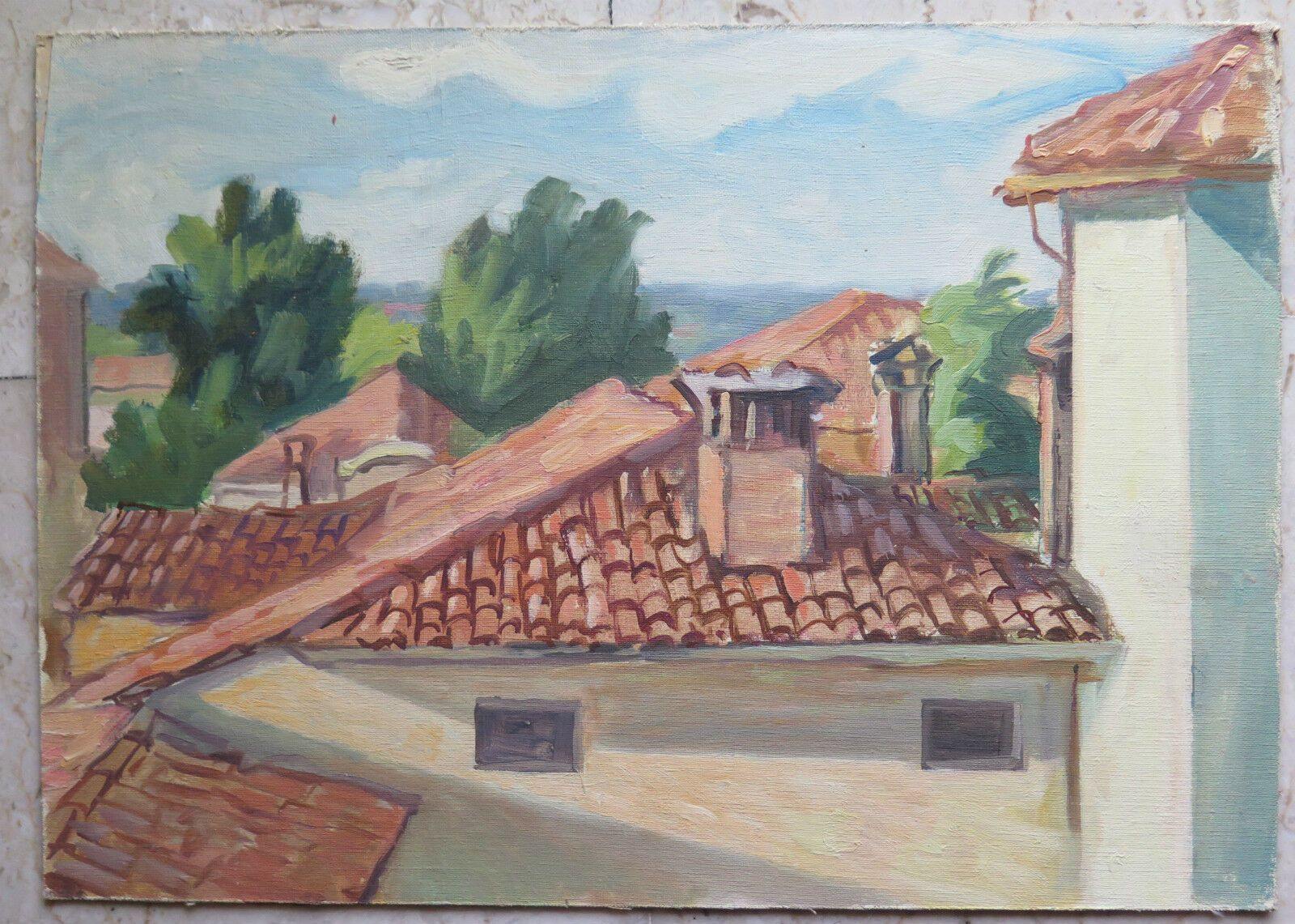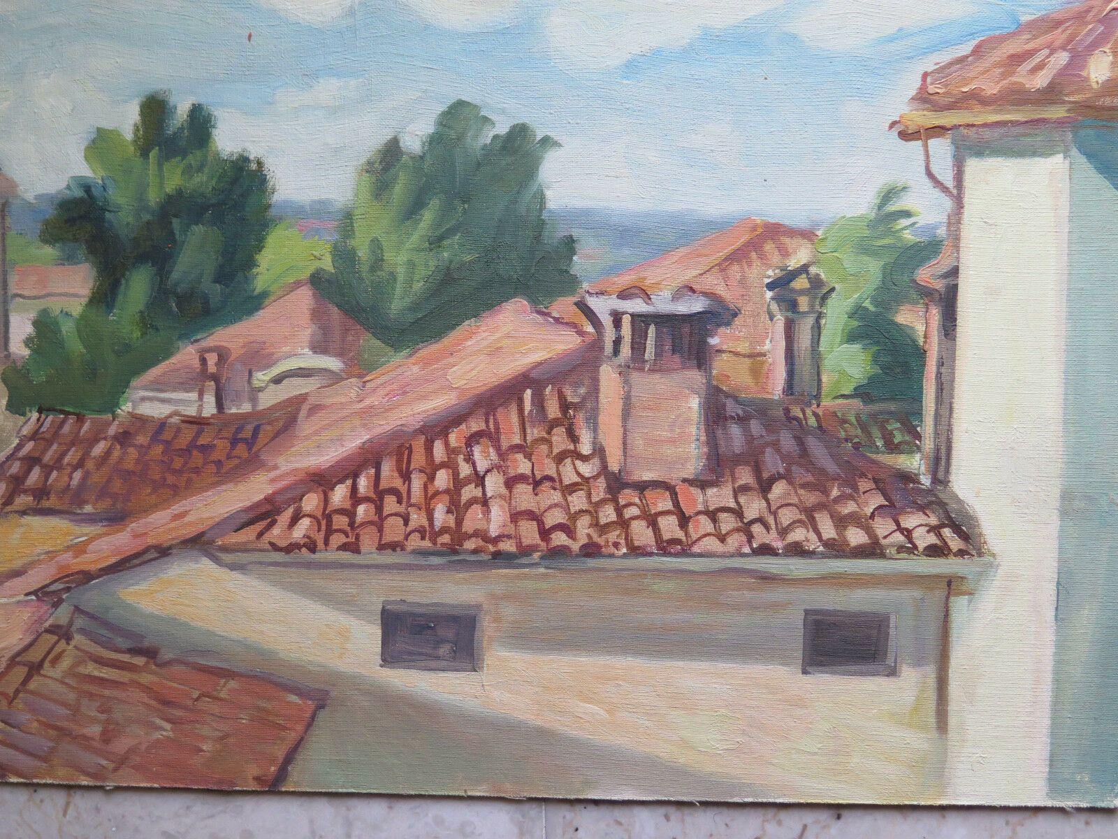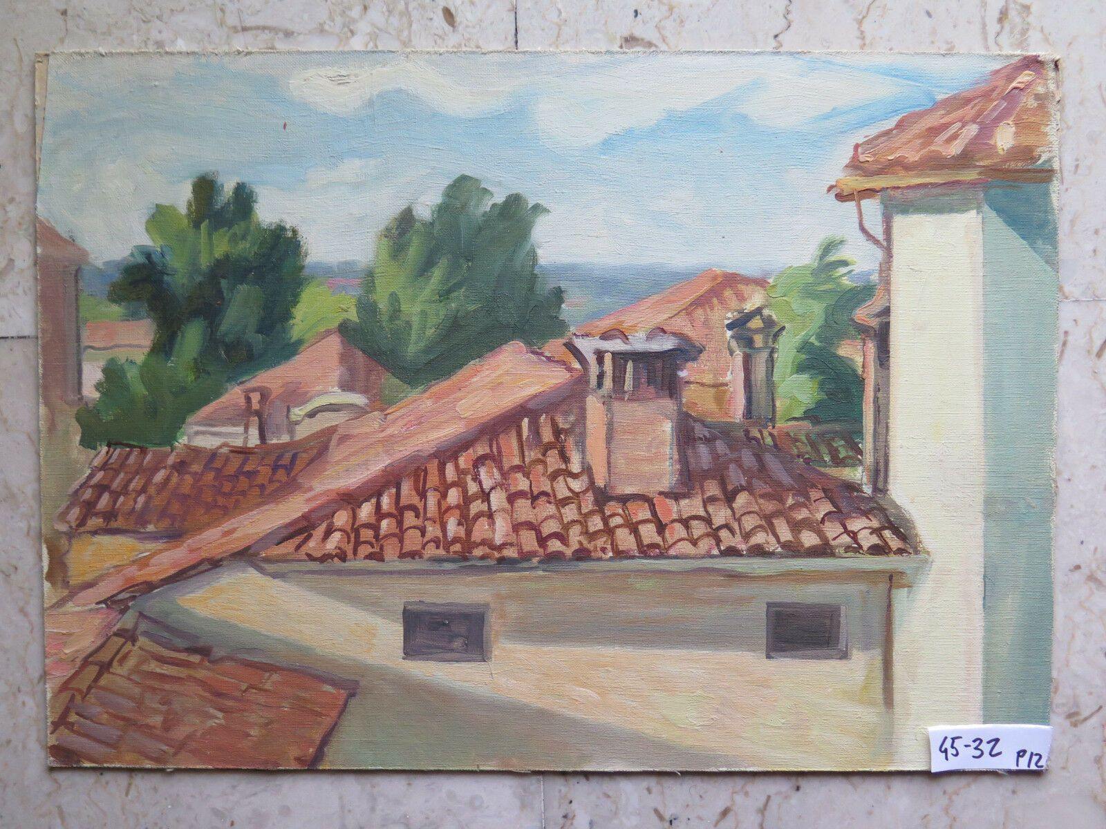 Particolare dipinto ad olio su tavola realizzato dal pittore modenese Gaetano Pancaldi (1922-2014), veduta dei tetti del paese di Piumazzo, soggetto ricorrente nella produzione dell'artista.