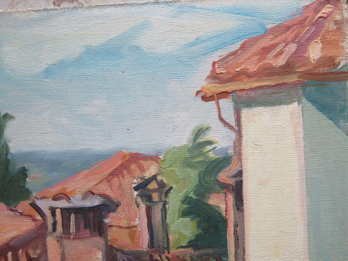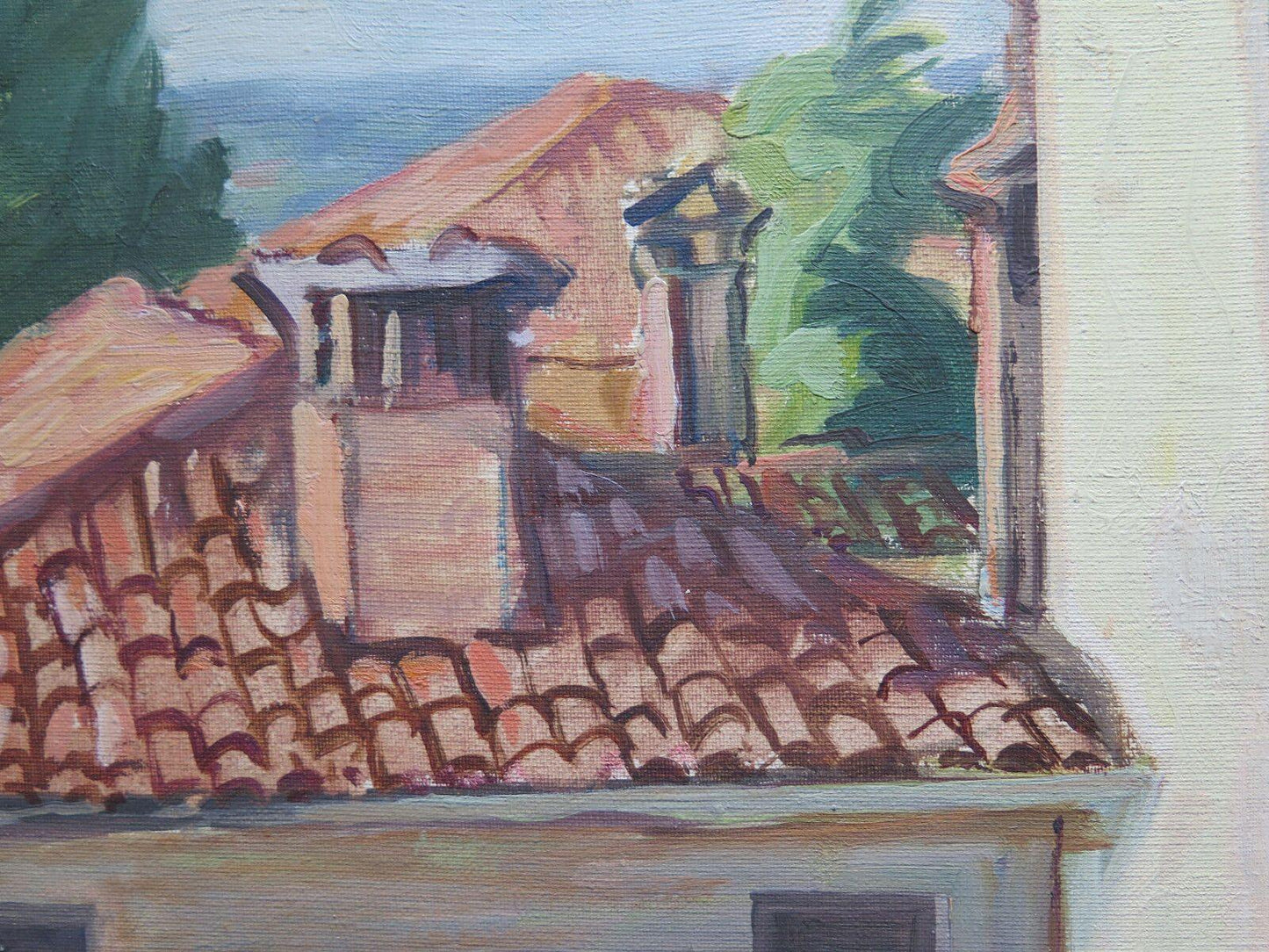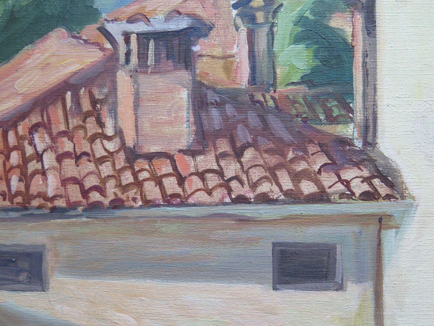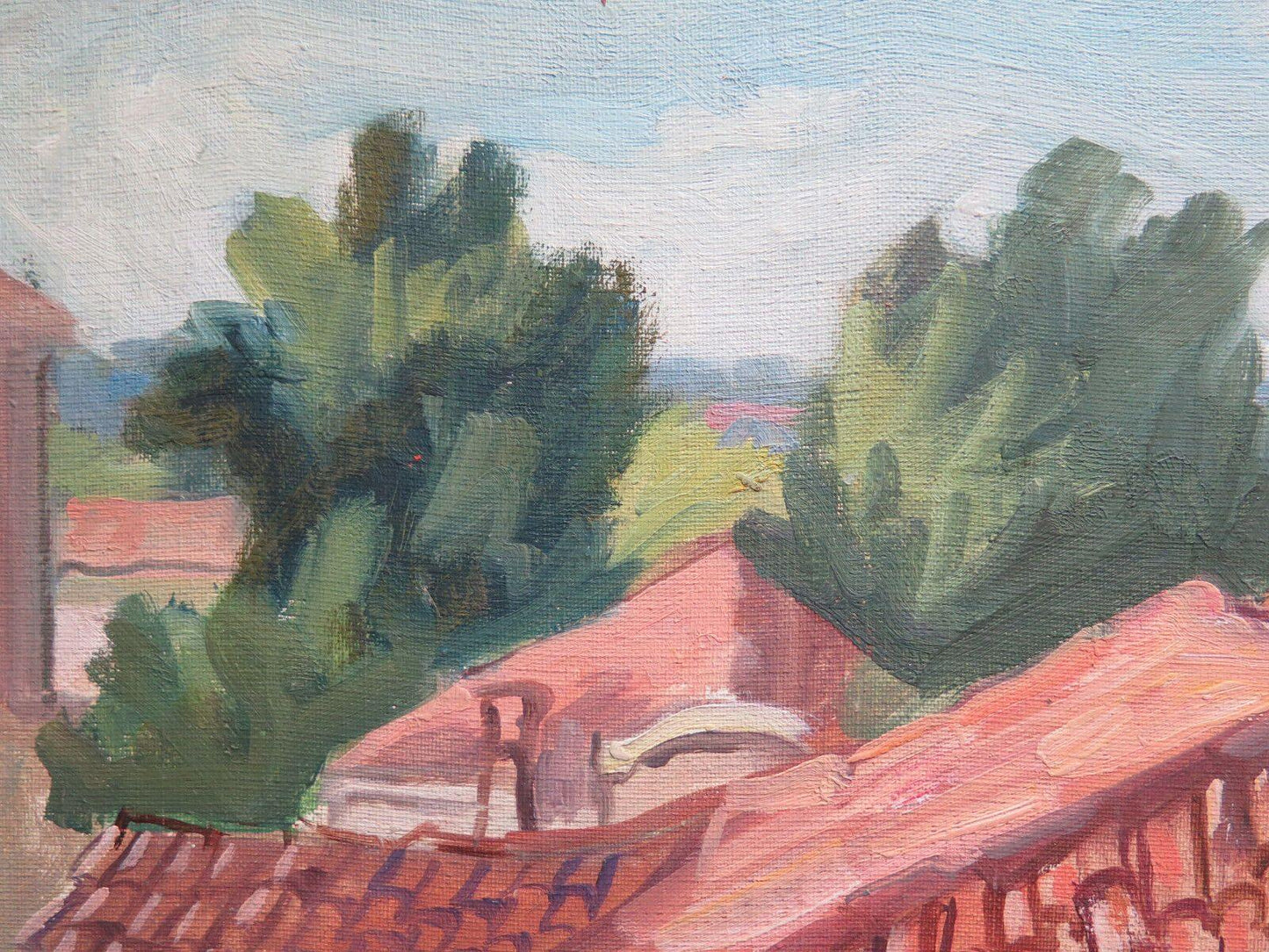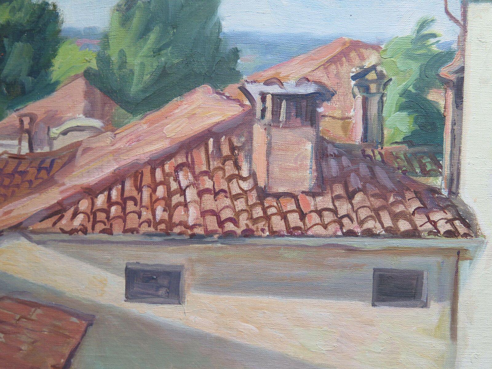 Particolare dipinto ad olio su tavola realizzato dal pittore modenese Gaetano Pancaldi (1922-2014), veduta dei tetti del paese di Piumazzo, soggetto ricorrente nella produzione dell'artista.