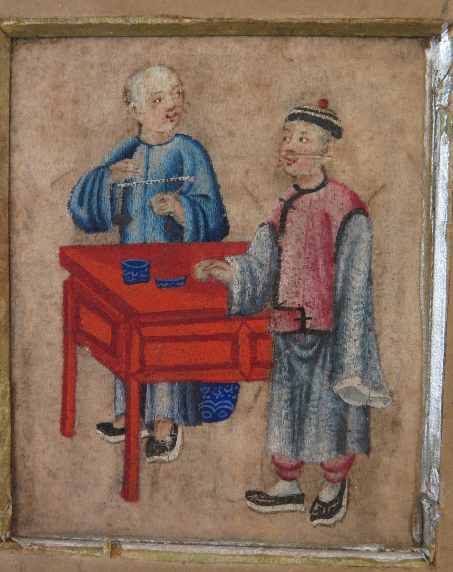 Antico dipinto di piccole dimensioni che raffigura dei personaggi in abiti orientali.