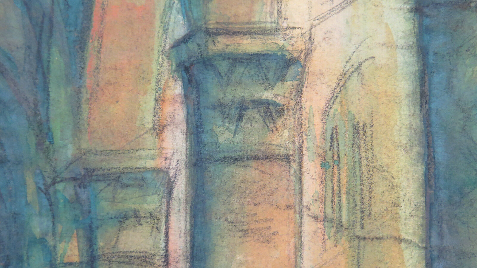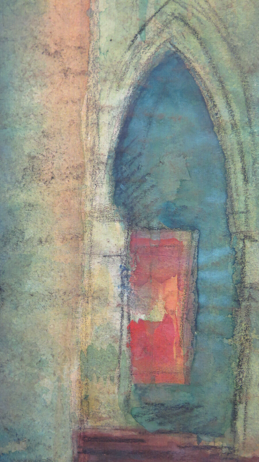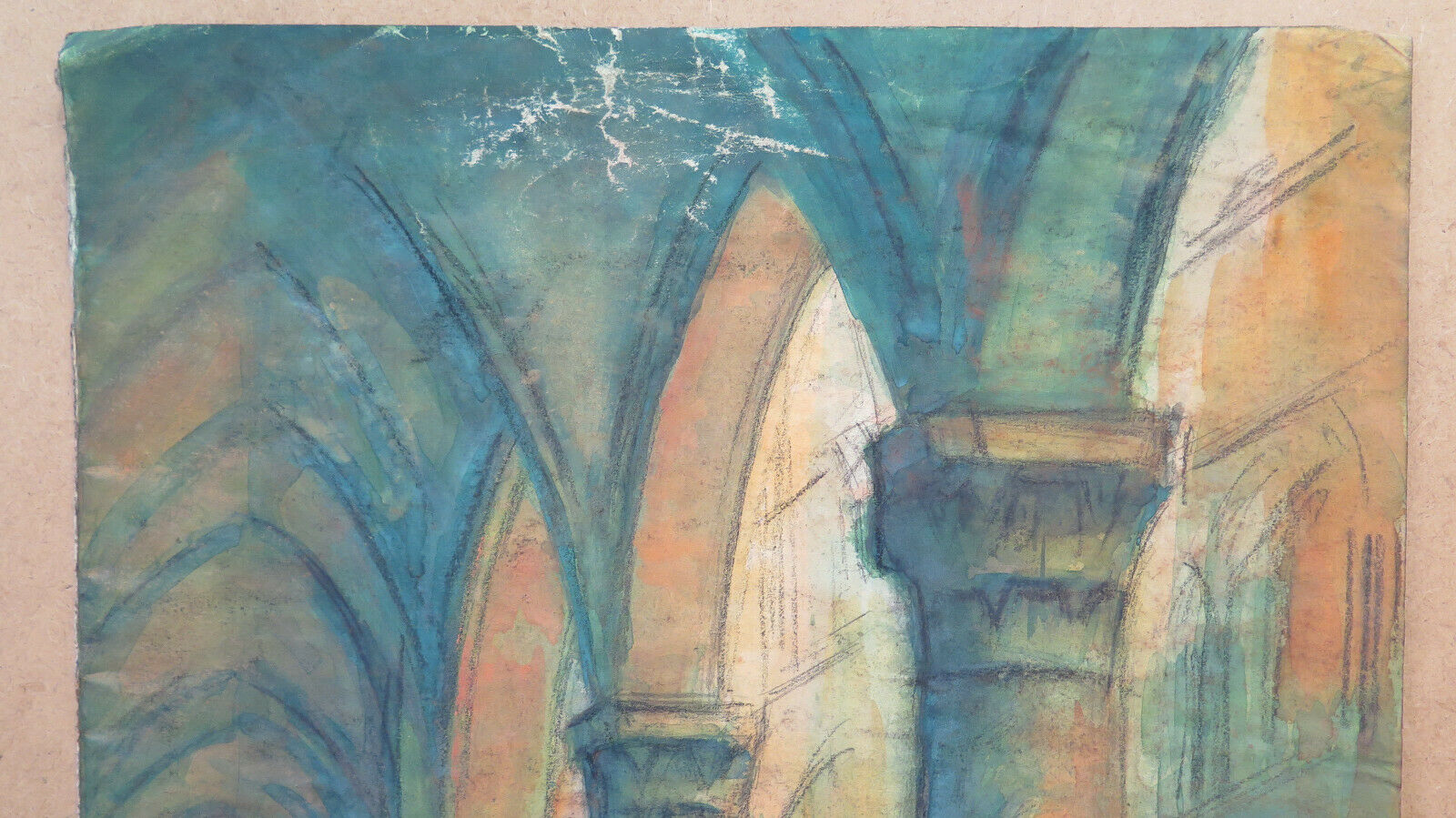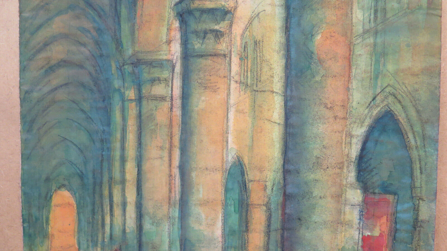 Interno di una chiesa gotica francese, al retro è presente un altro dipinto con l'esterno di un'altra chiesa.