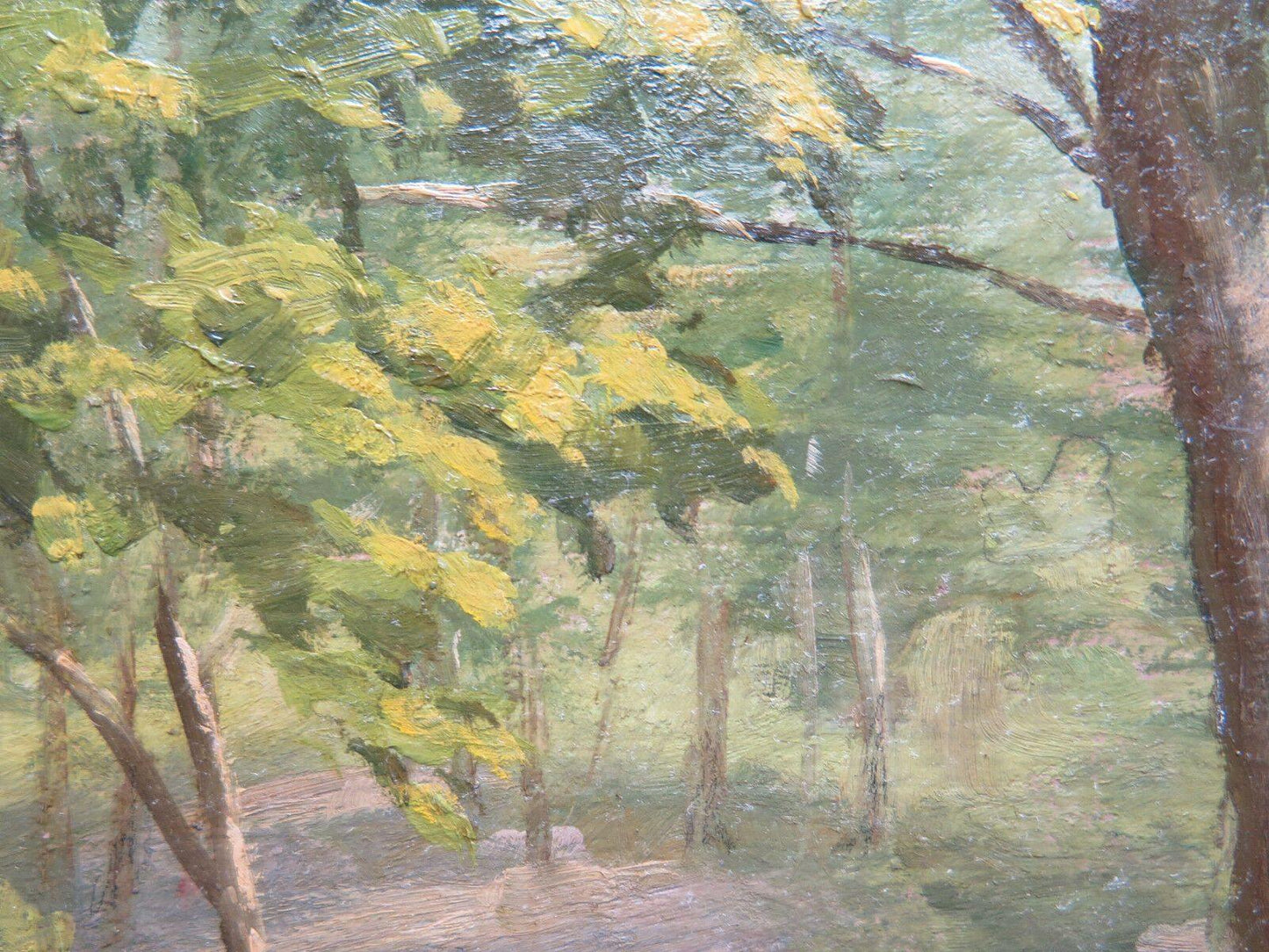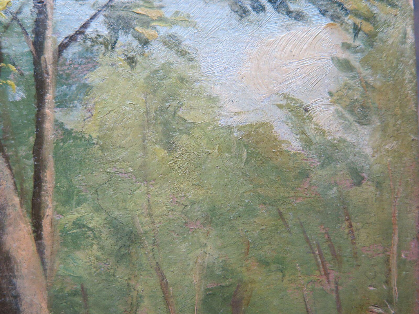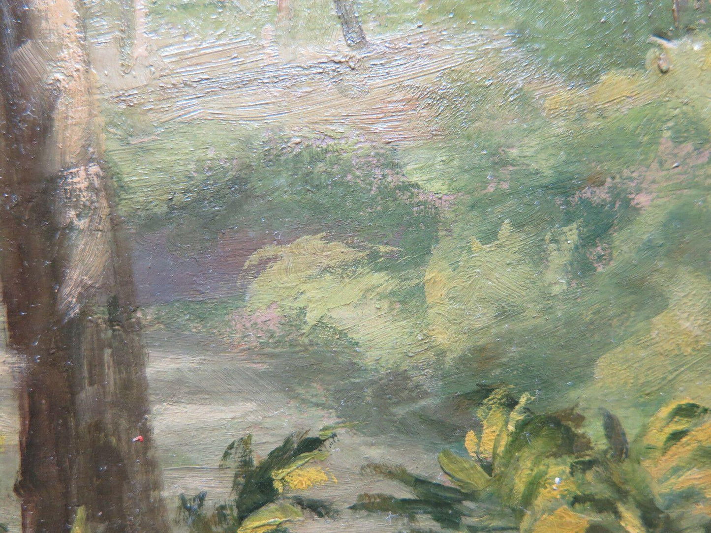 Elegante dipinto su tavola realizzato dal pittore modendese Gaetano Pancaldi verso la metà del novecento che rappresenta un paesaggio di campagna in primavera dal gusto impressionista.