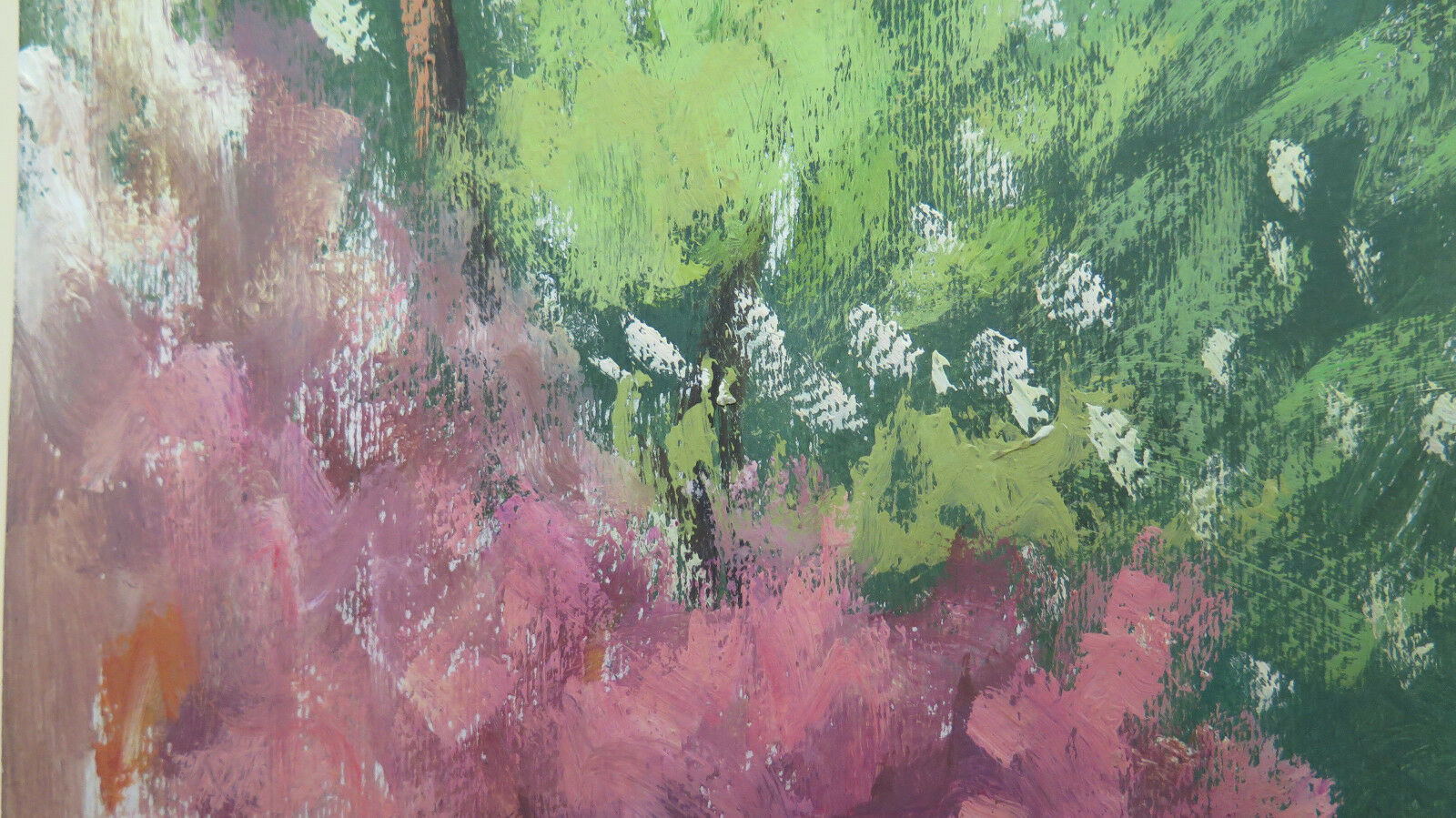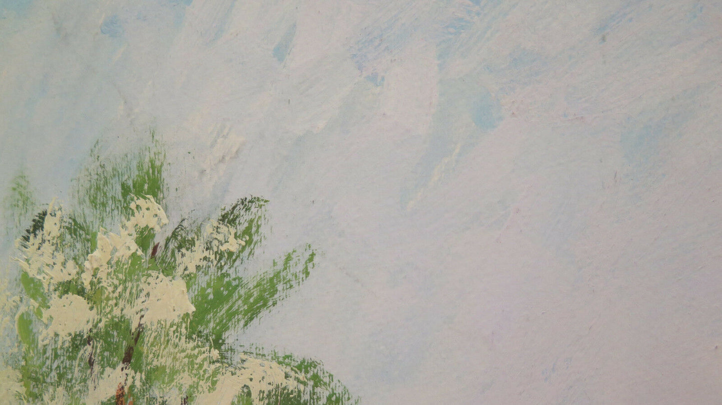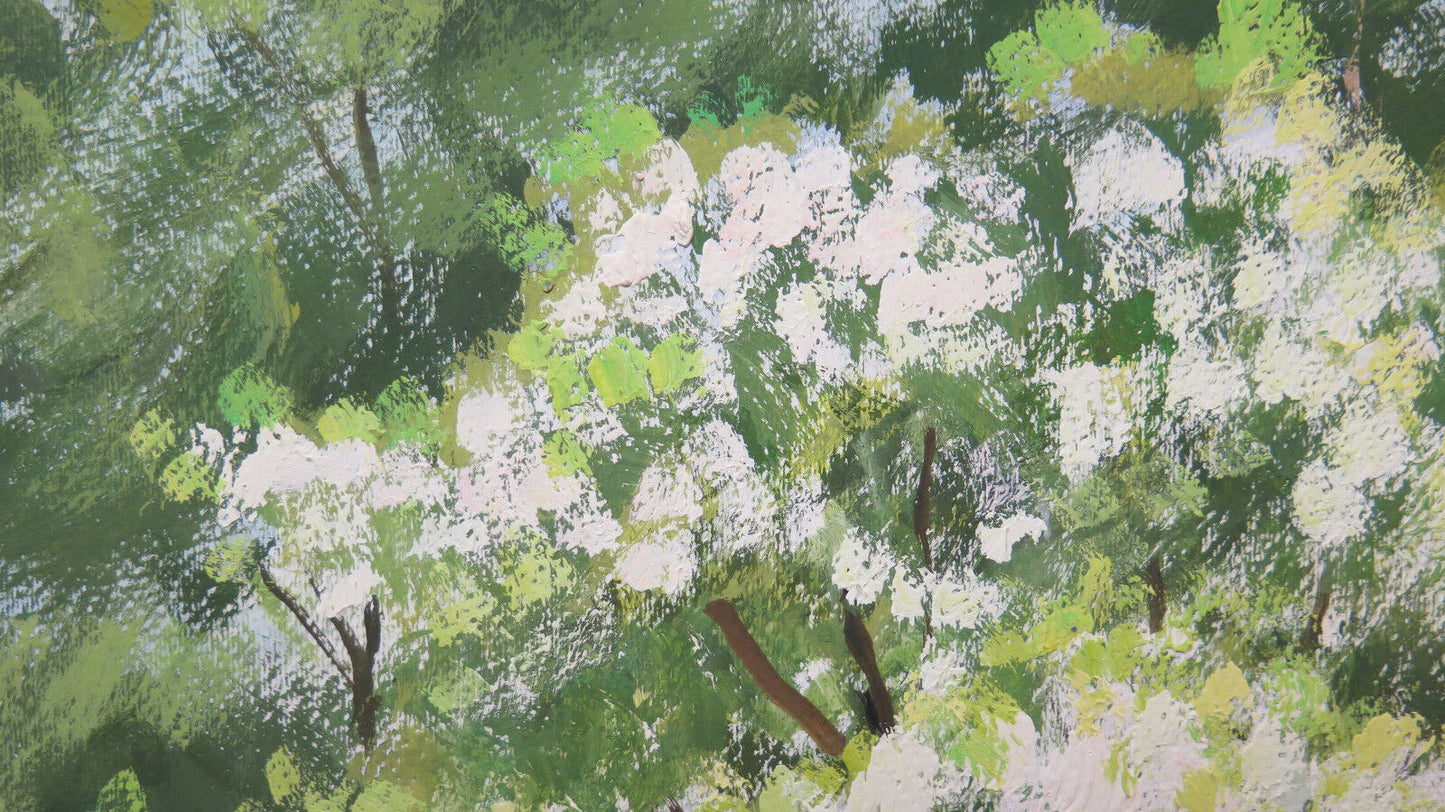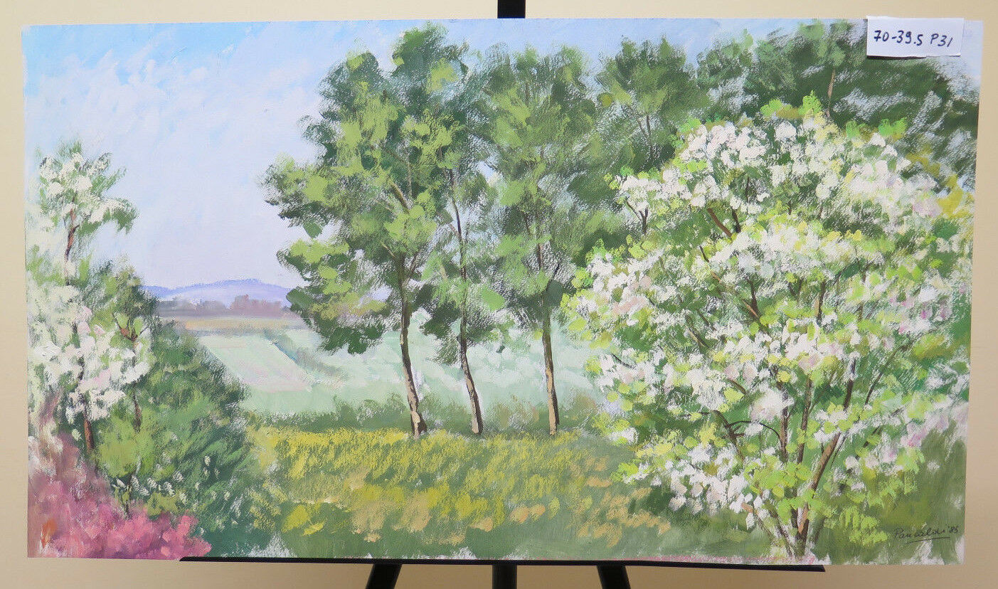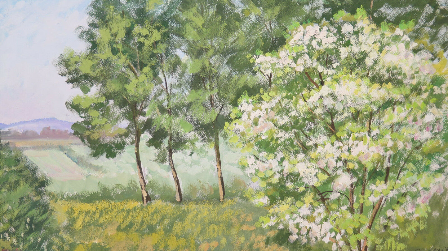 Soggetto: paesaggio di campagna in primavera con alberi in fiore. Firmato e datato '85.