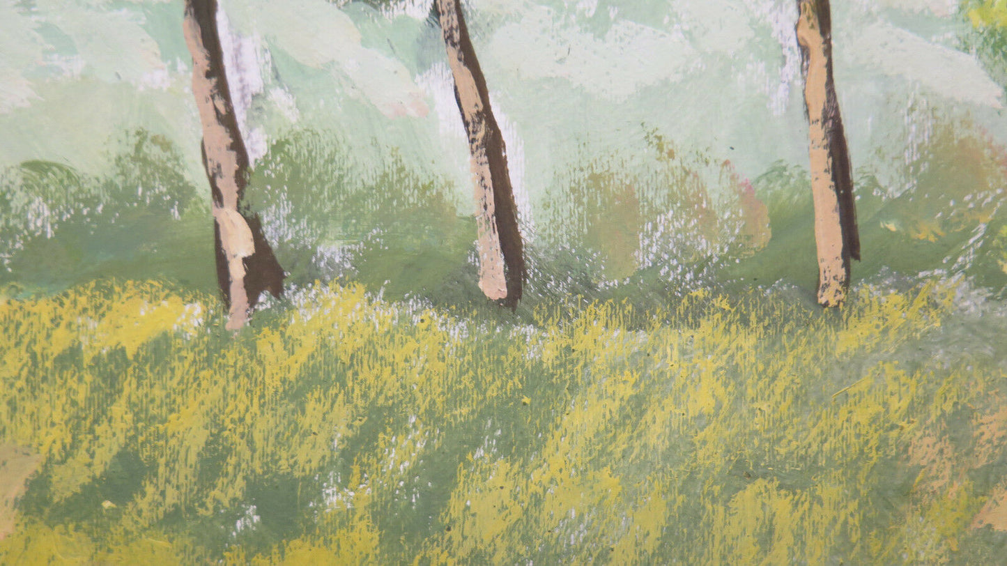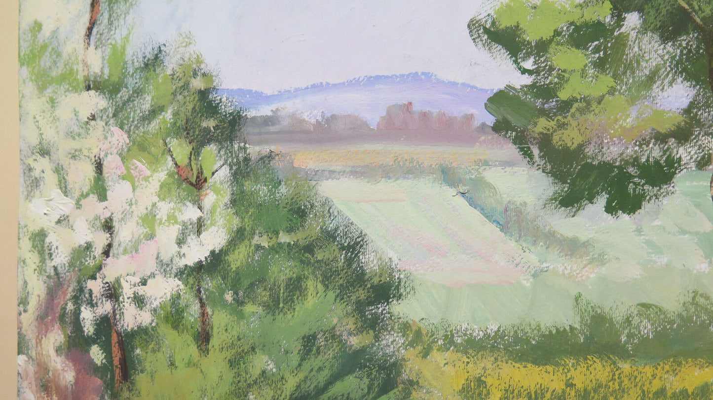 ANTICO DIPINTO OLIO SU TAVOLA QUADRO PAESAGGIO DI CAMPAGNA ALBERI IN FIORE P31