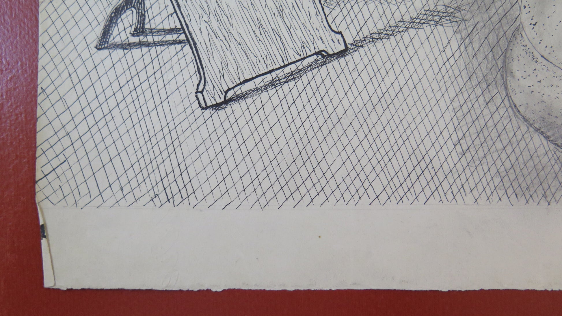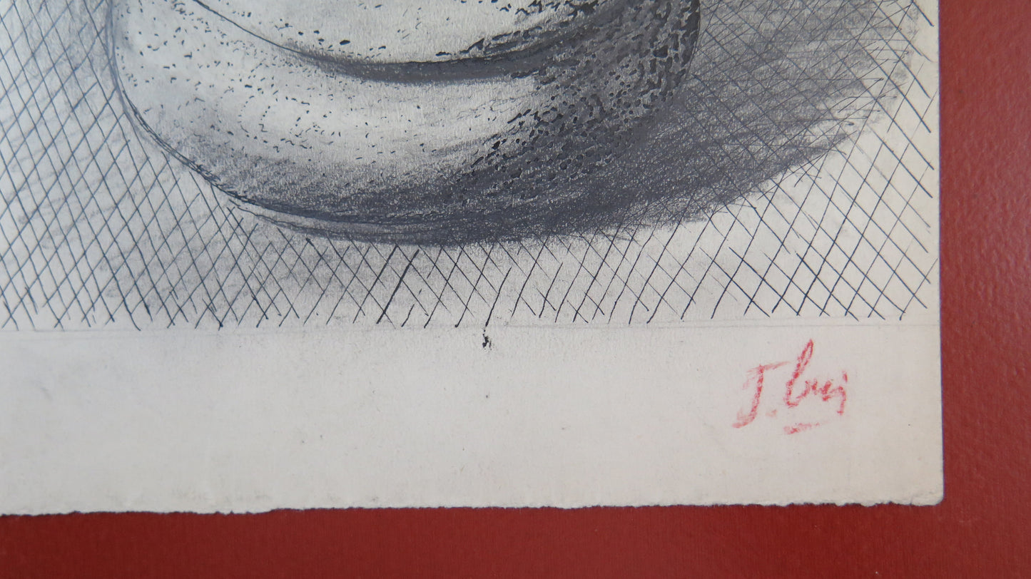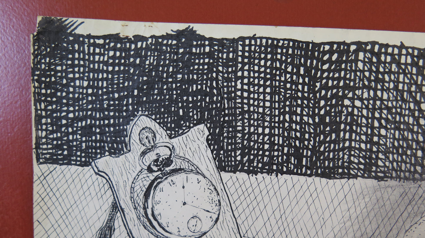 Raffinato disegno a china con oggetti su un tavolo firmato in basso a destra.