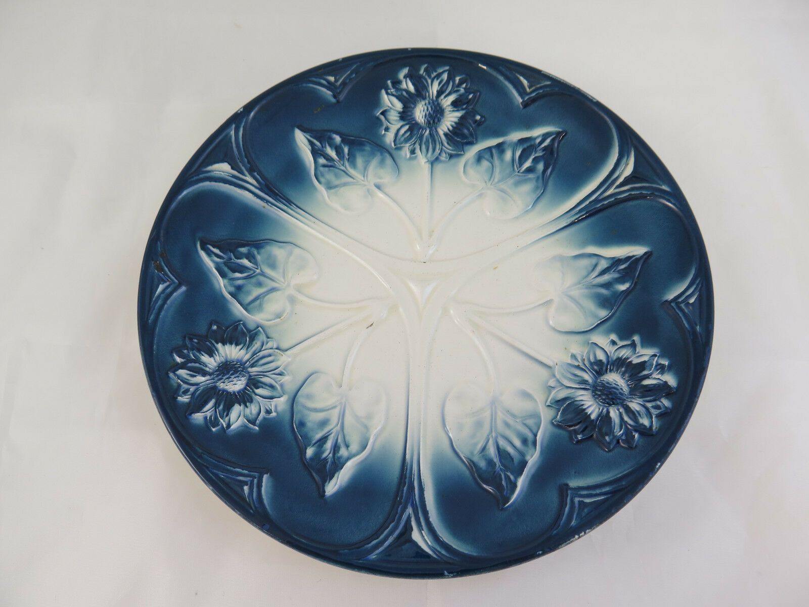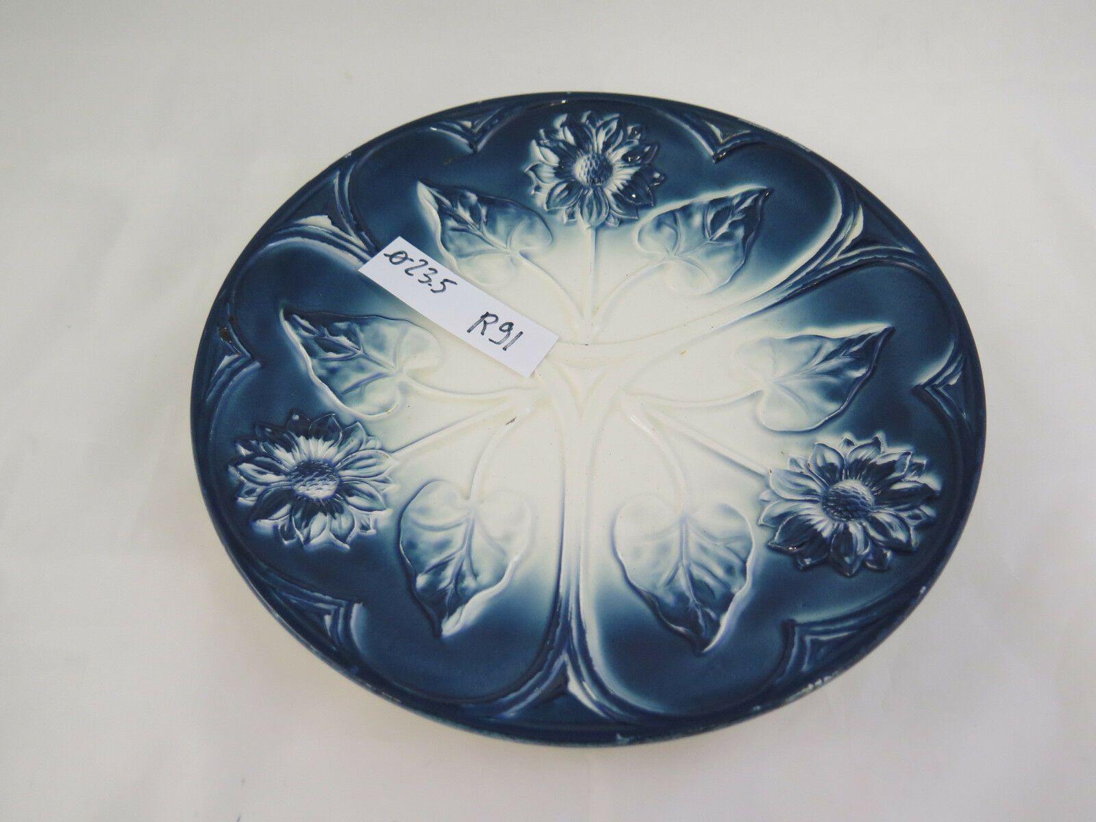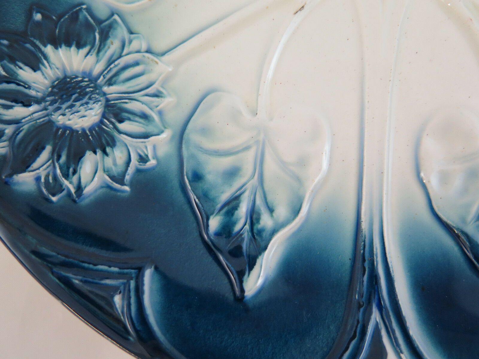 Elegante piatto in ceramica art nouveau con decorazioni floreali a rilievo bianco/blu, marchiato 23h sul fondo.
