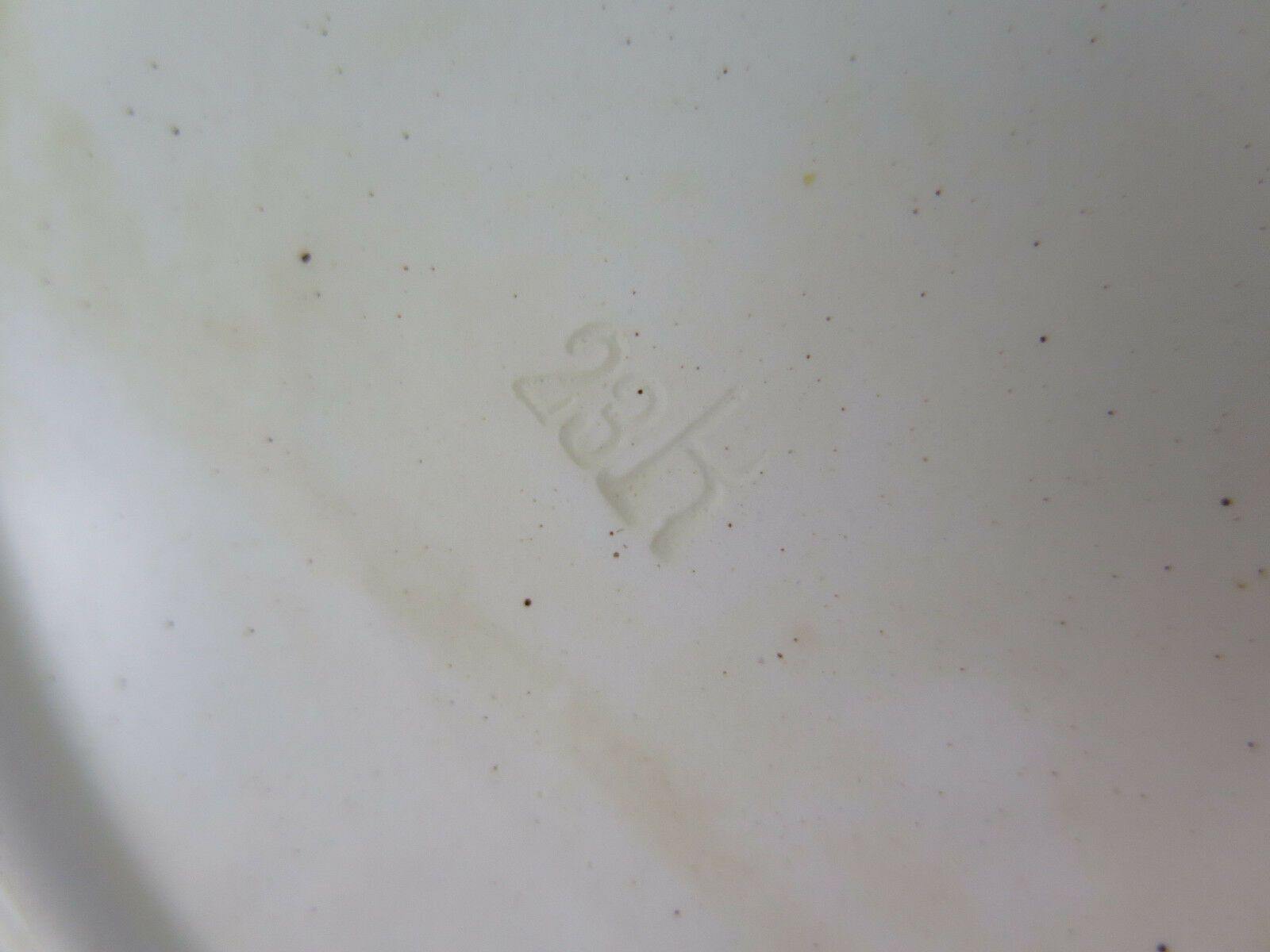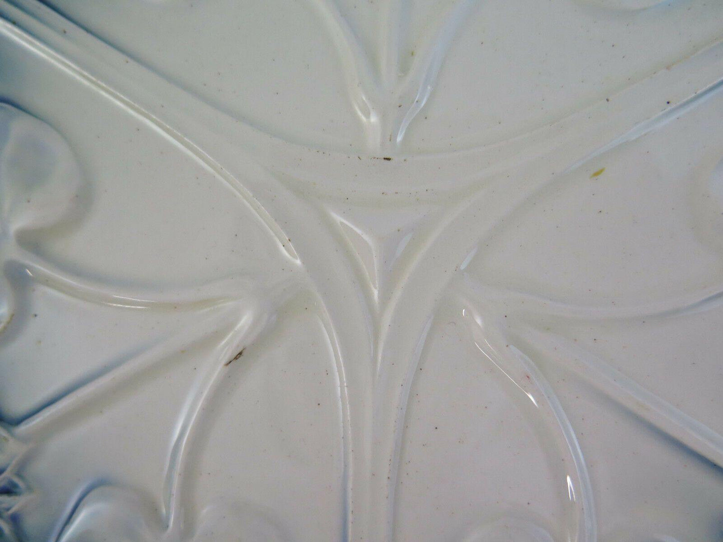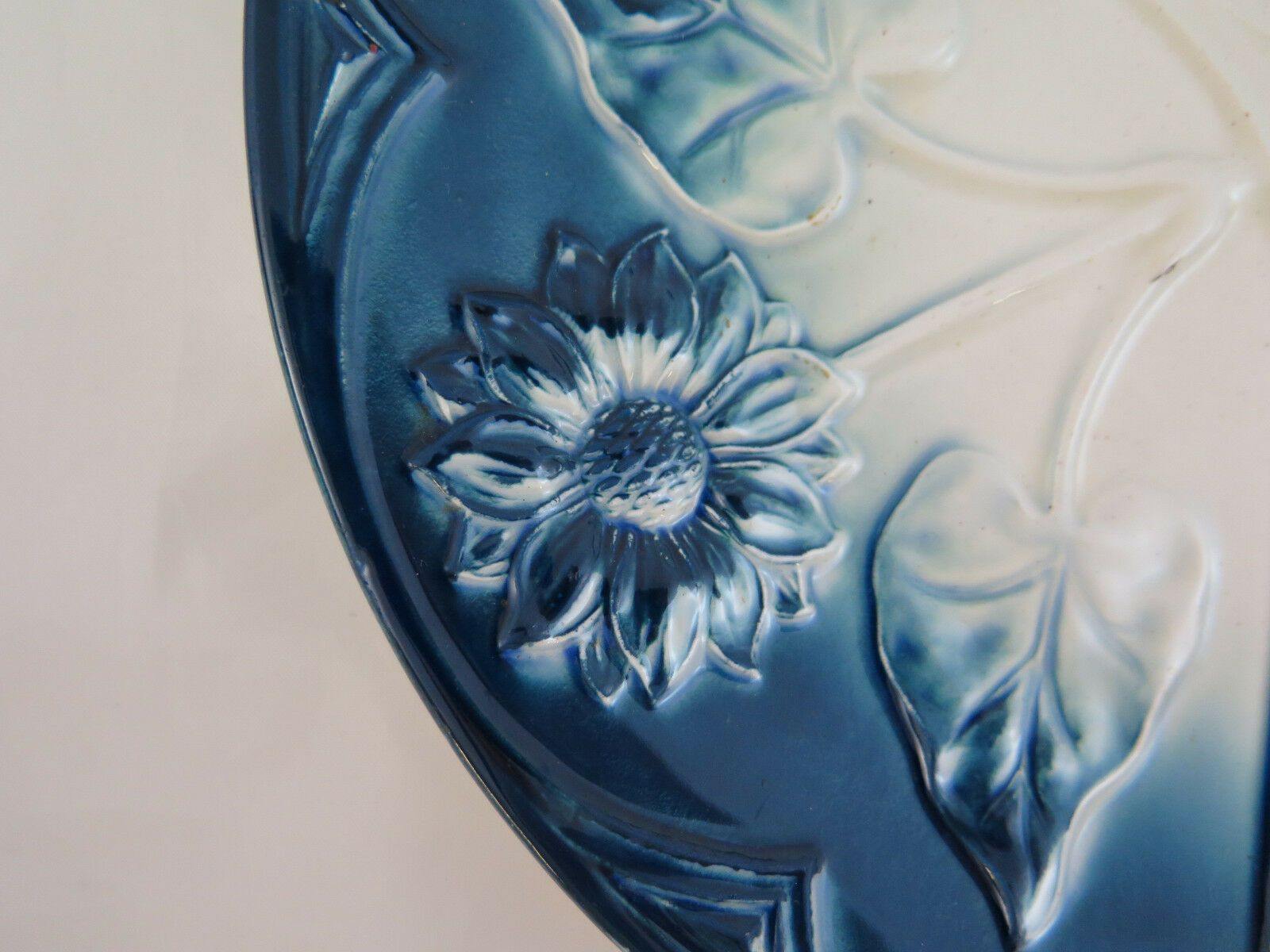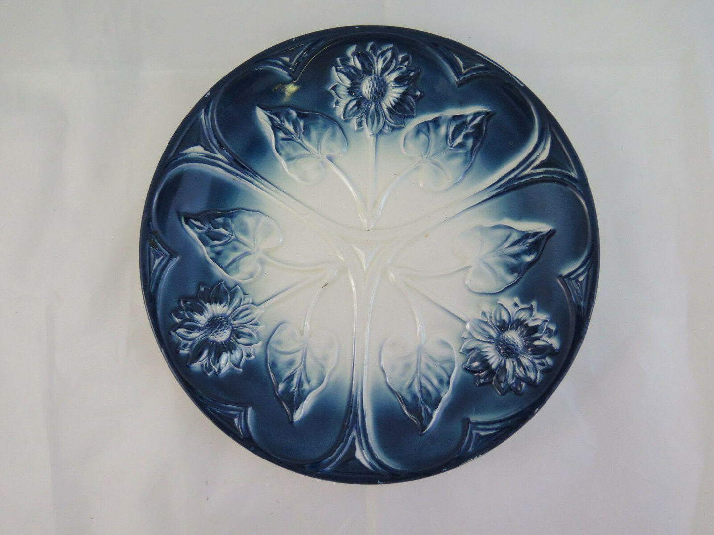 Elegante piatto in ceramica art nouveau con decorazioni floreali a rilievo bianco/blu, marchiato 23h sul fondo.