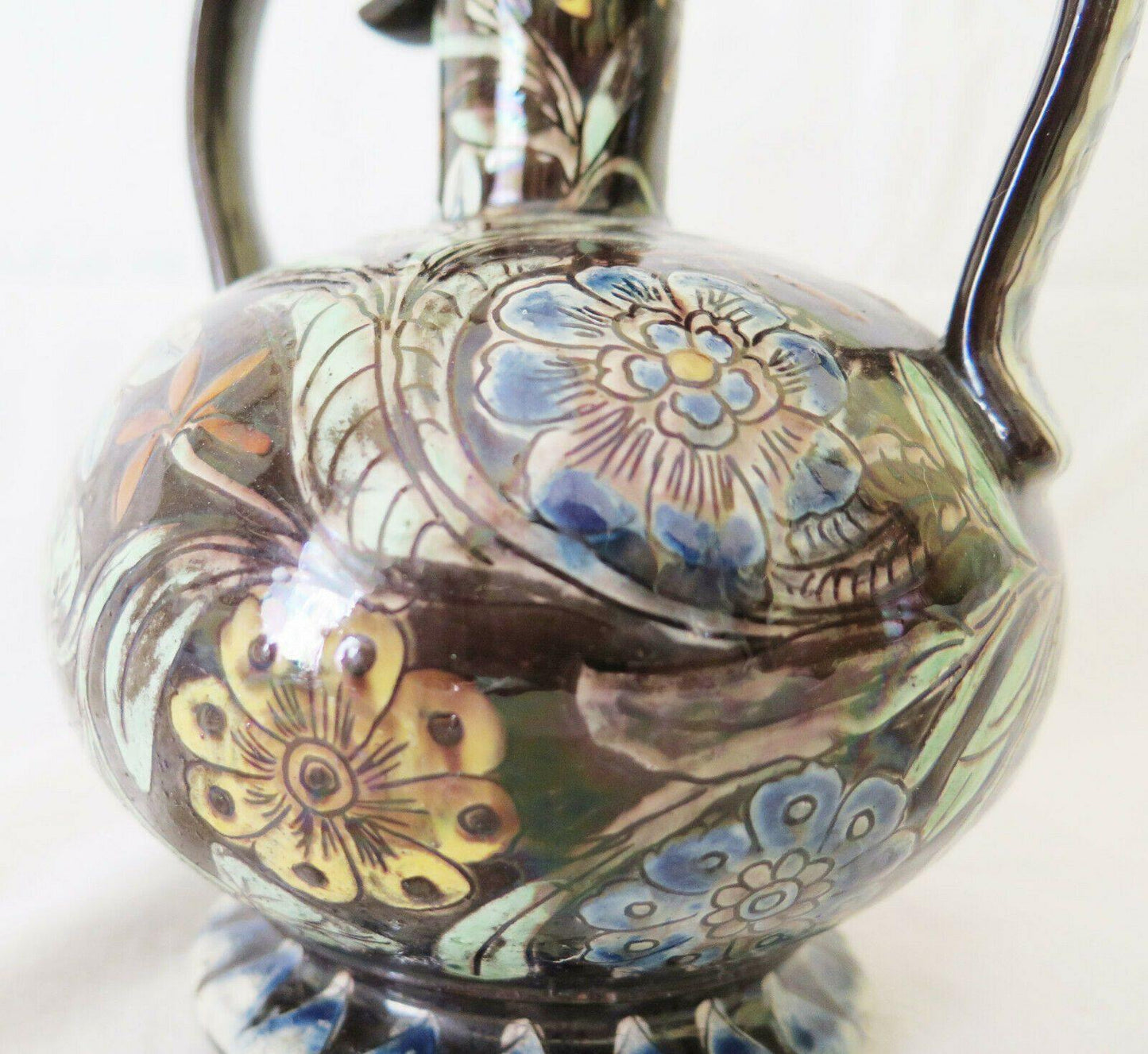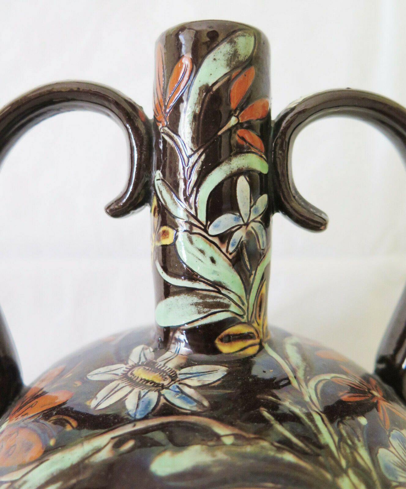 Antico vaso in ceramica dal brillante smalto dipinta a mano con motivi floreali arricchito con ampi manici a voluta.