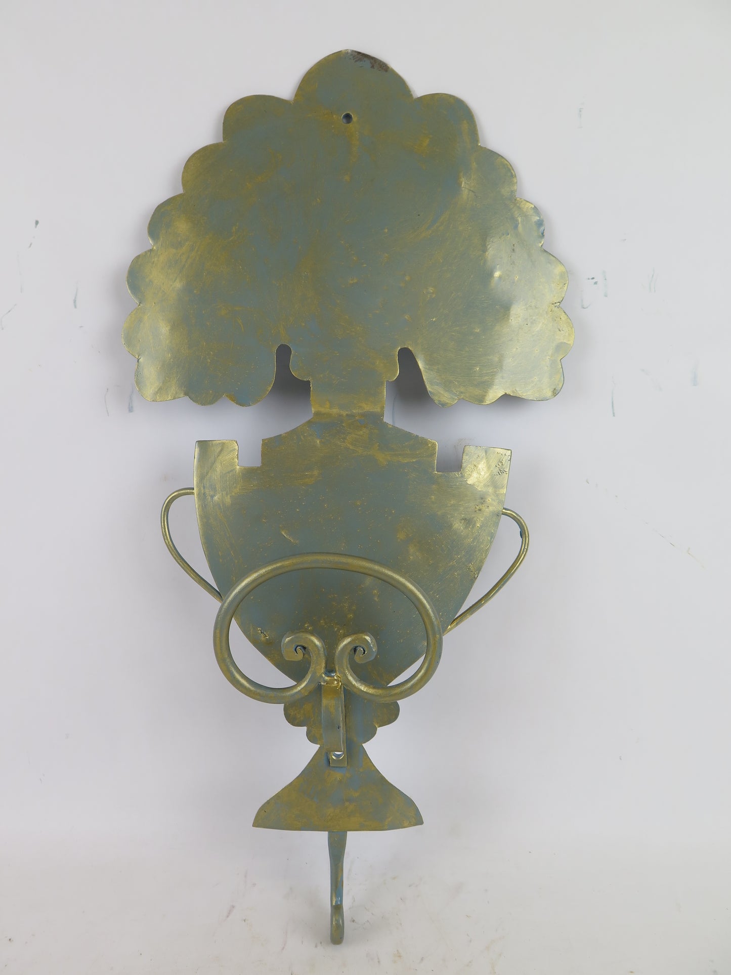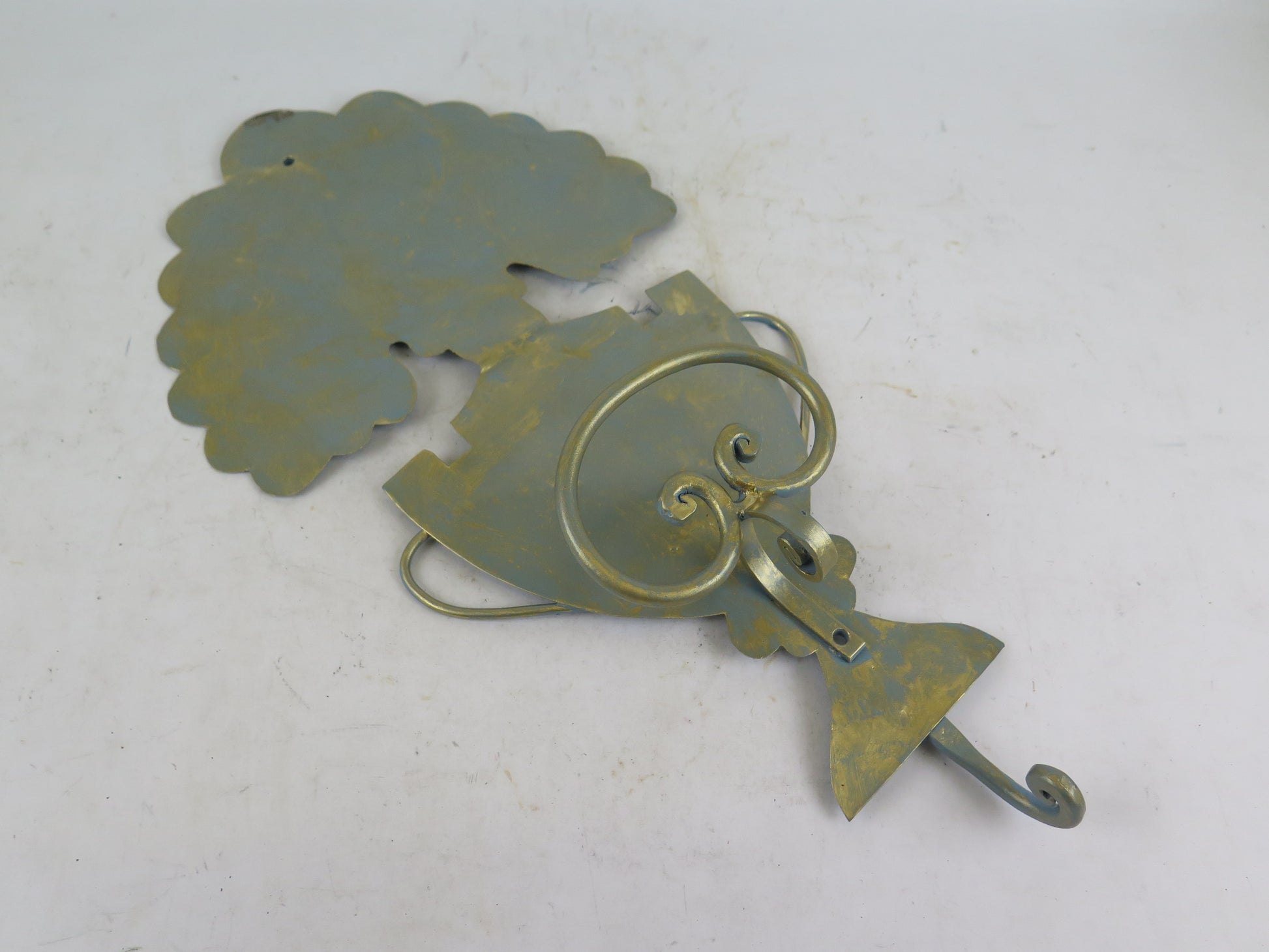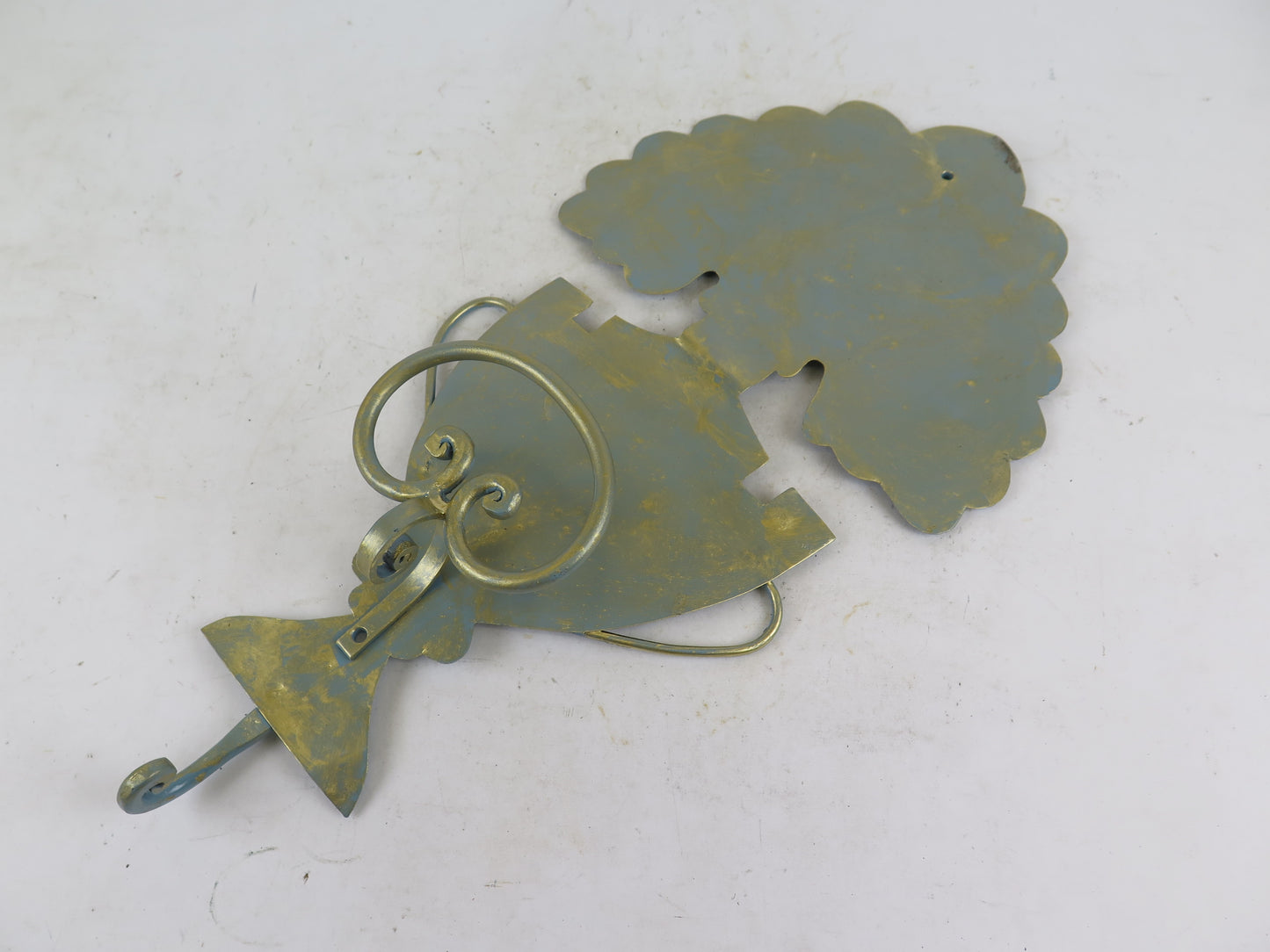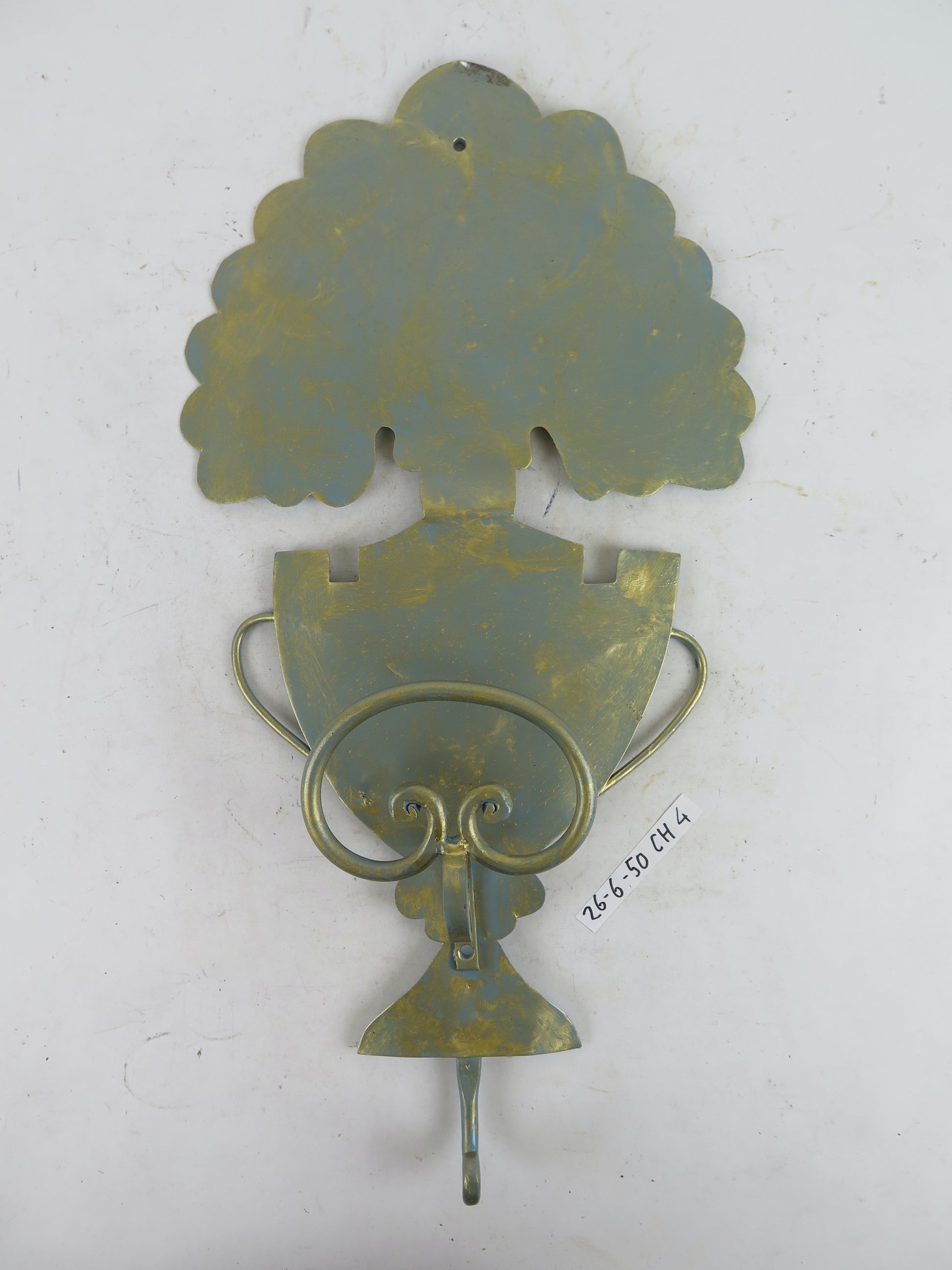 Elegante attaccapanni da parete in ferro battuto con un gancio arricchito da un medaglione centrale a forma di vaso con fiori.