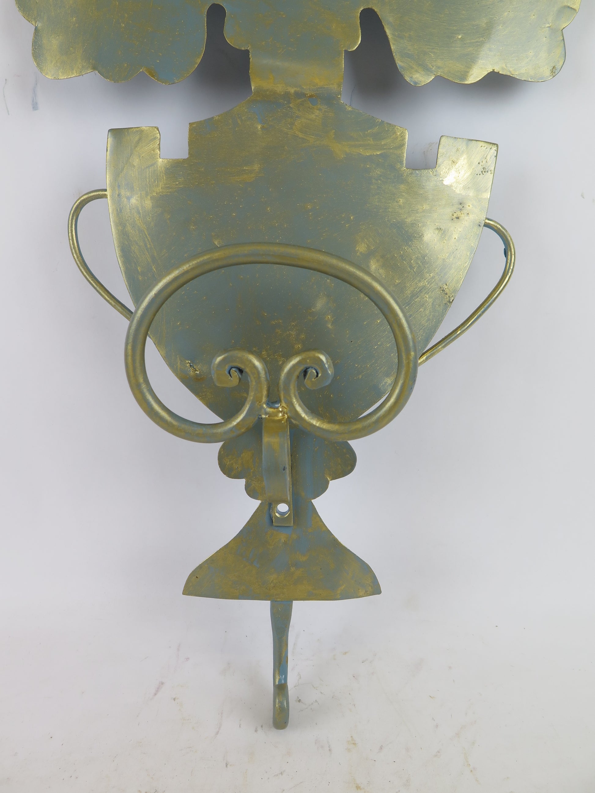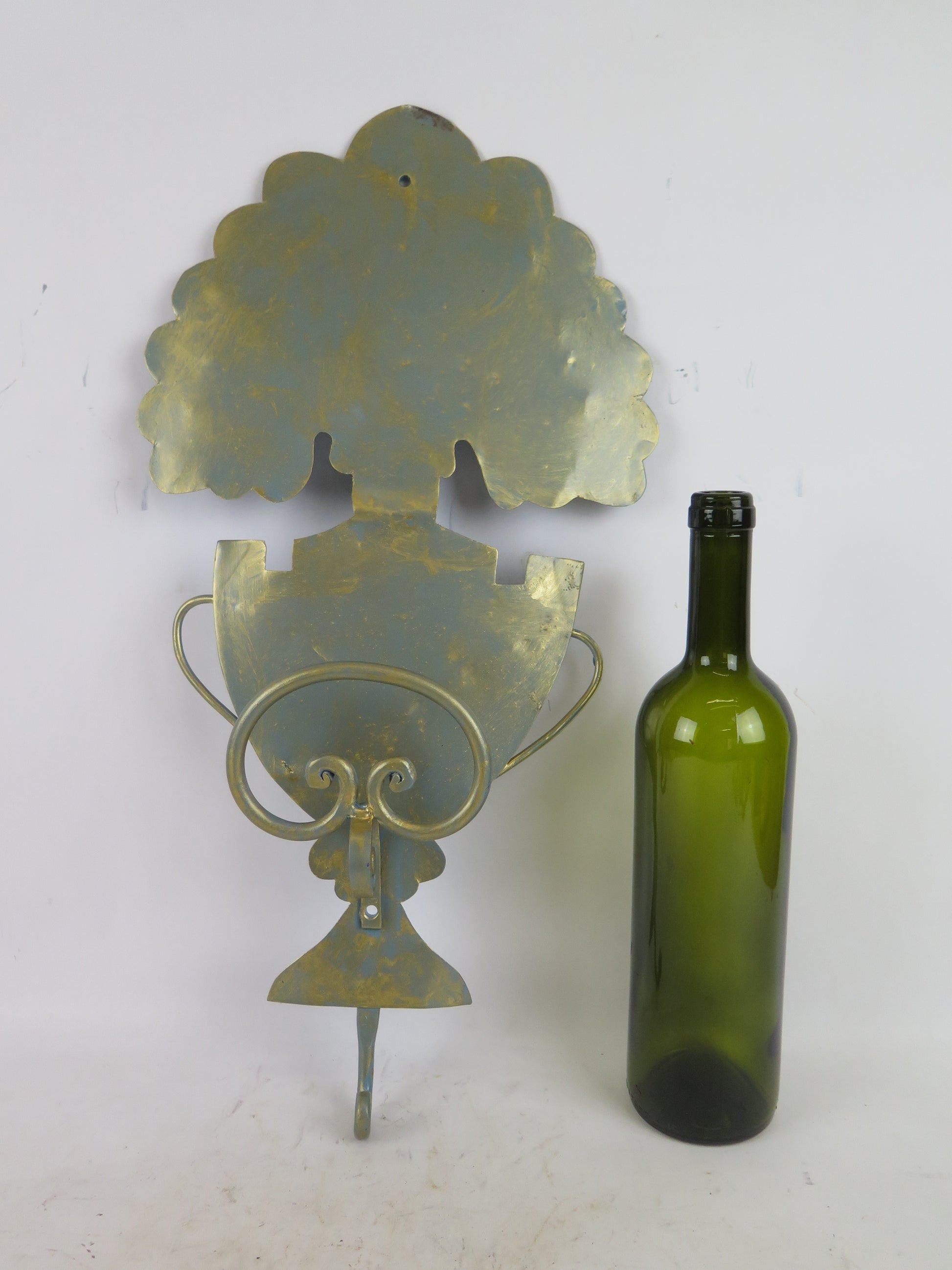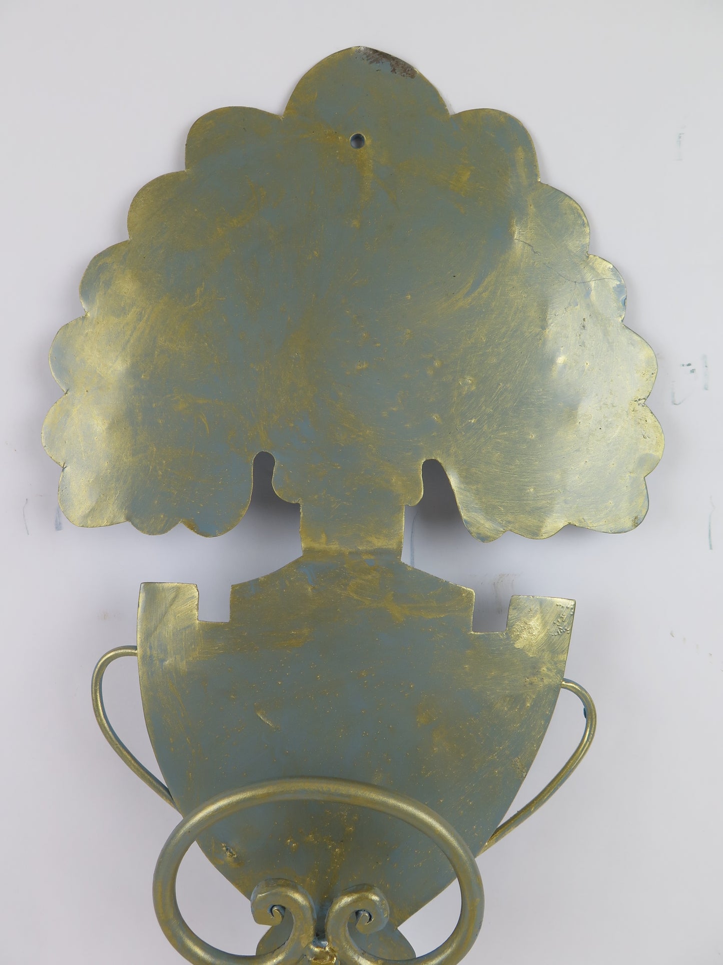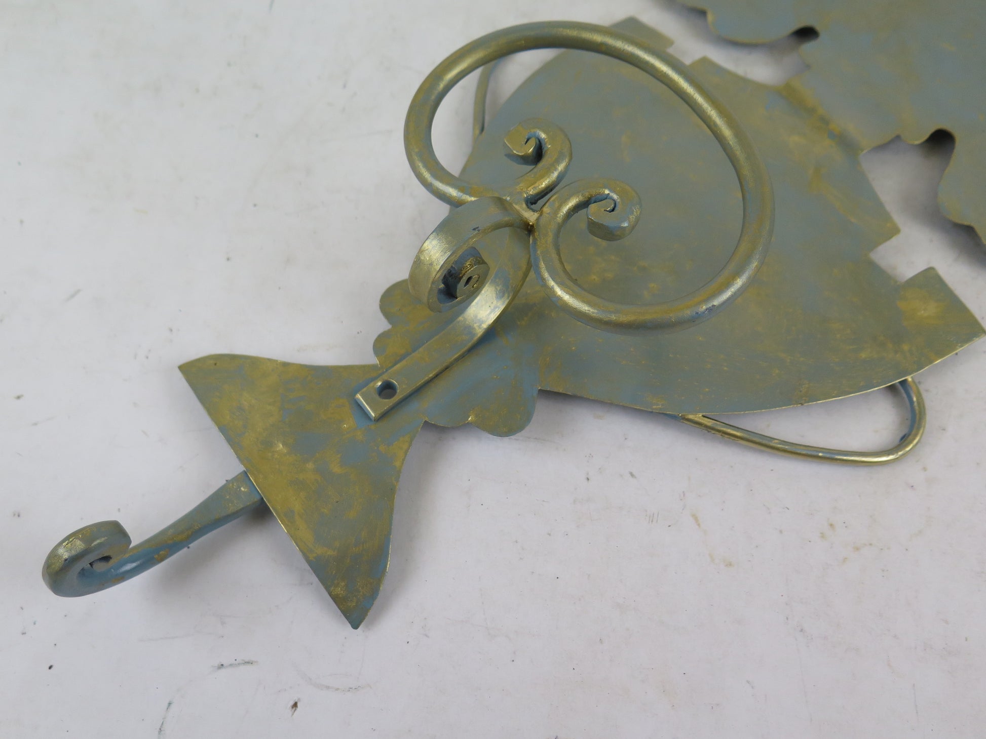 Elegante attaccapanni da parete in ferro battuto con un gancio arricchito da un medaglione centrale a forma di vaso con fiori.