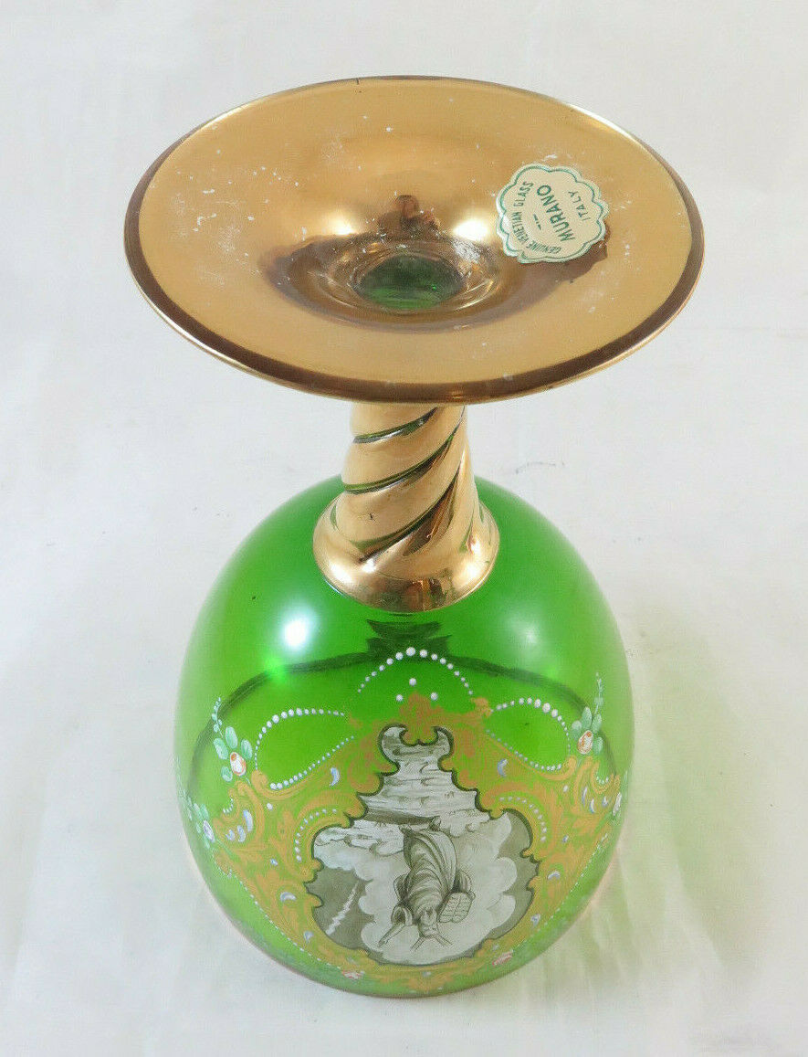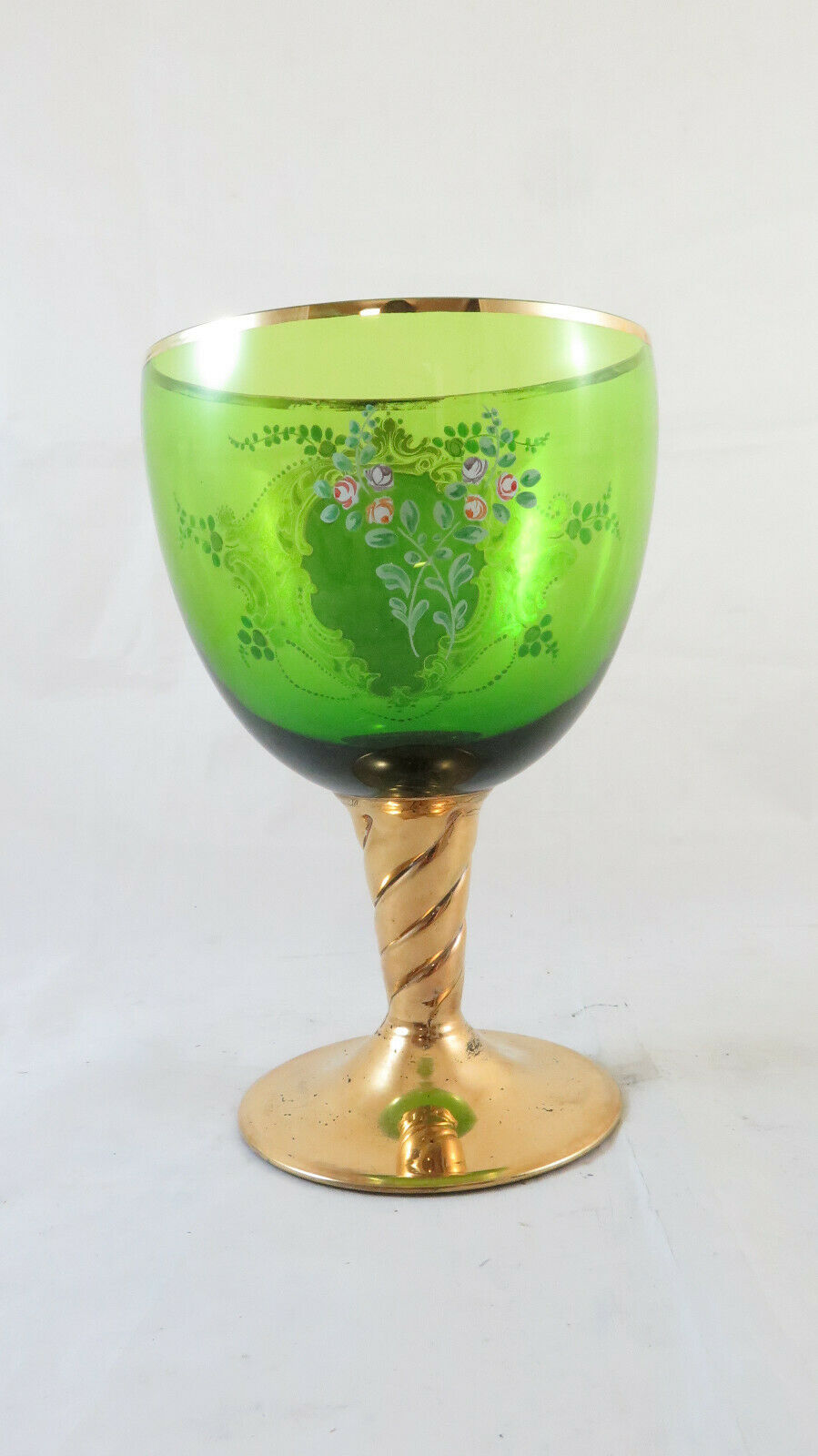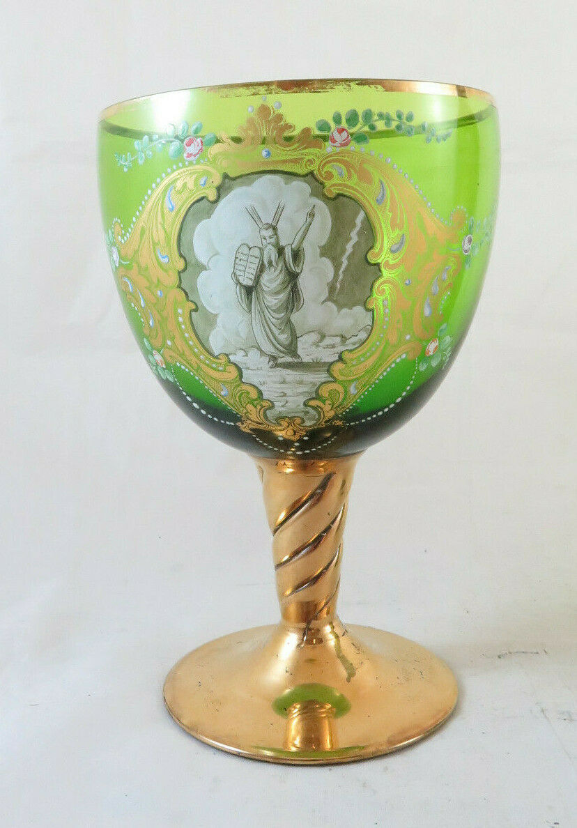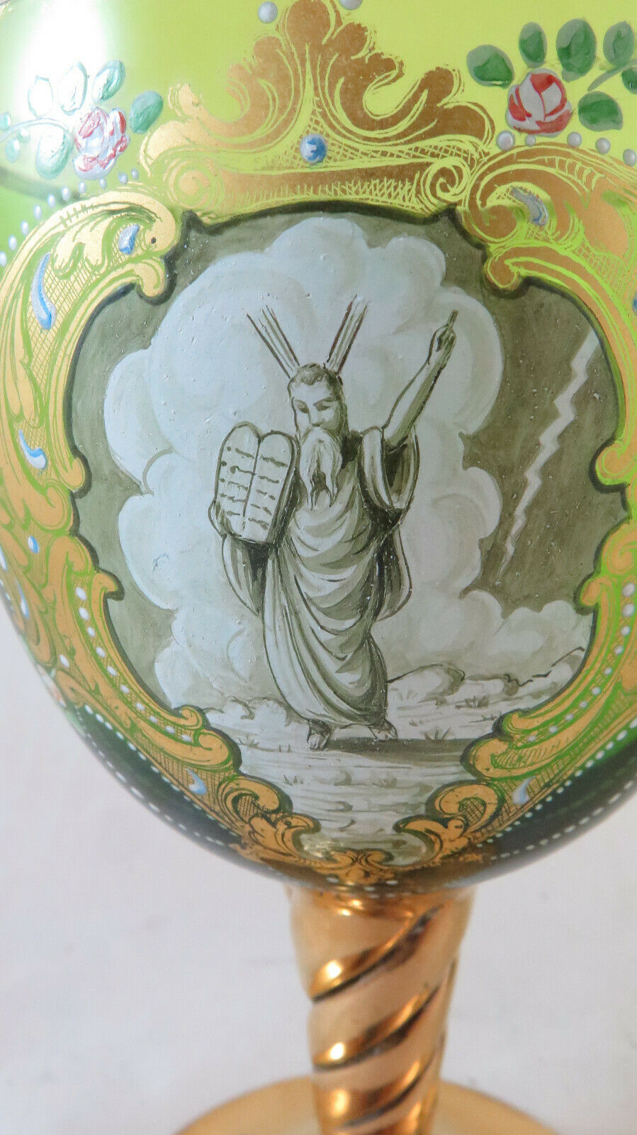 Elegante calice in vetro di Murano verde con gambo dorato tortile dipinto a mano con motivi floreali e la figura di Mosè con in mano le tavole.