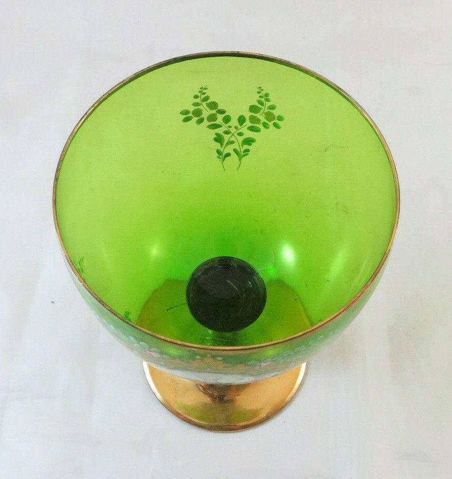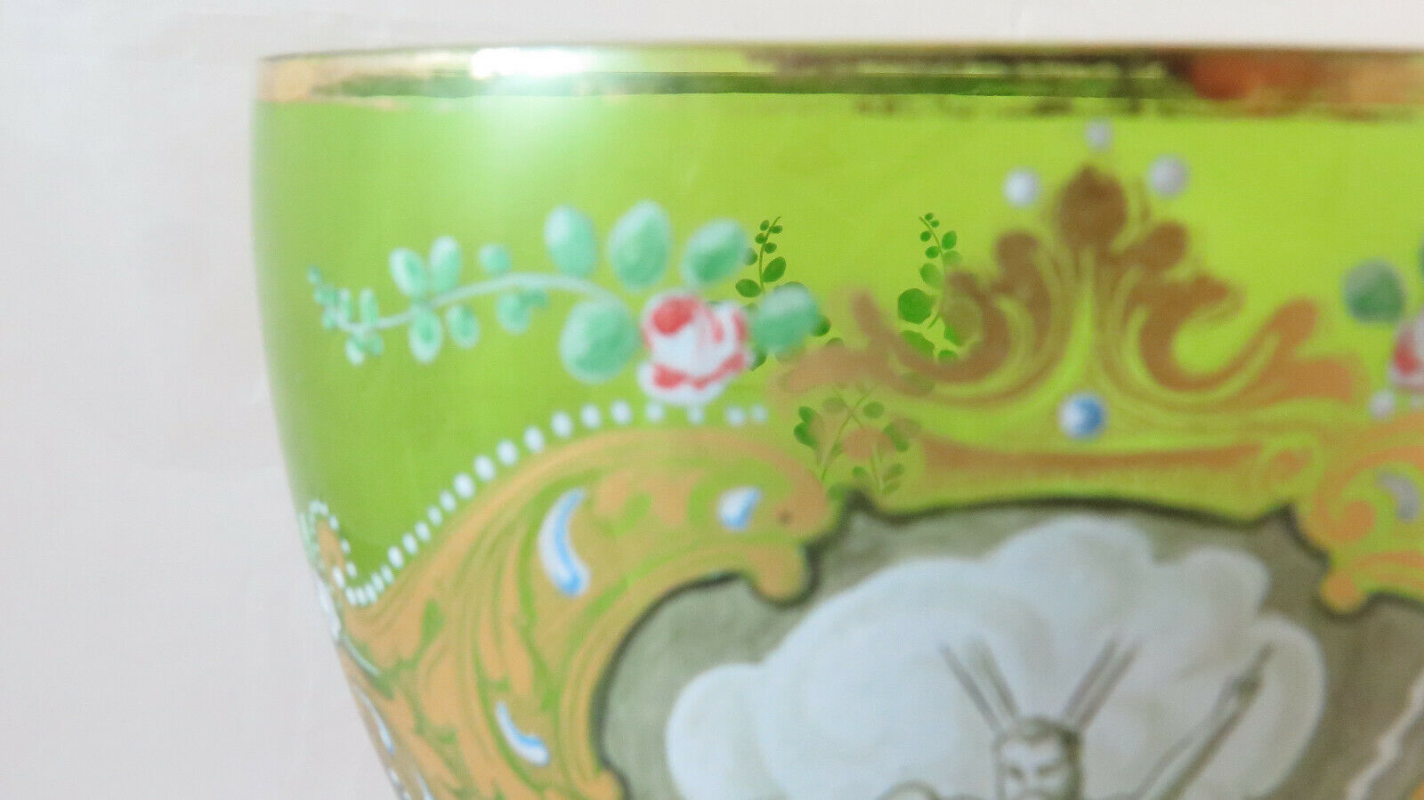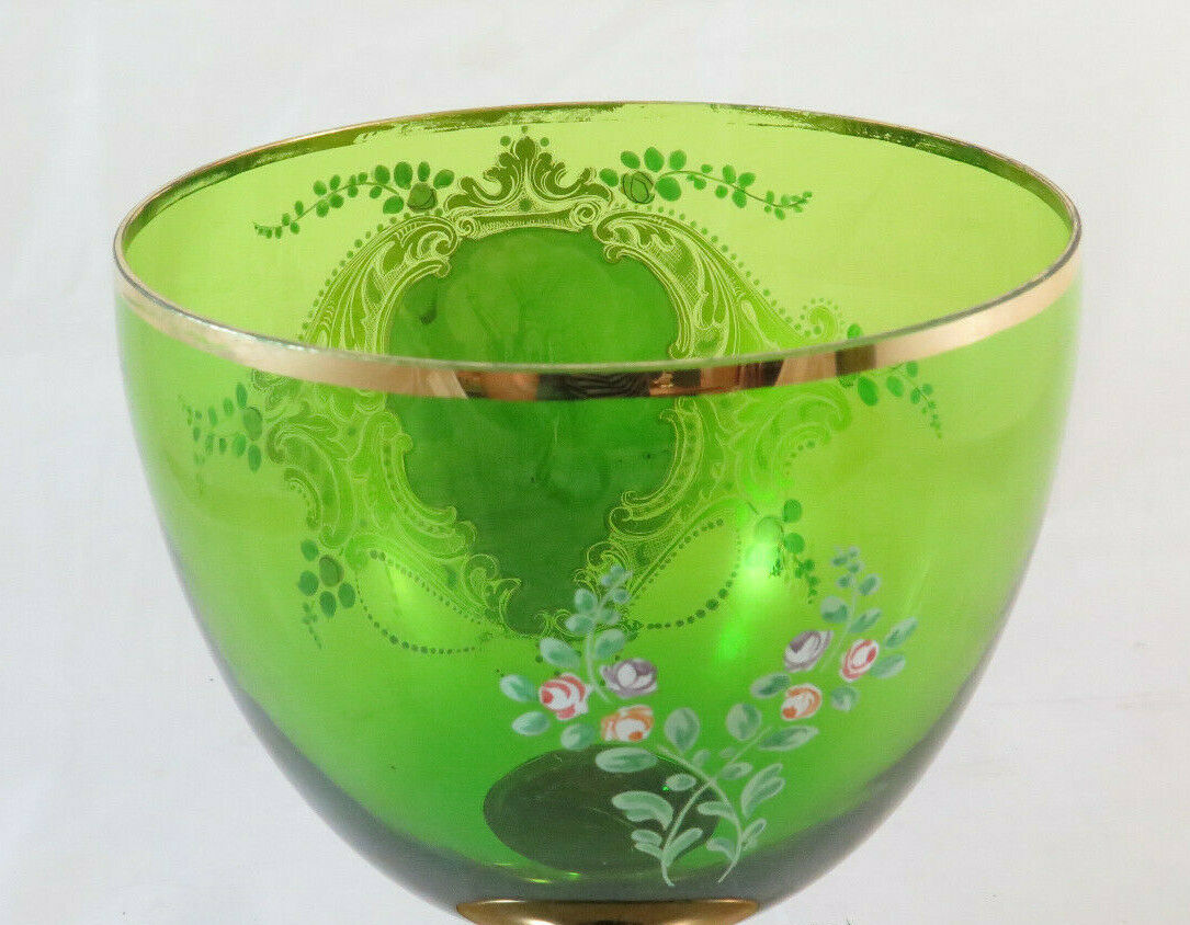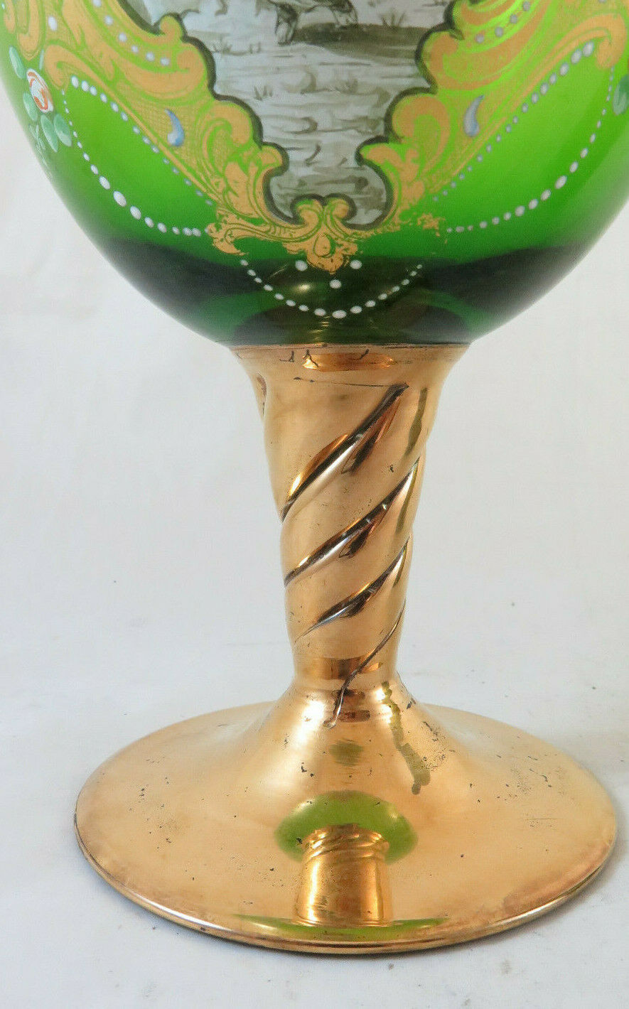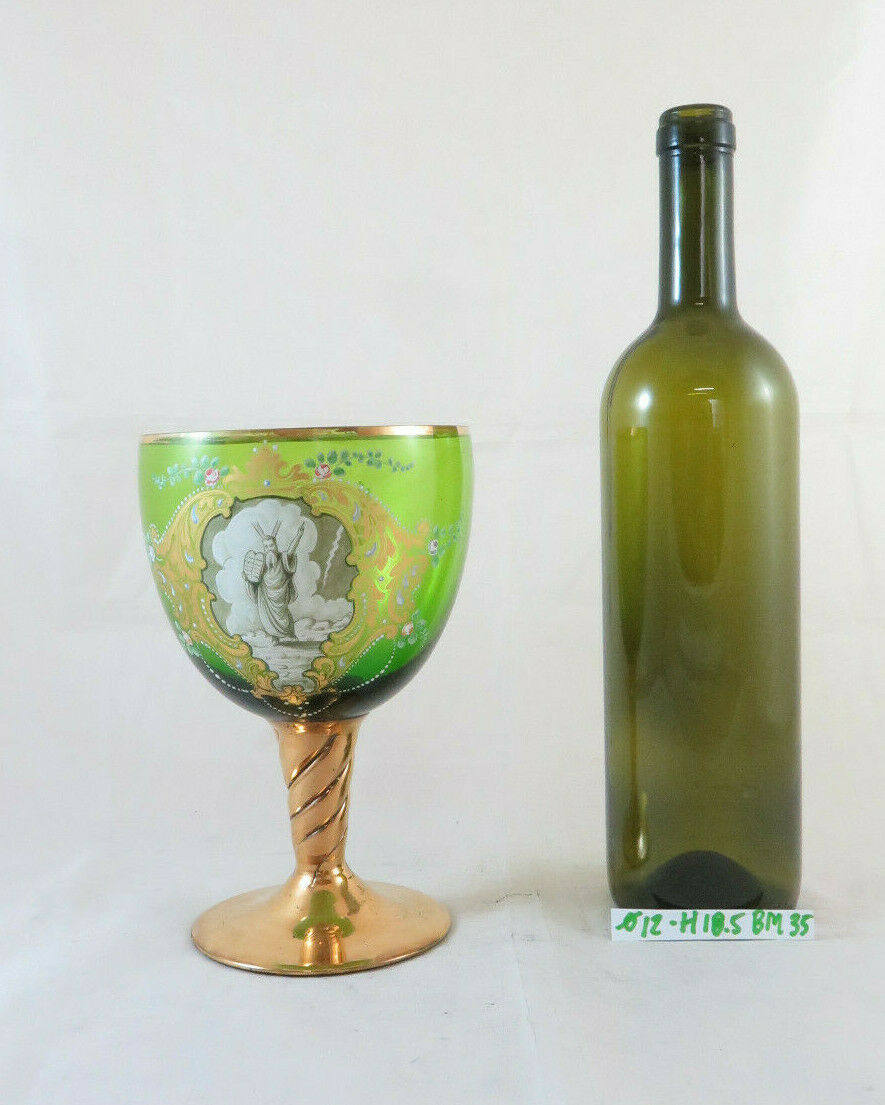 Elegante calice in vetro di Murano verde con gambo dorato tortile dipinto a mano con motivi floreali e la figura di Mosè con in mano le tavole.