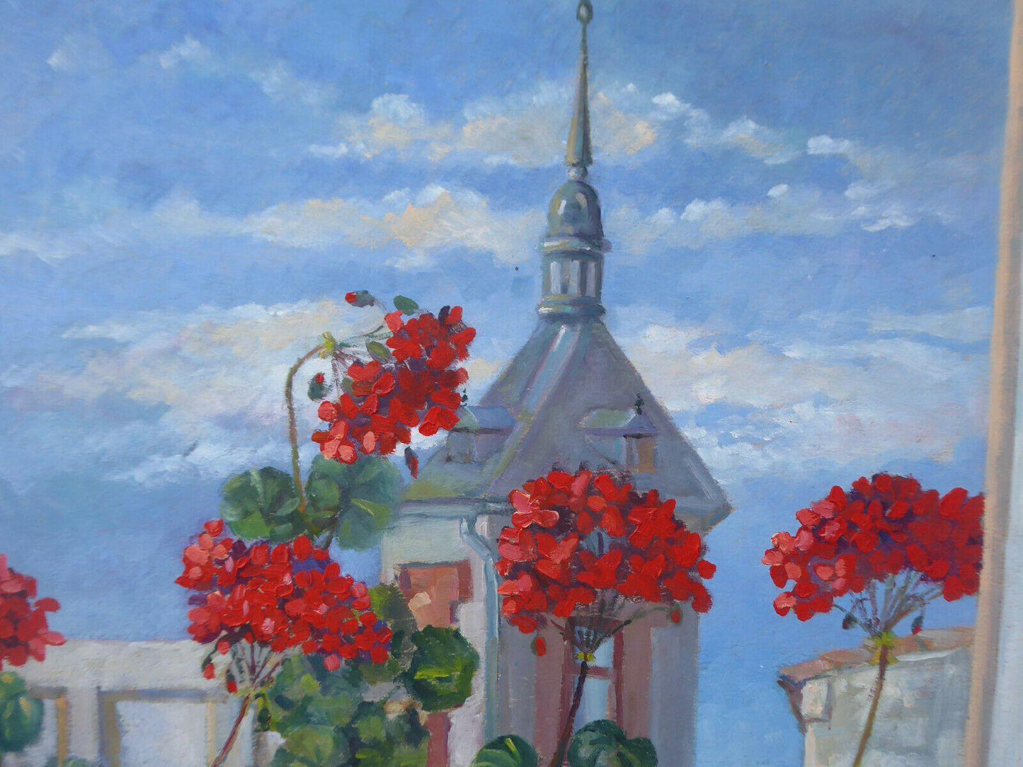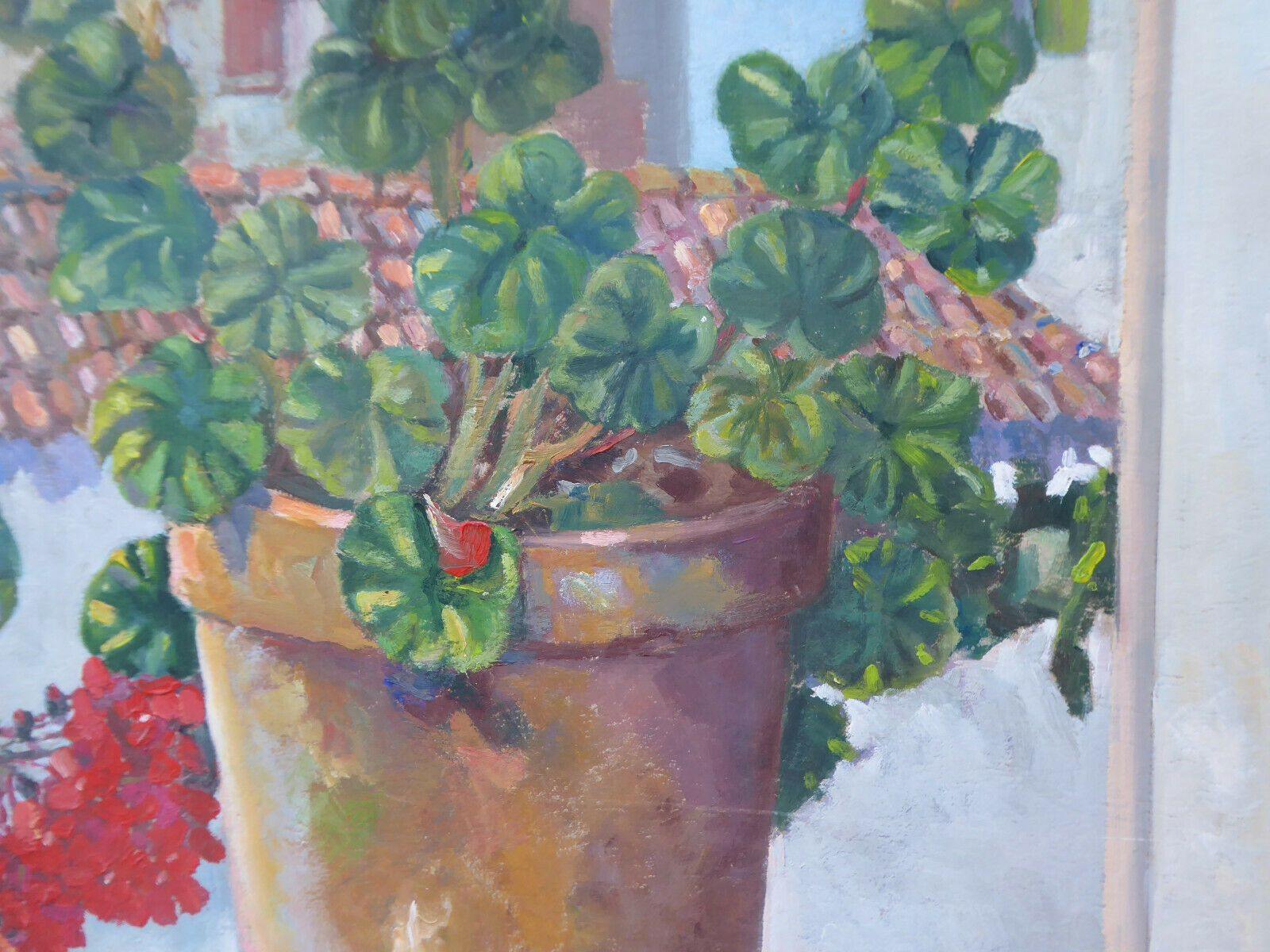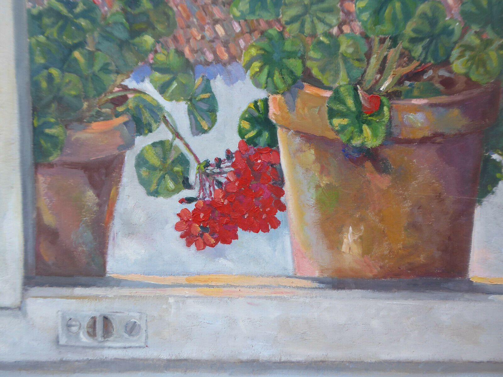 Luminosa veduta dalla finestra convaso di gerani in primo piano.