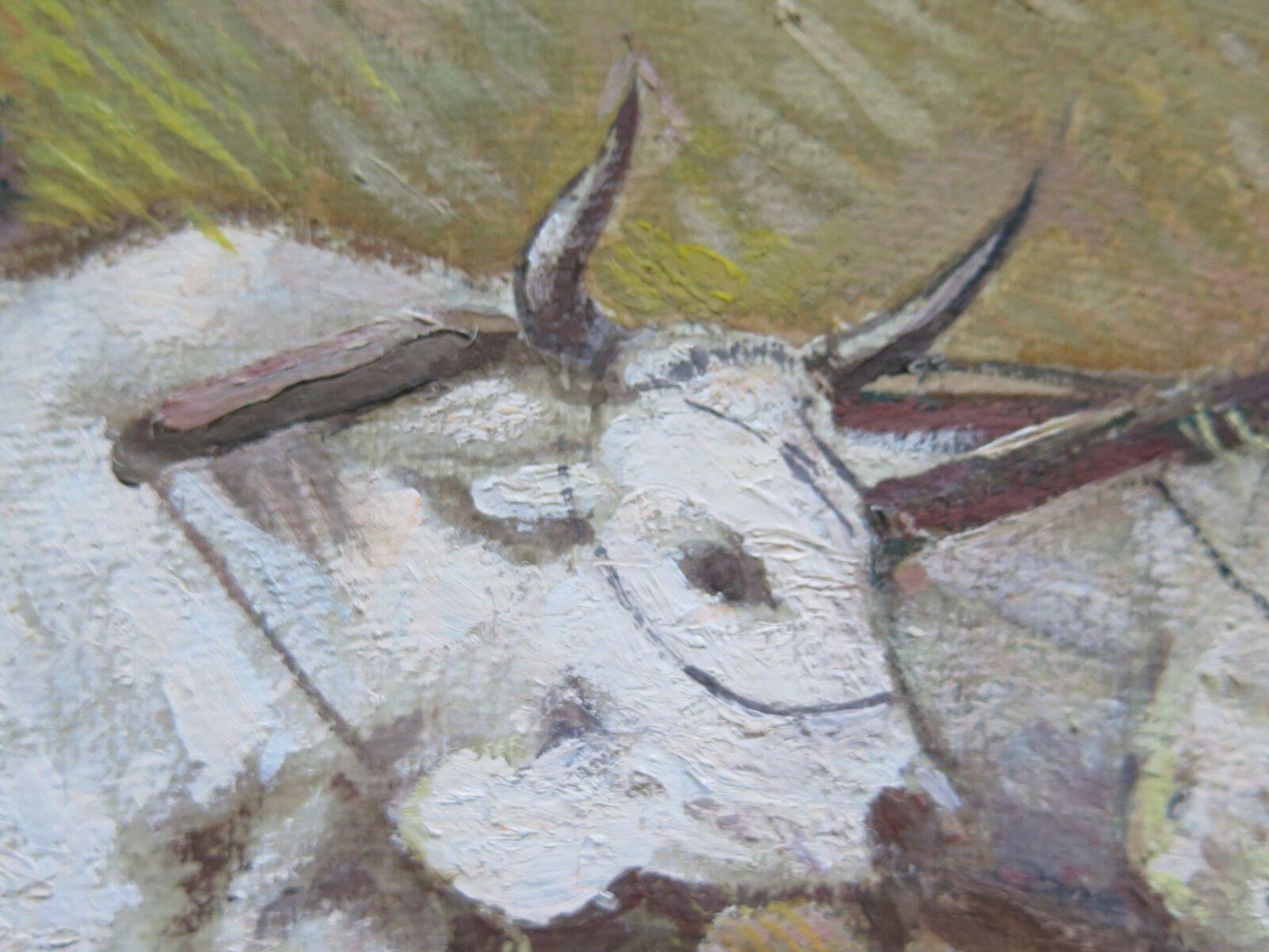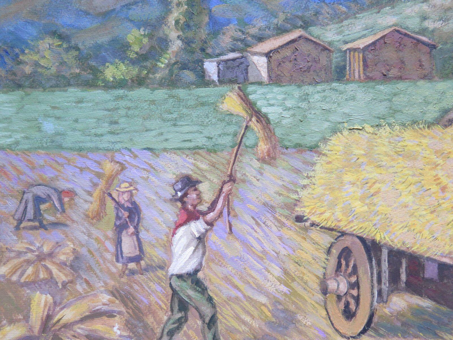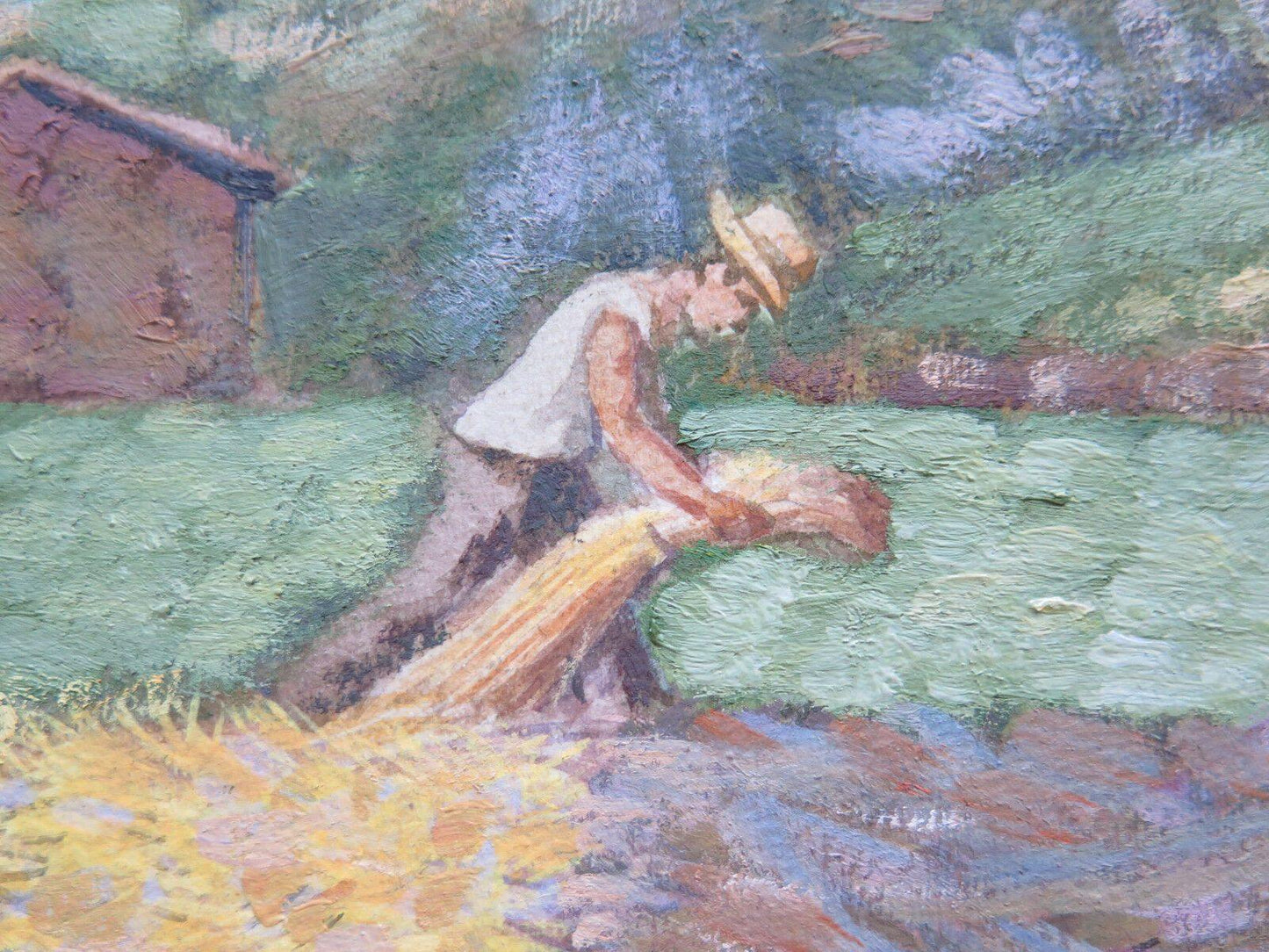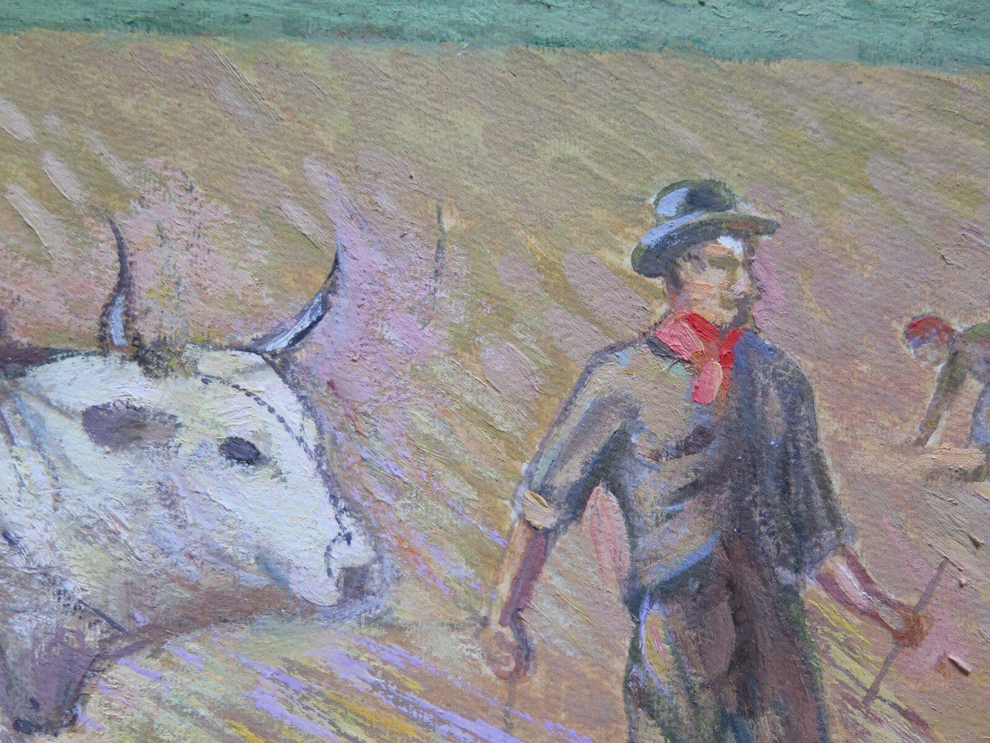 Soggetto: scena di vita campestre con animali e contadini al lavoro dalle fini pennellate in stile impressionista.
