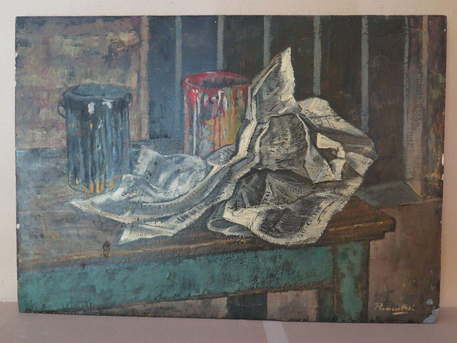 Fine dipinto ad olio su tavola realizzato dal pittore modenese Gaetano Pancaldi durante la seconda metà del '900, il lavoro in questione è un interno dello studio del pittore con gli strumenti del mestiere.
