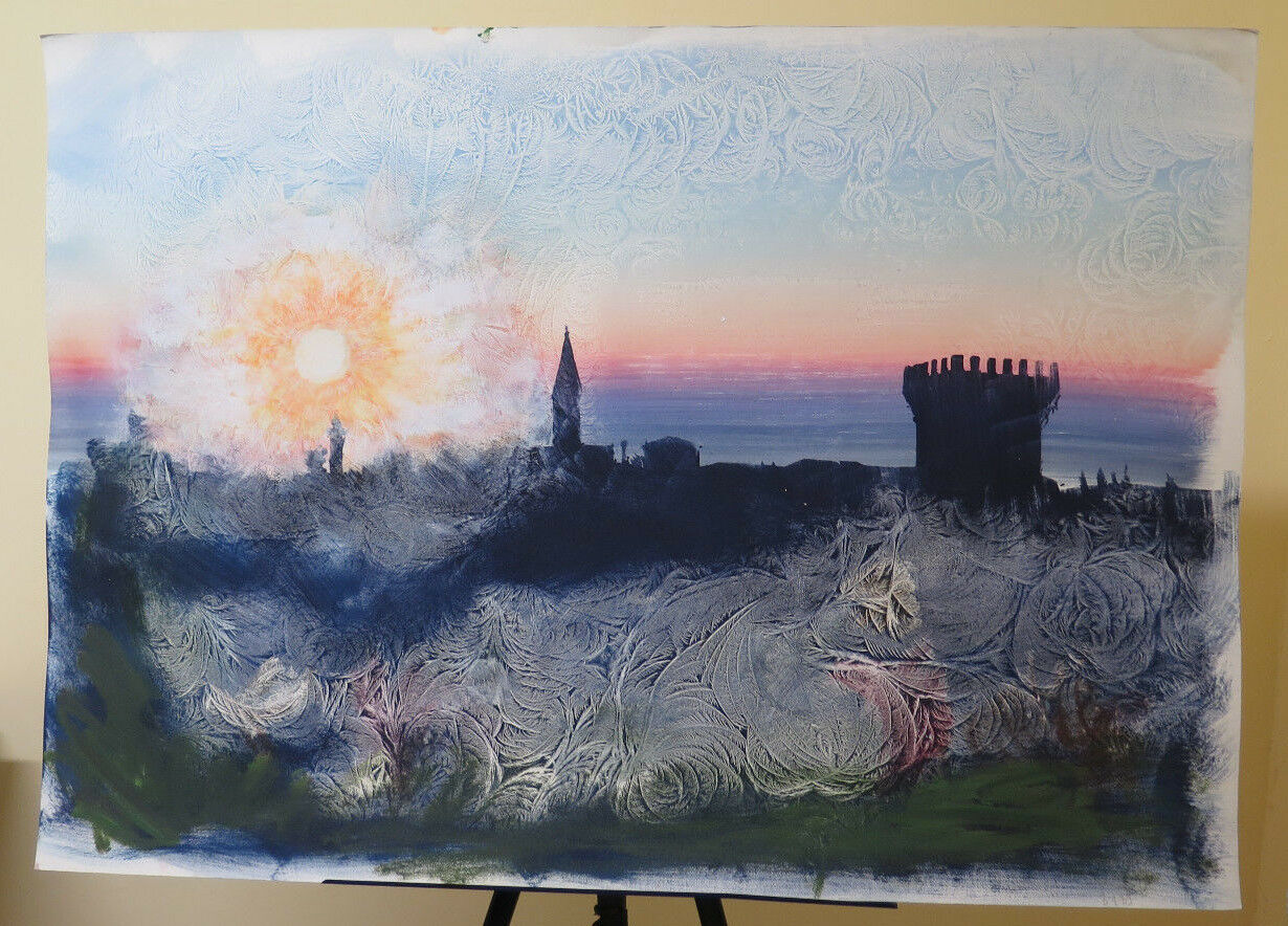 Soggetto: scorcio di Piumazzo di Castelfranco Emlia all'imbrunire, paese natale dell'autore, in chiave pop.