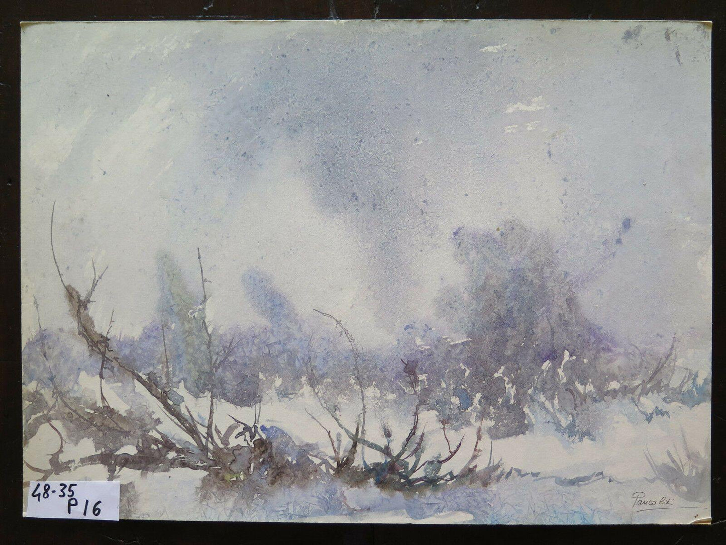 Particolare dipinto su tavola opera del pittore Gaetano Pancaldi (1922-2014) di Piumazzo di Castelfranco Emilia in cui viene raffigurato un paesaggio invernale con la tecnica del "gelo" elaborata dal pittore stesso e che consisteva nel collocare al freddo il dipinto appena realizzato in modo da ottenere un effetto simile al ghiaccio sulla superficie pittorica.