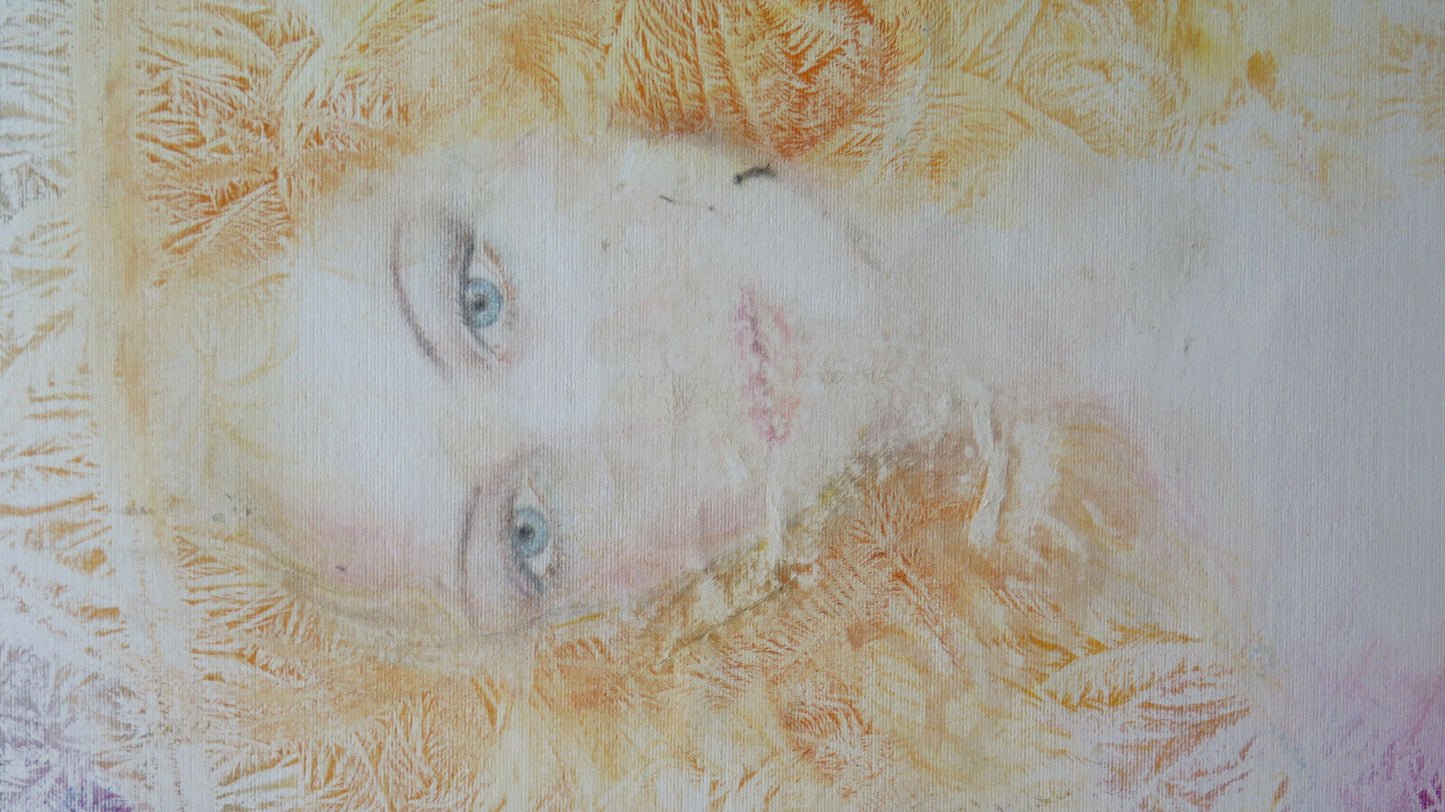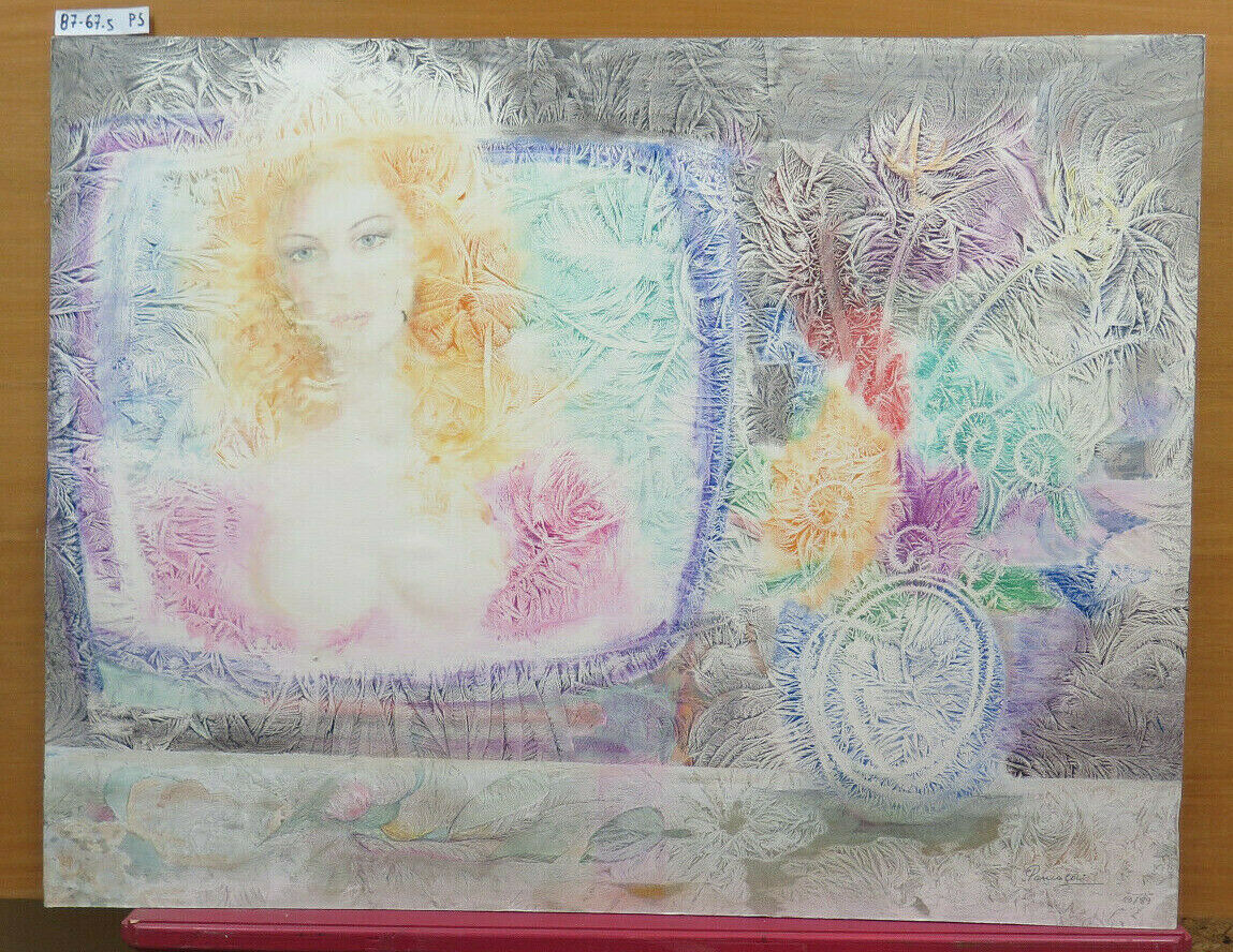 Subject: portrait of a lady coming out a tv set, signed "Pancaldi".