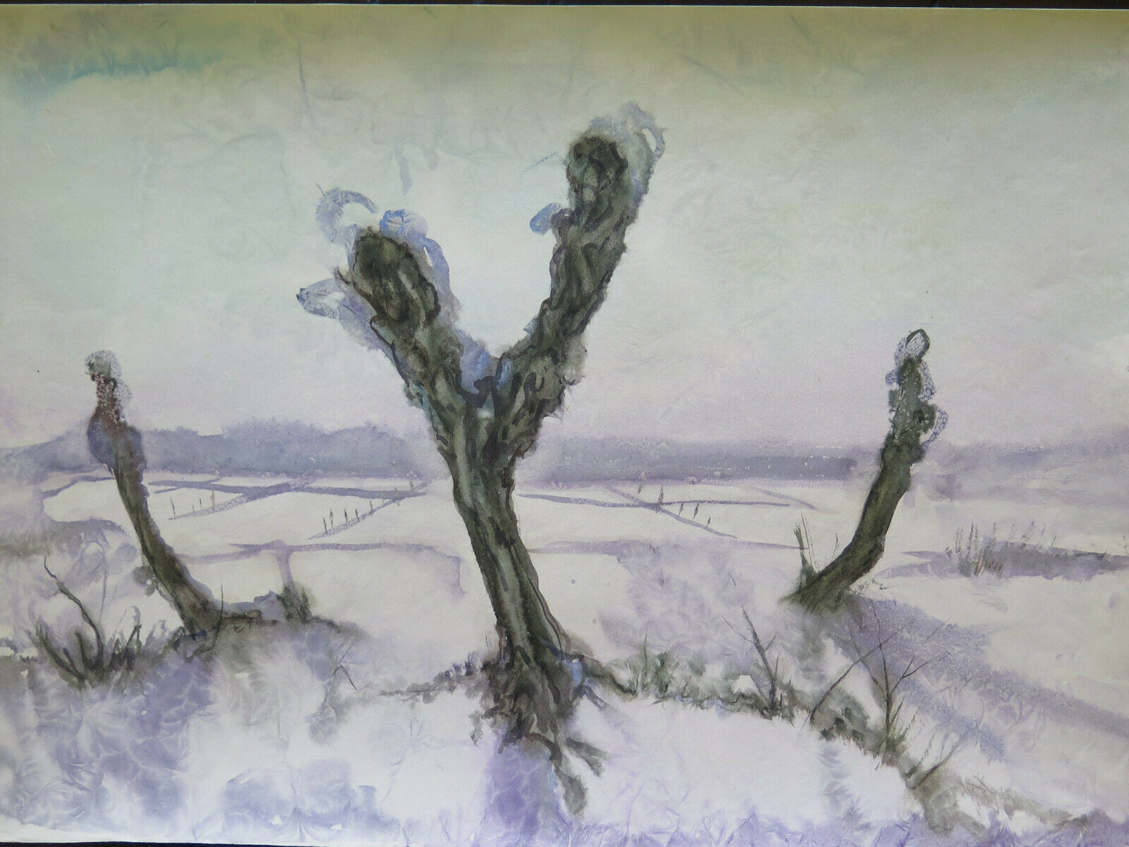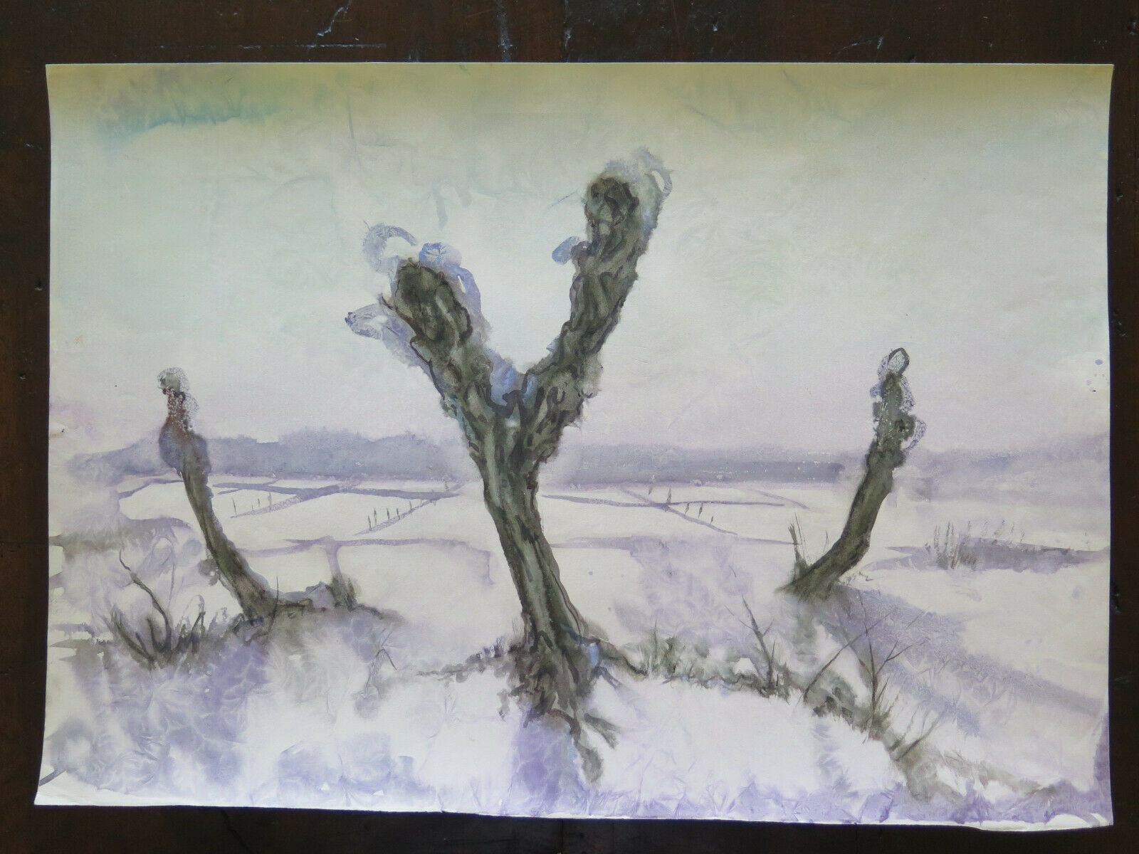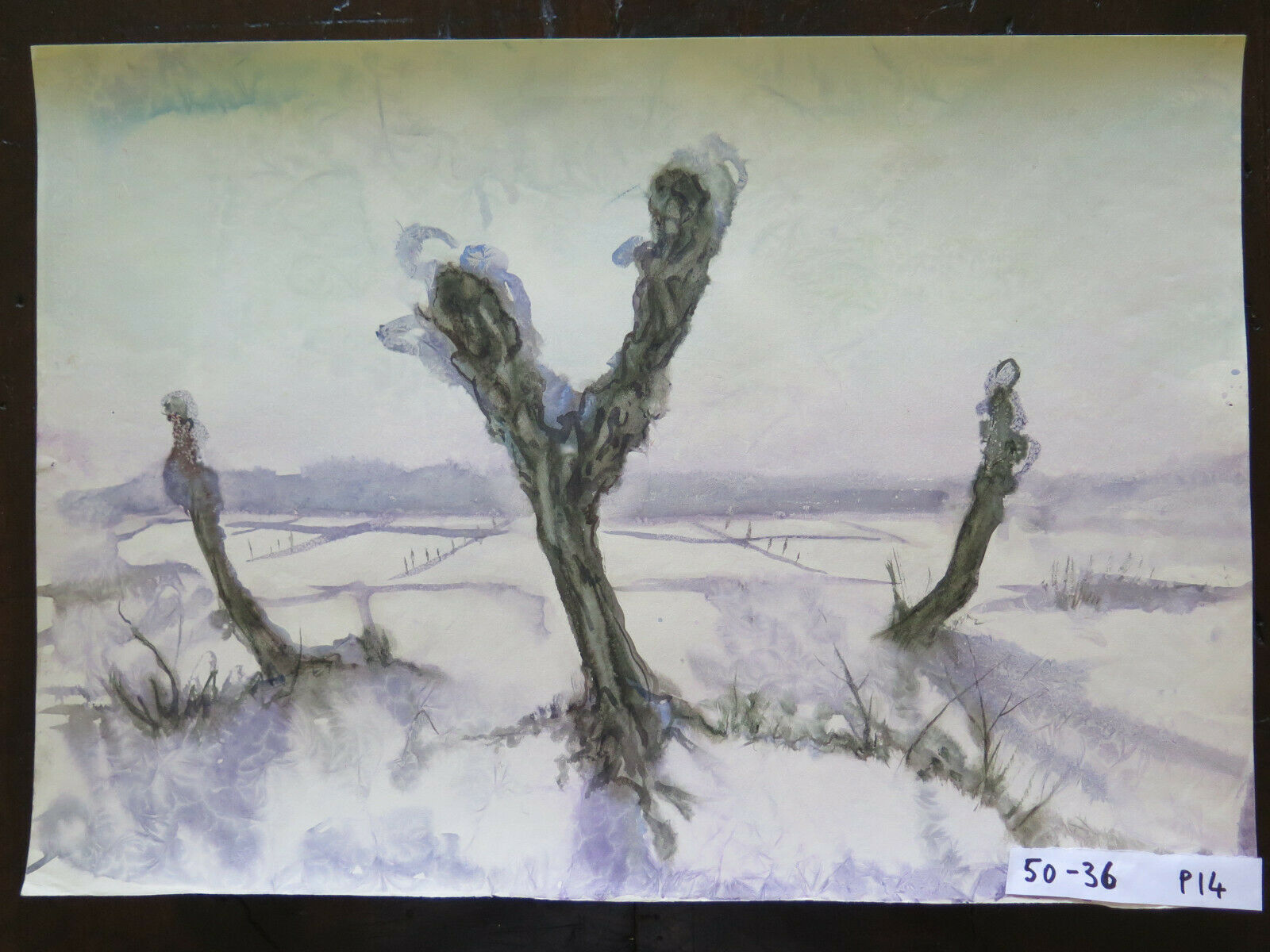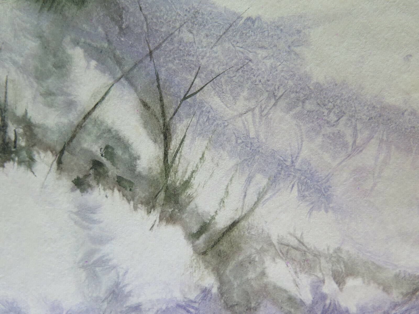 Supporto e tecnica: acquerello su cartoncino. Realizzato con la "tecnica del gelo" per ottenere l'effetto ghiaccio in alcuni aree della superficie pittorica, tale tecnica consisteva nel porre al freddo vero e proprio il dipinto ancora fresco per poi lavorarlo successivamente. Questo effetto è stato creato dal pittore Pancaldi e ricorre in molti suoi lavori soprattutto nella fase della maturità. Autore: Gaetano Pancaldi (Piumazzo di Castelfranco Emilia, 1922-2014).