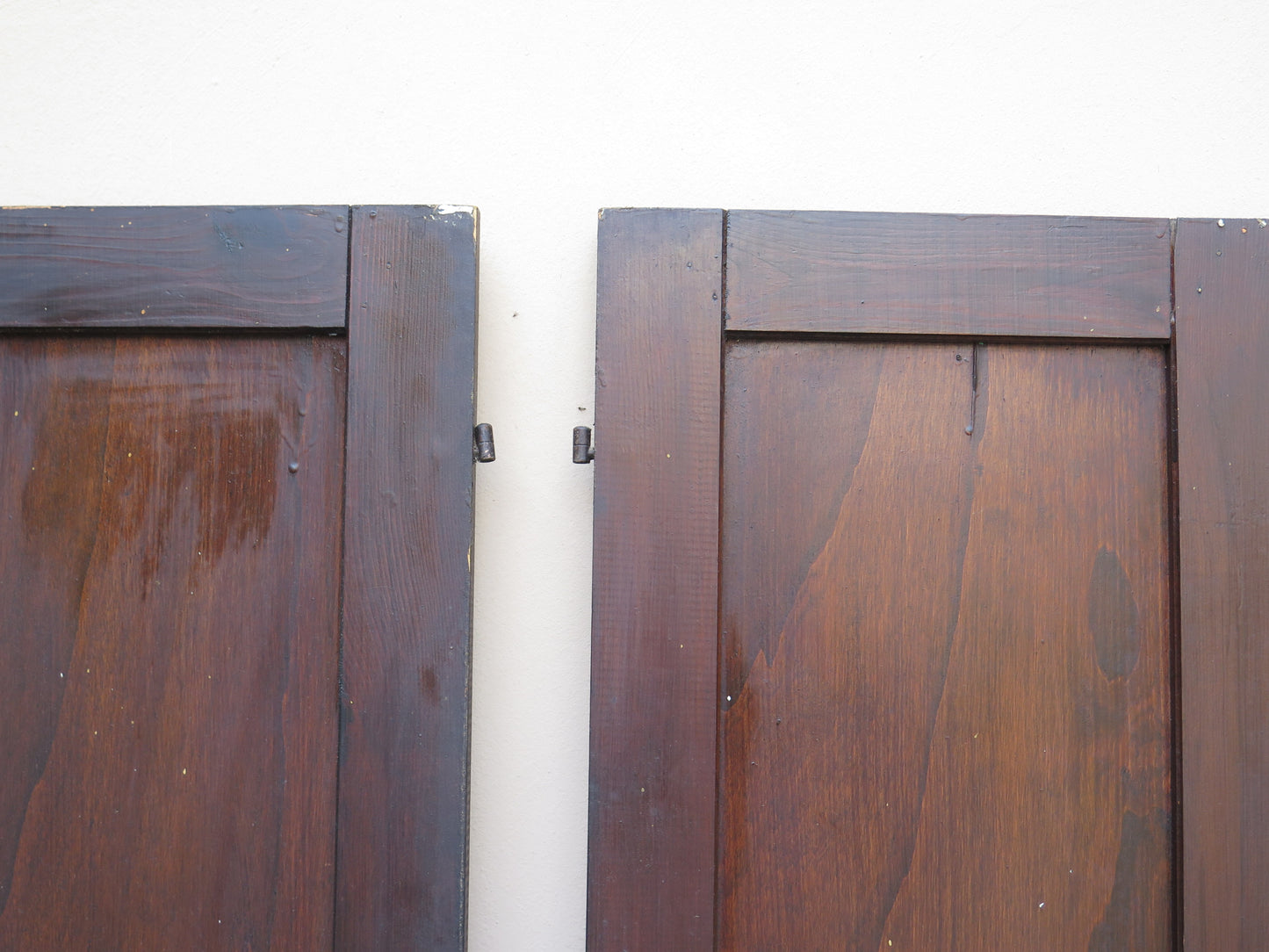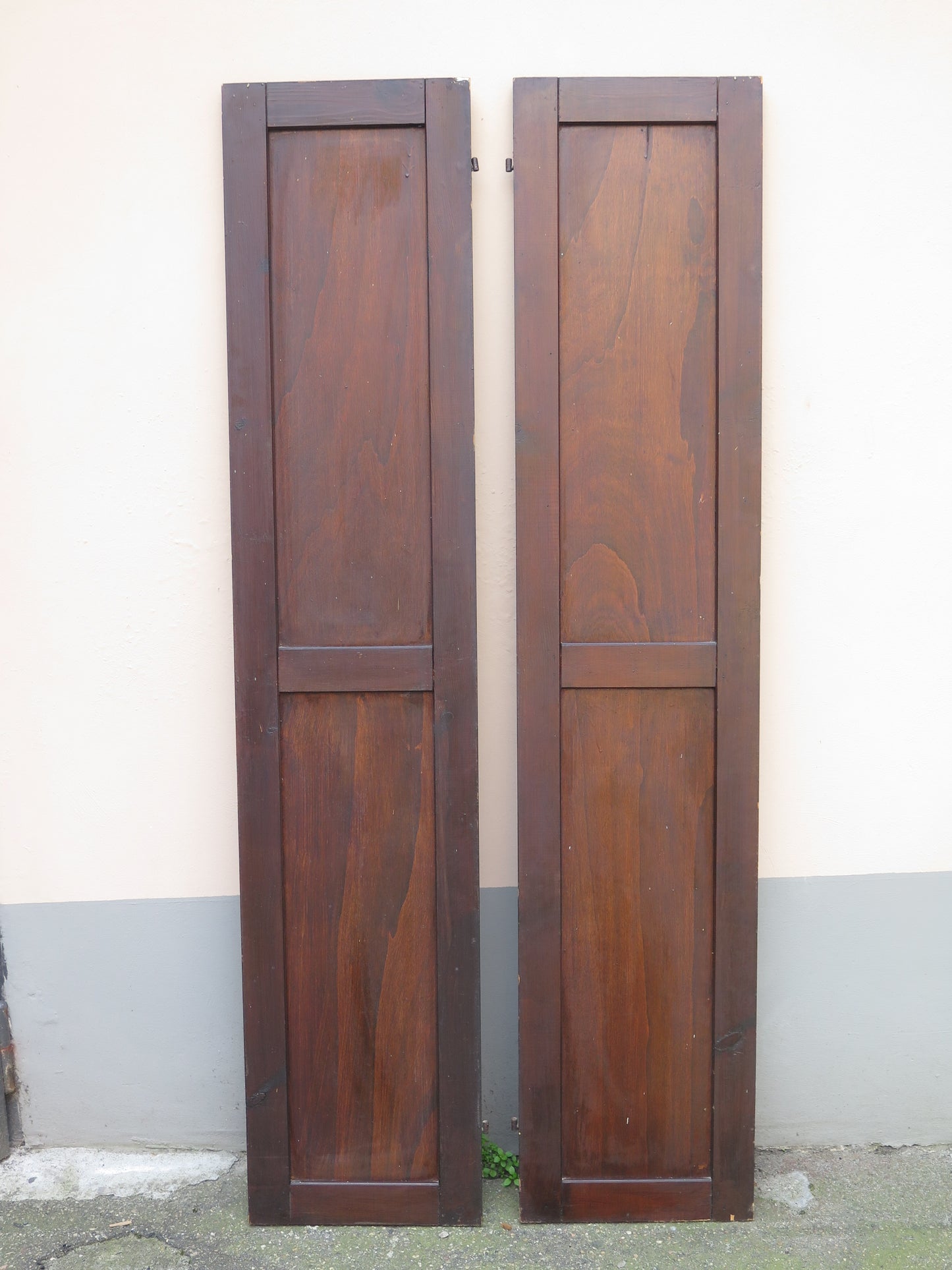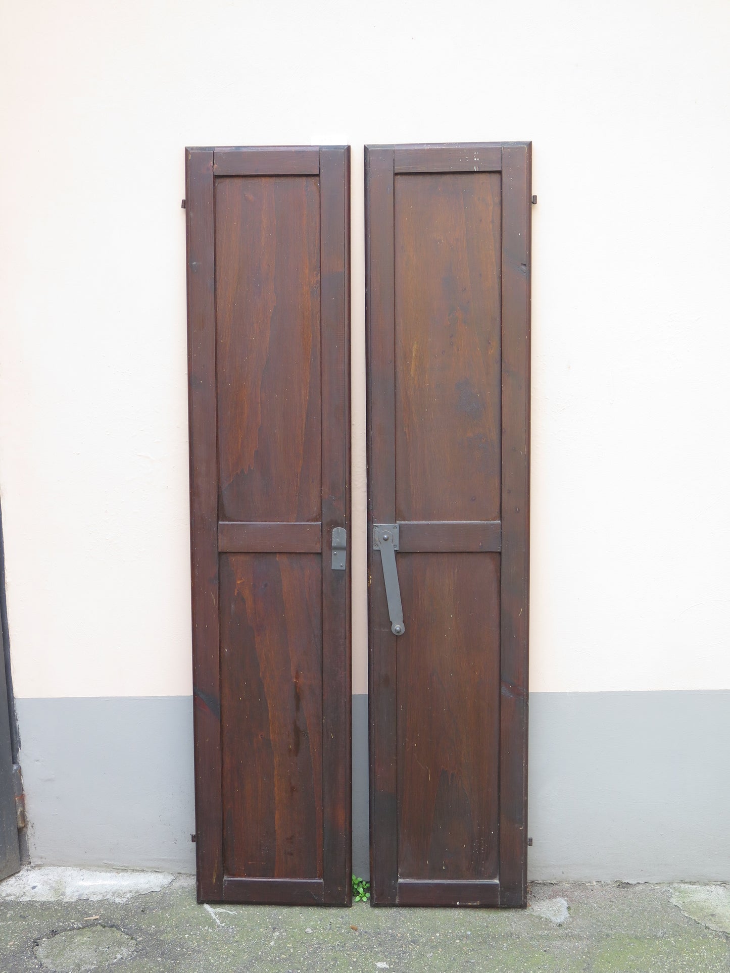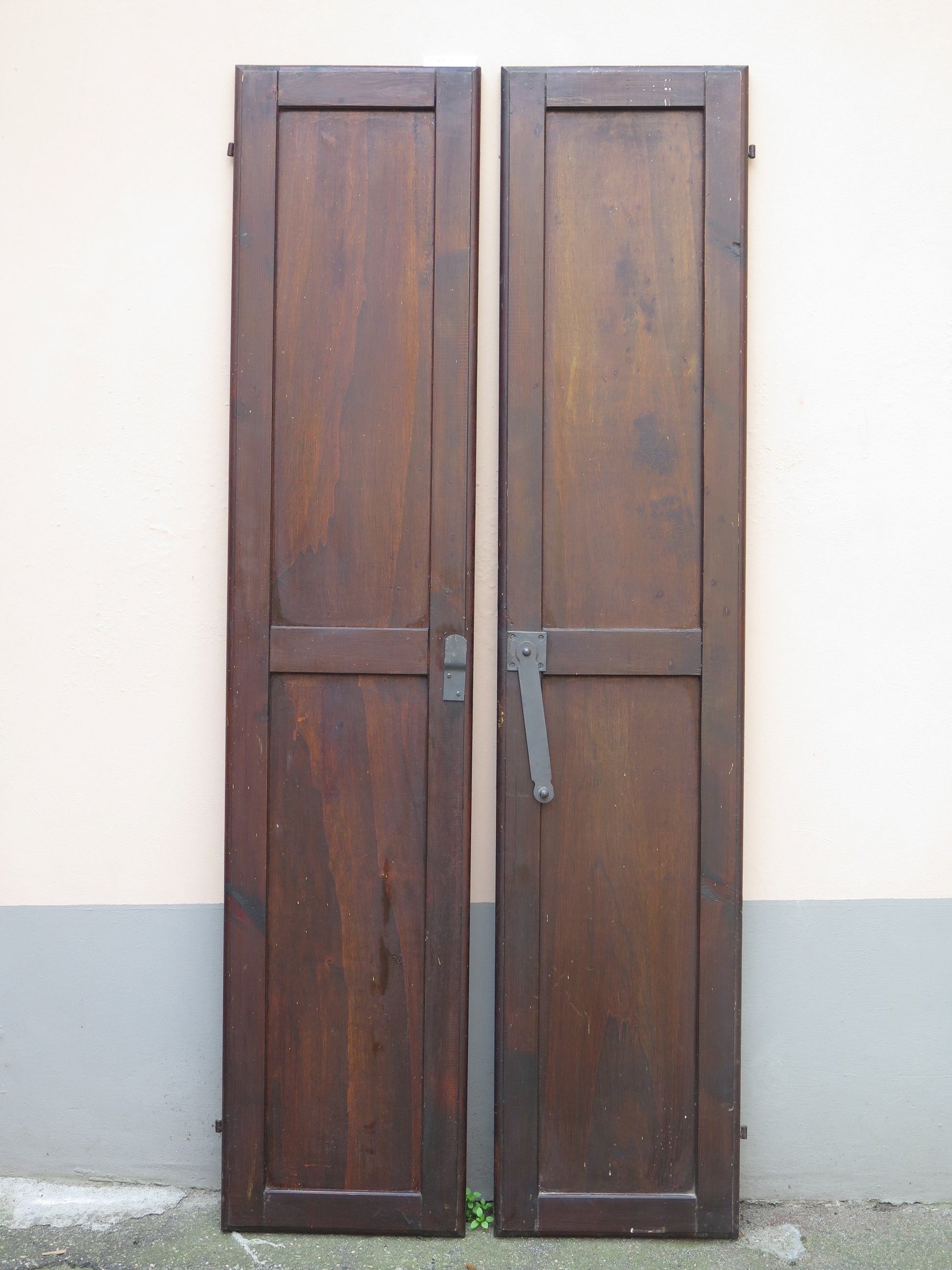 Due scuri di legno per finestre con chiusura in ferro con riquadri centrali sia nella parte inferiore che superiore.