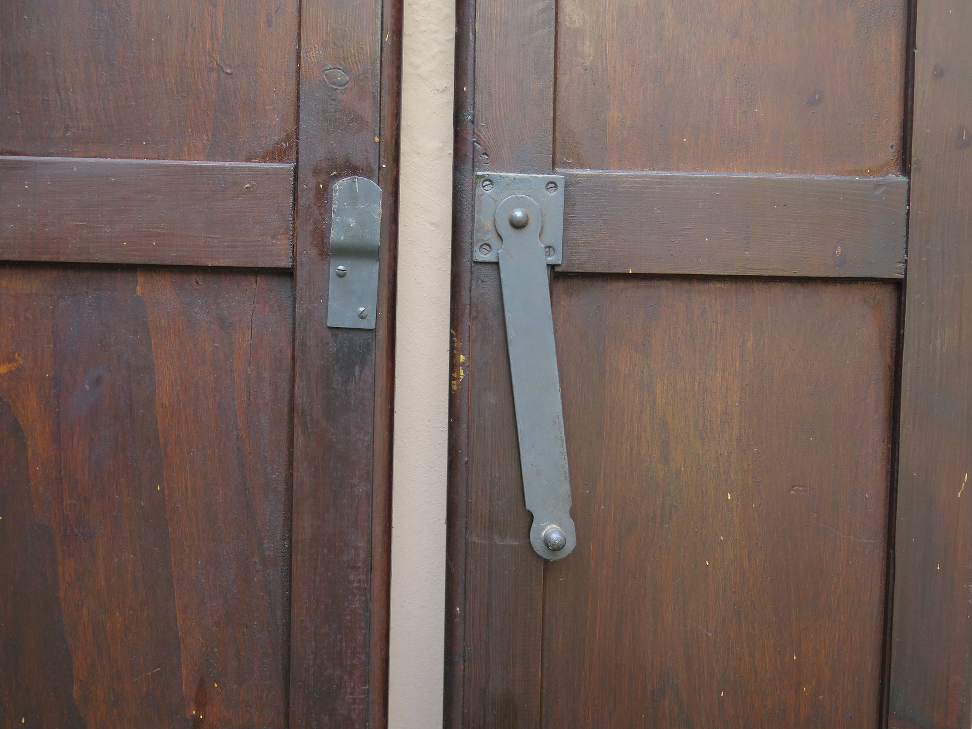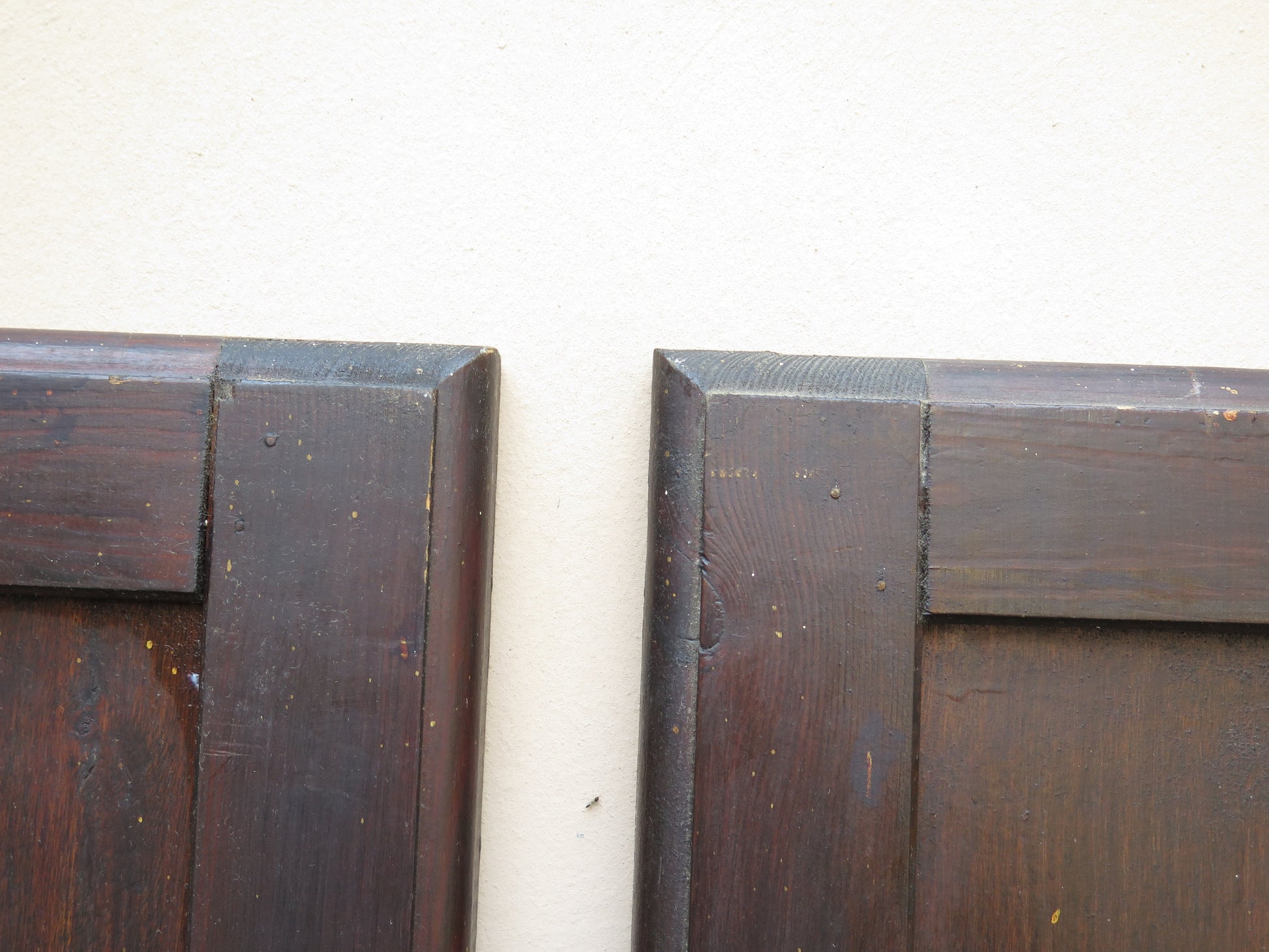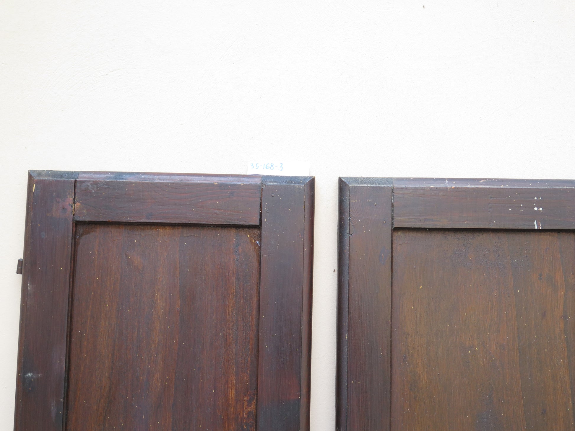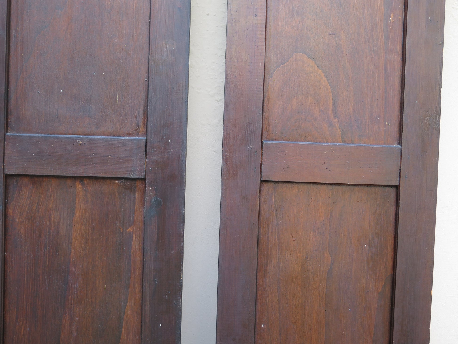 Due scuri di legno per finestre con chiusura in ferro con riquadri centrali sia nella parte inferiore che superiore.