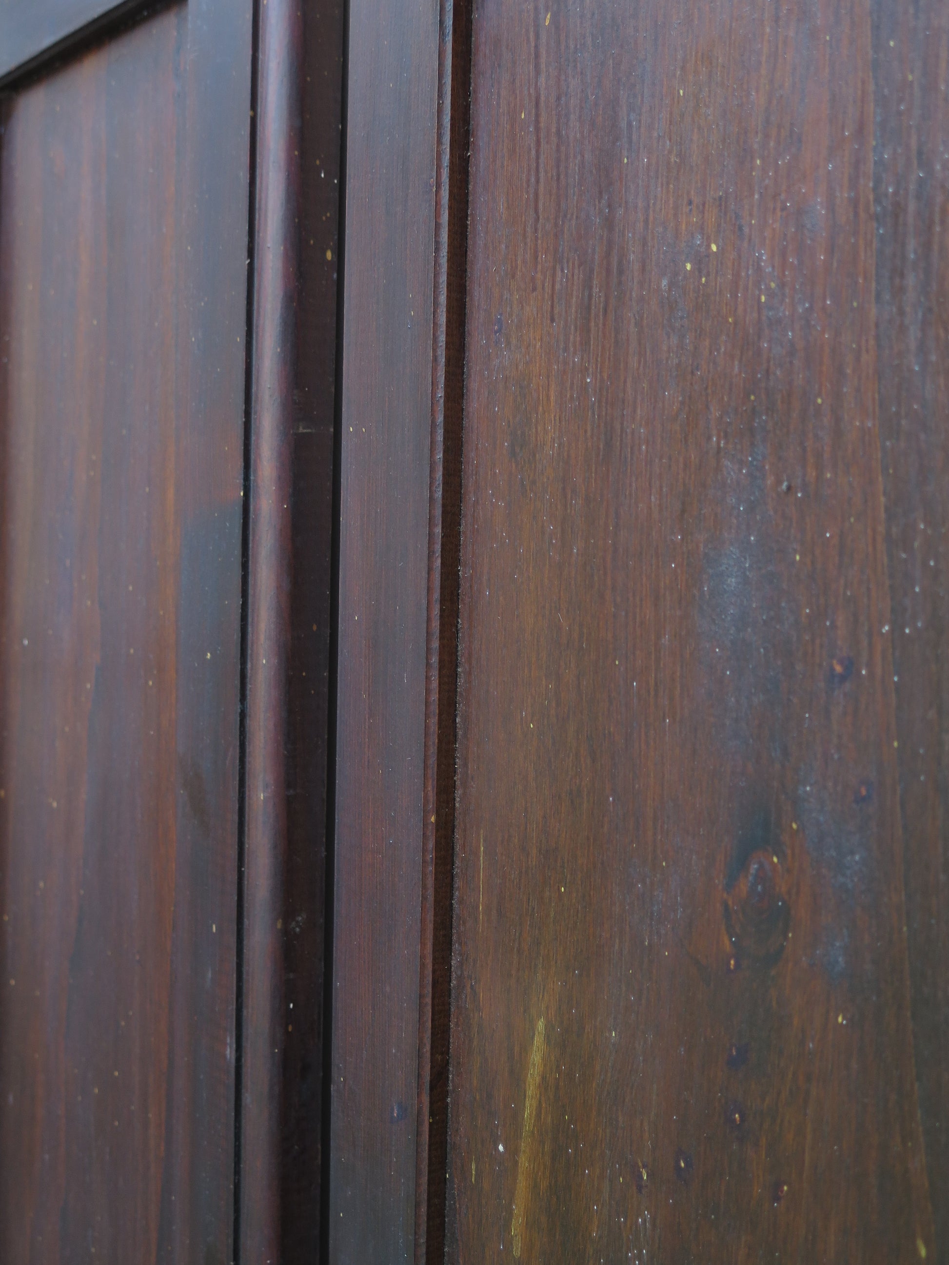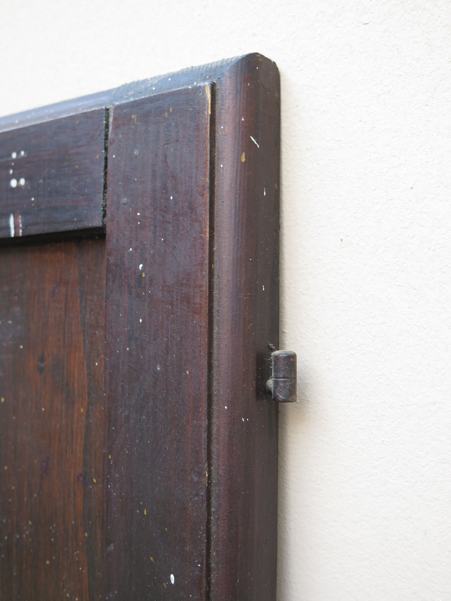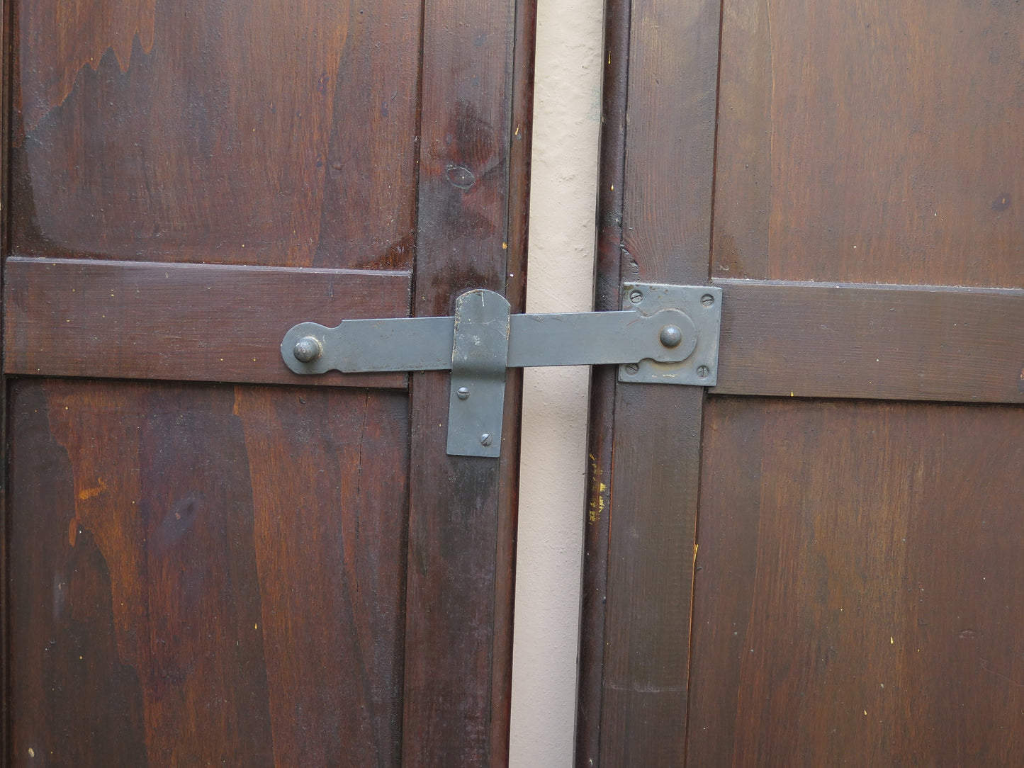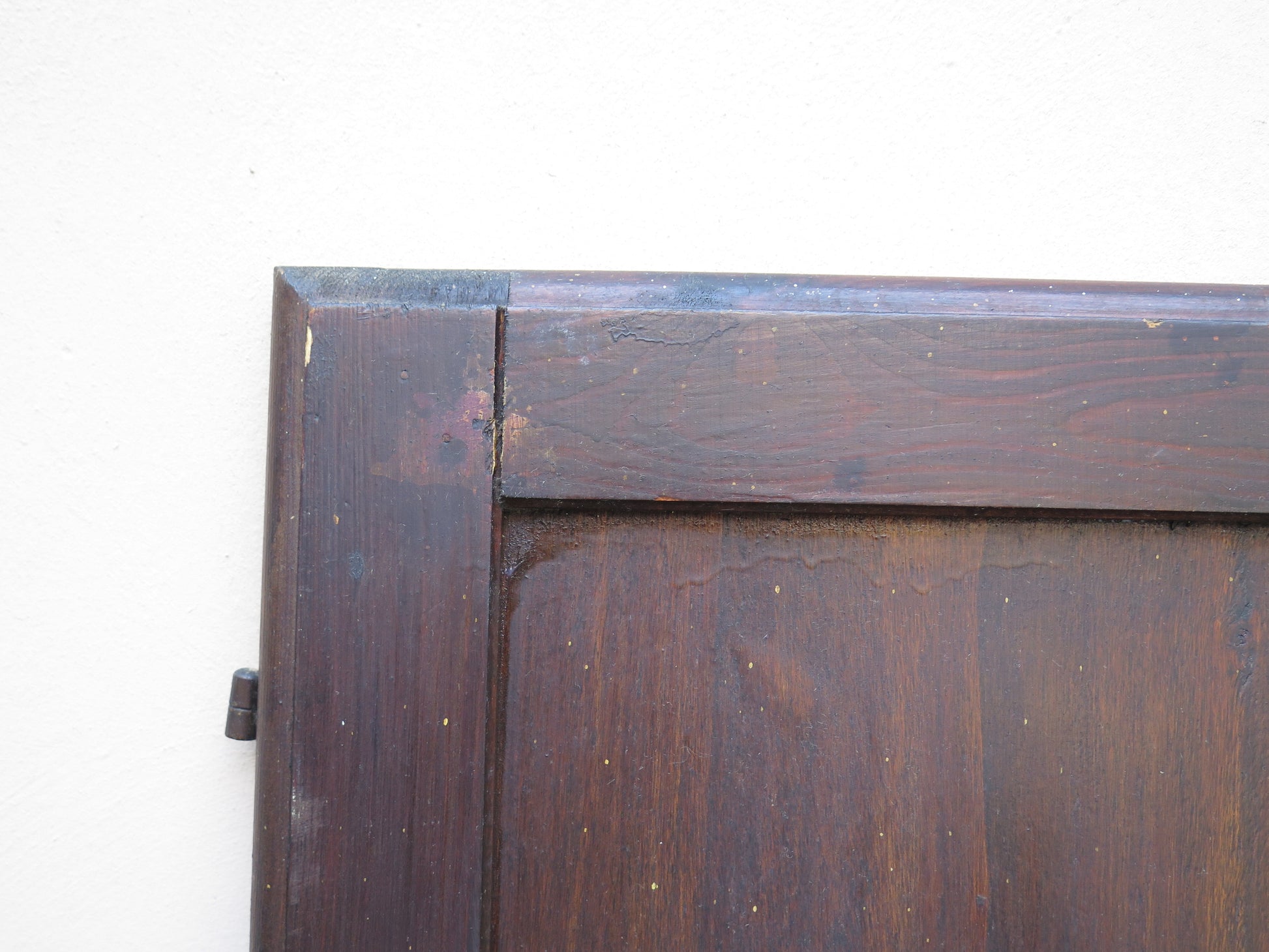 Due scuri di legno per finestre con chiusura in ferro con riquadri centrali sia nella parte inferiore che superiore.