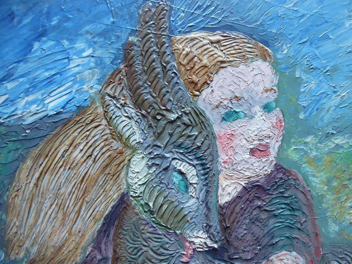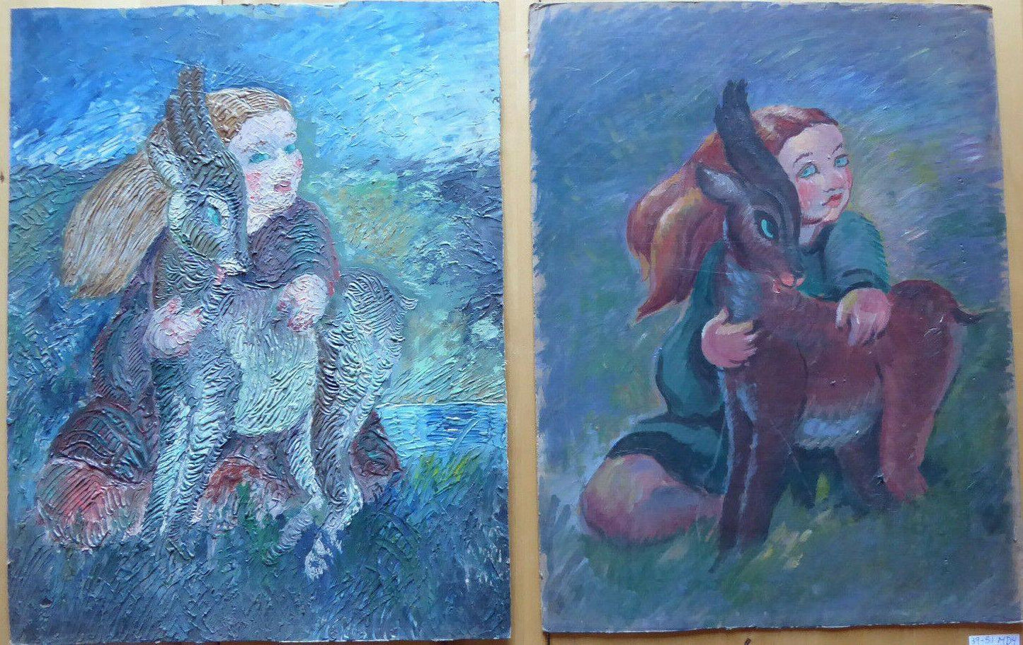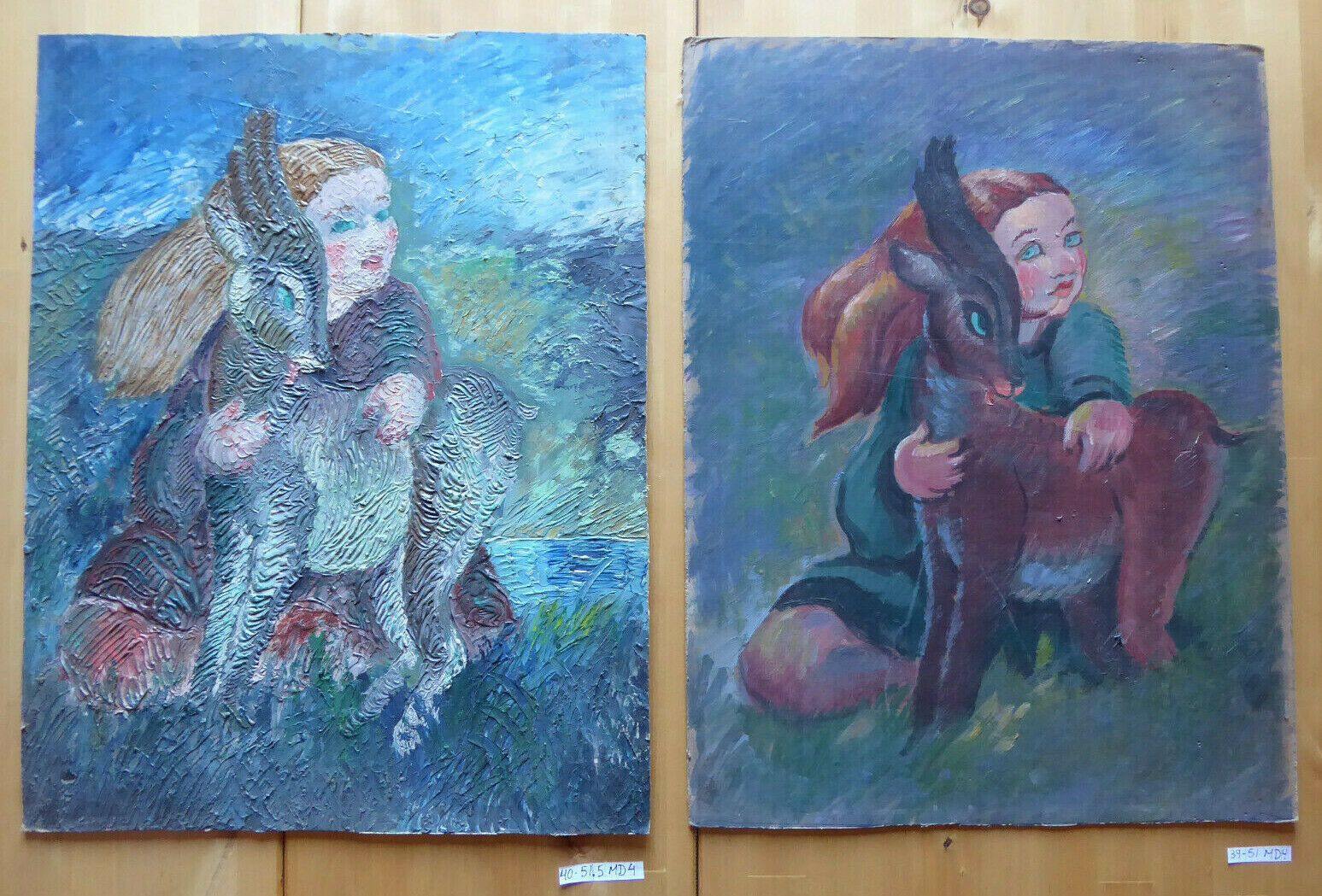 Due deliziosi dipinti gemelli in stile naif che ritraggono una bambina con capretta, uno con superficie pittorica molto materica e l'altro liscia.