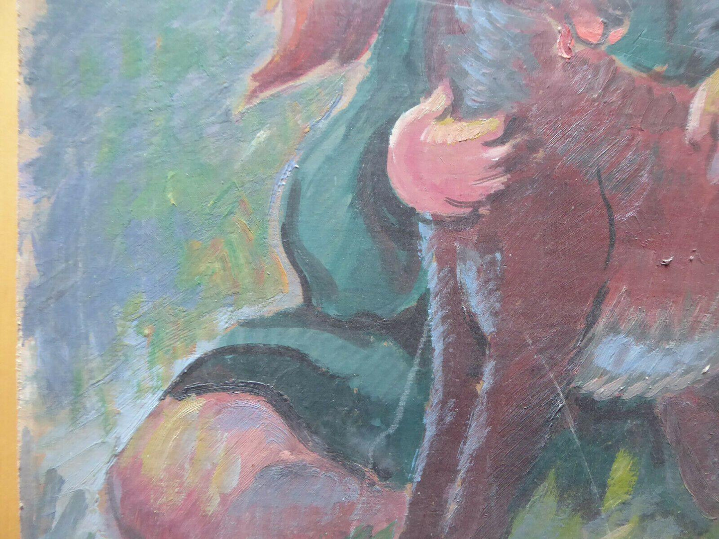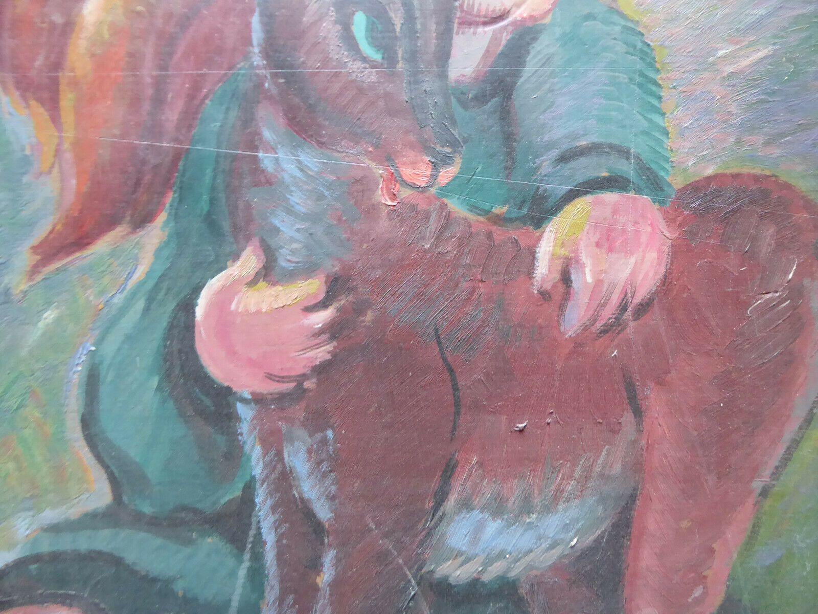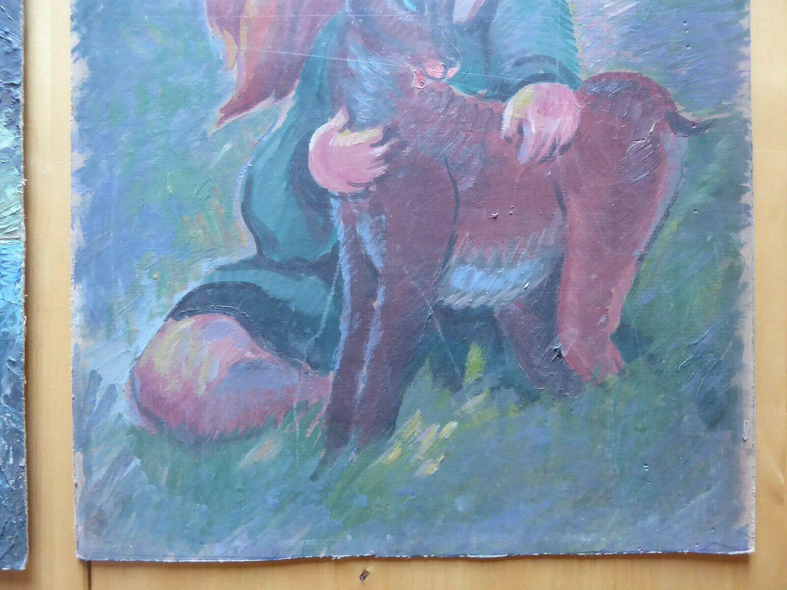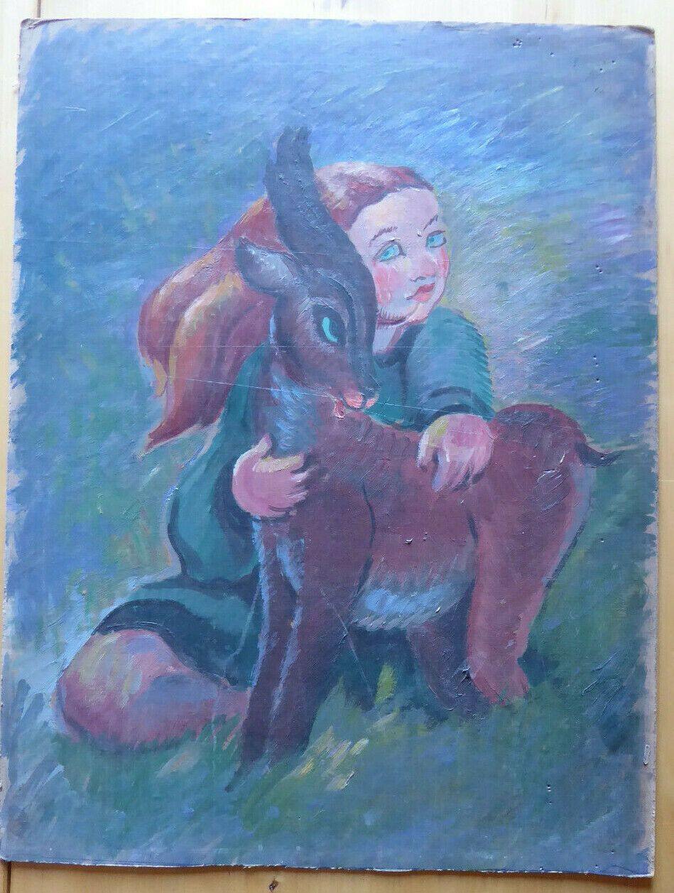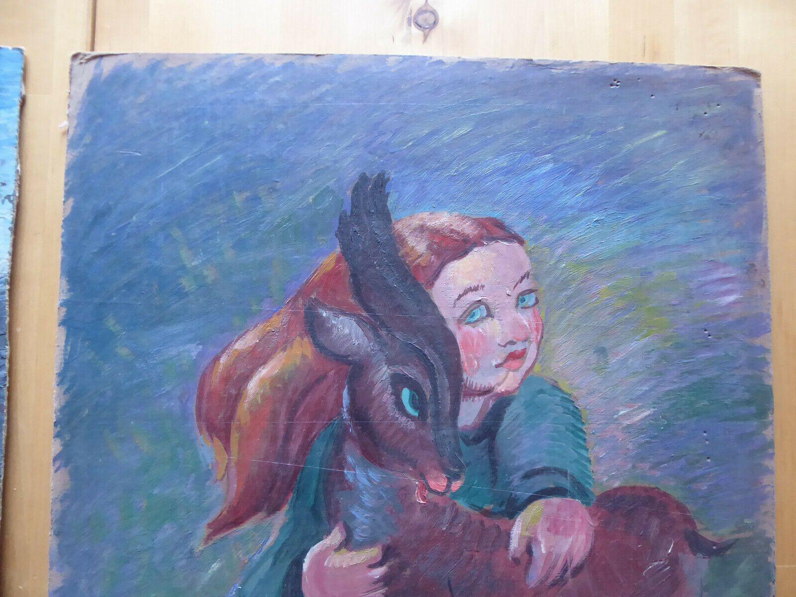 DUE VECCHI DIPINTI AD OLIO PENDANT VINTAGE BAMBINA CON CAPRETTO SPAGNA '900 MD4