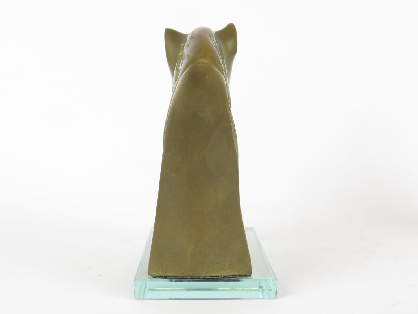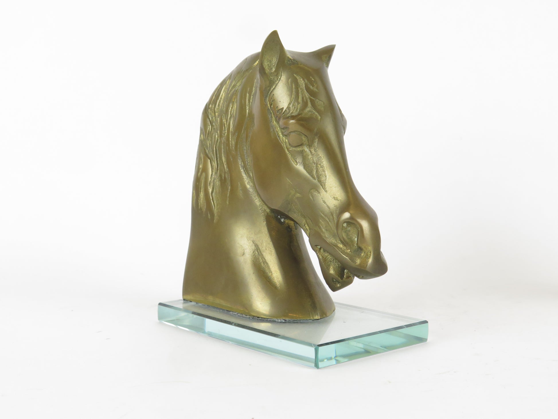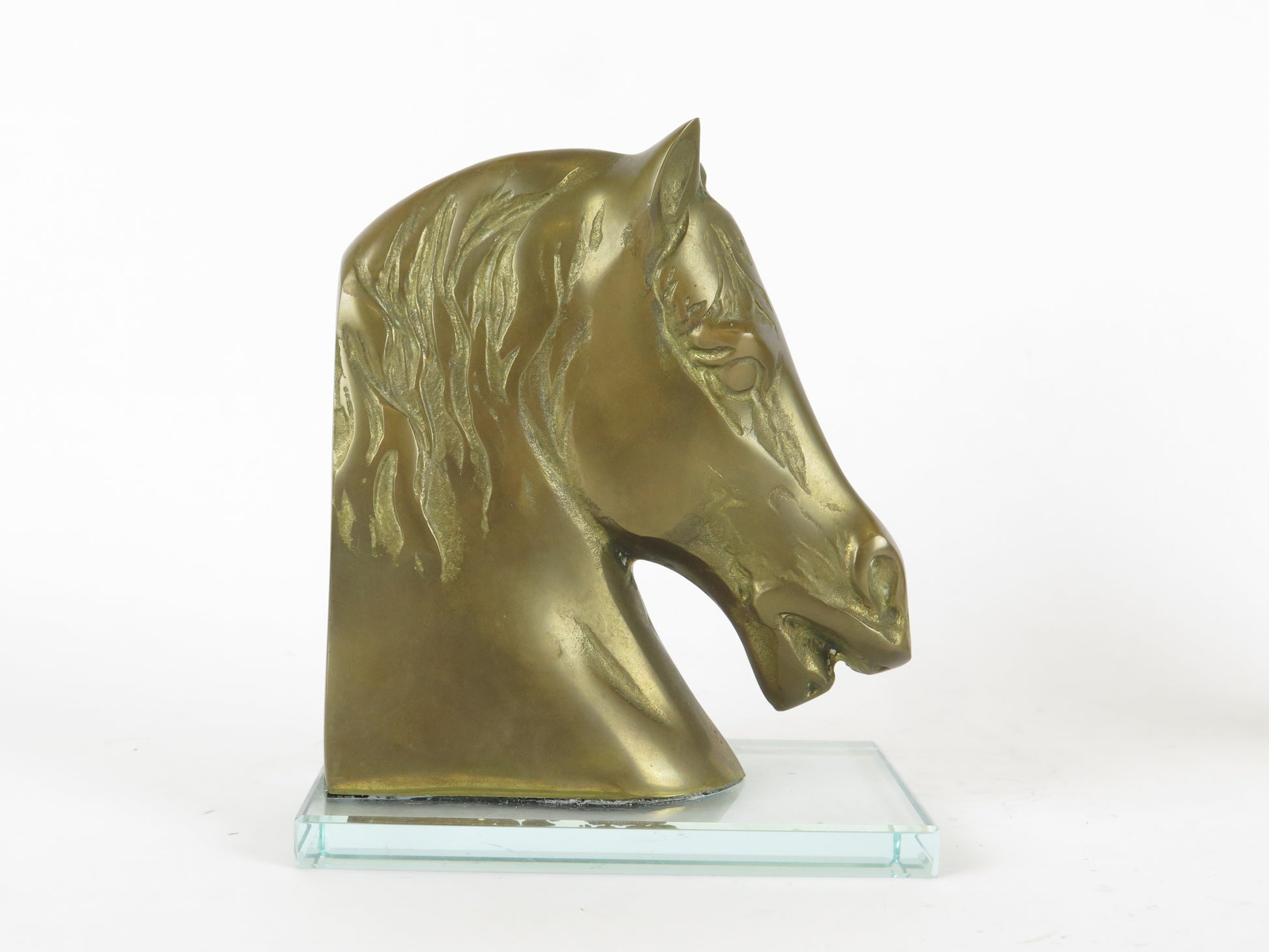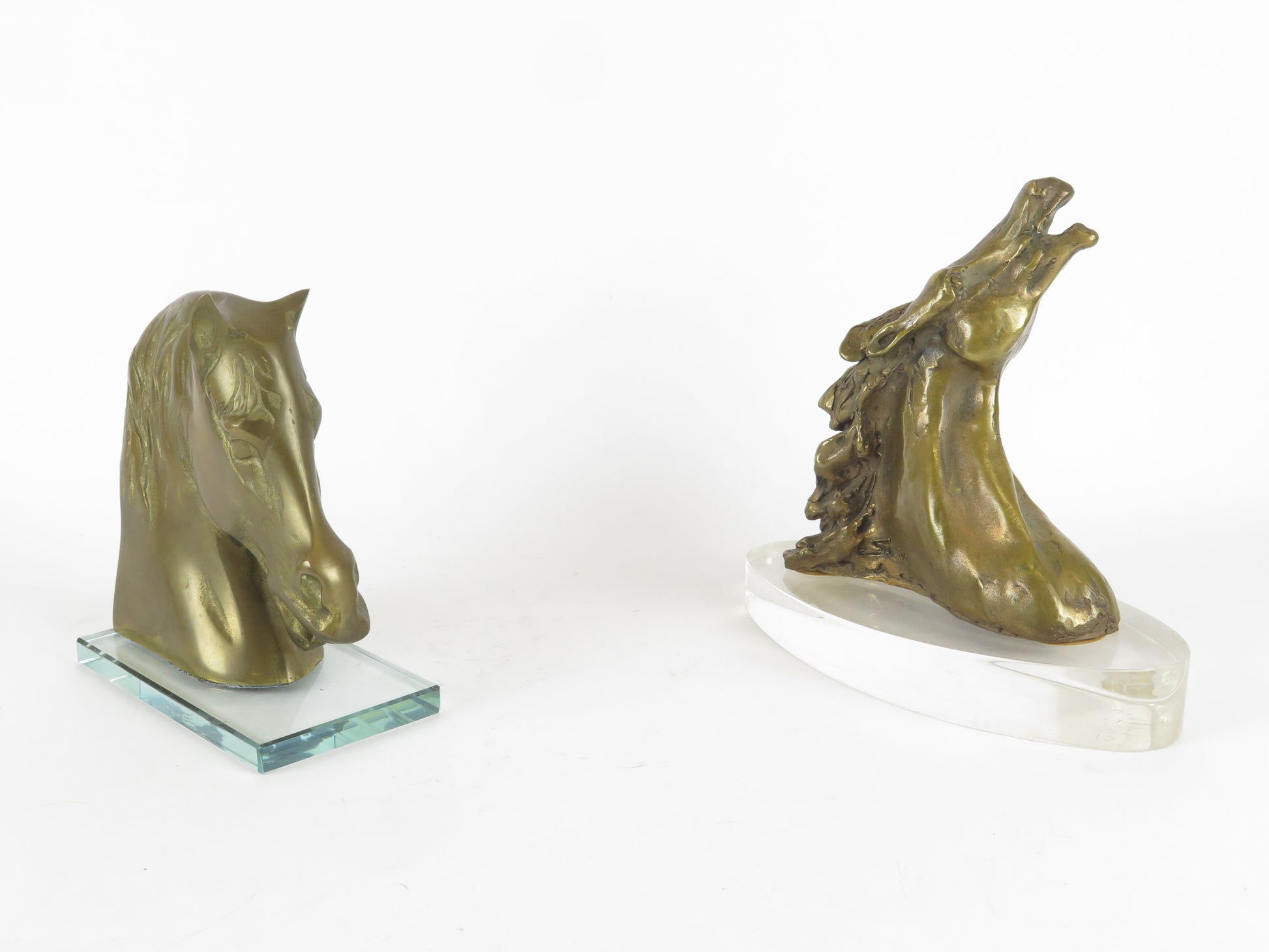 Due statuine in bronzo con testa di cavallo su base di plexiglass.