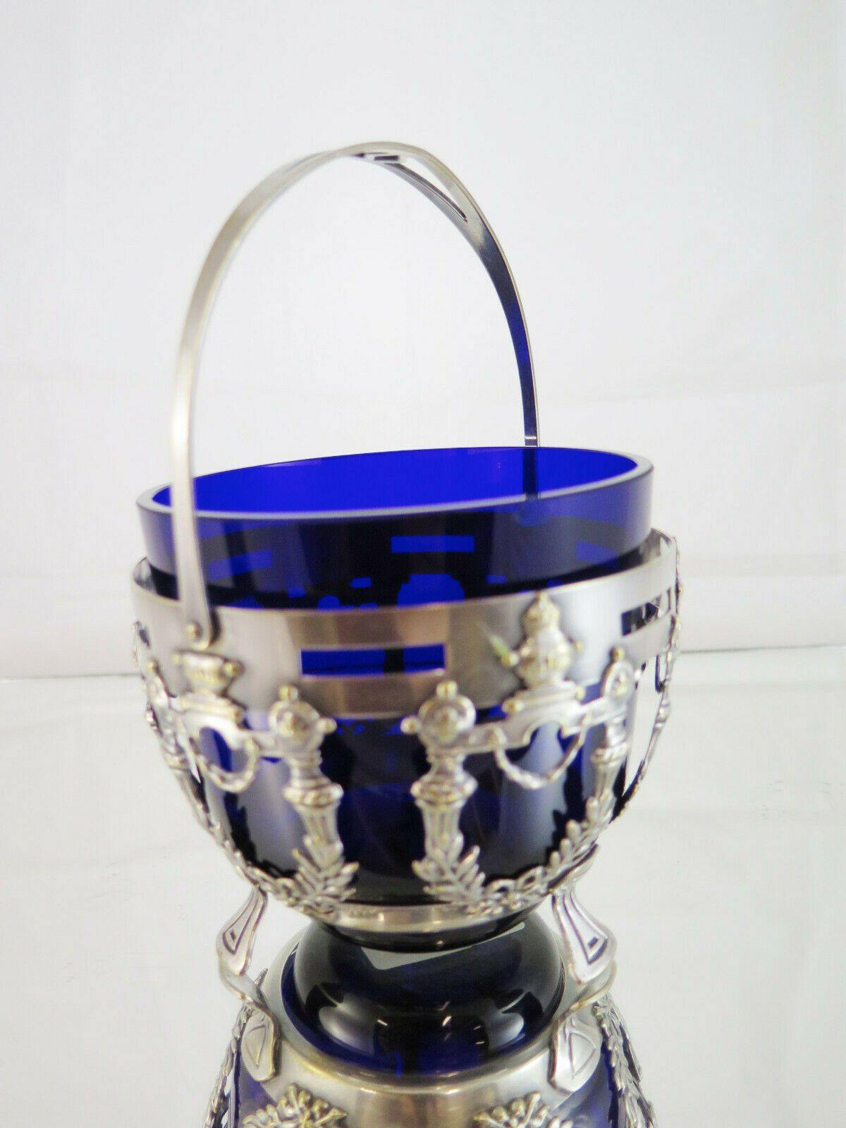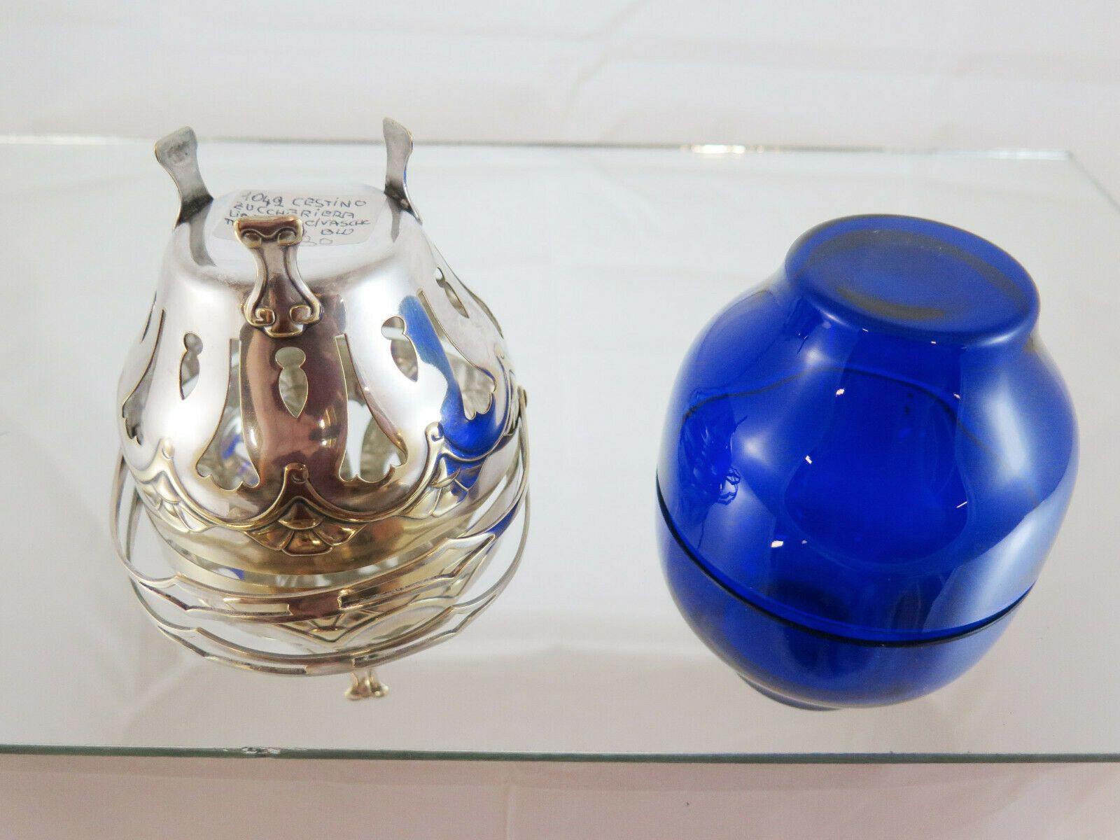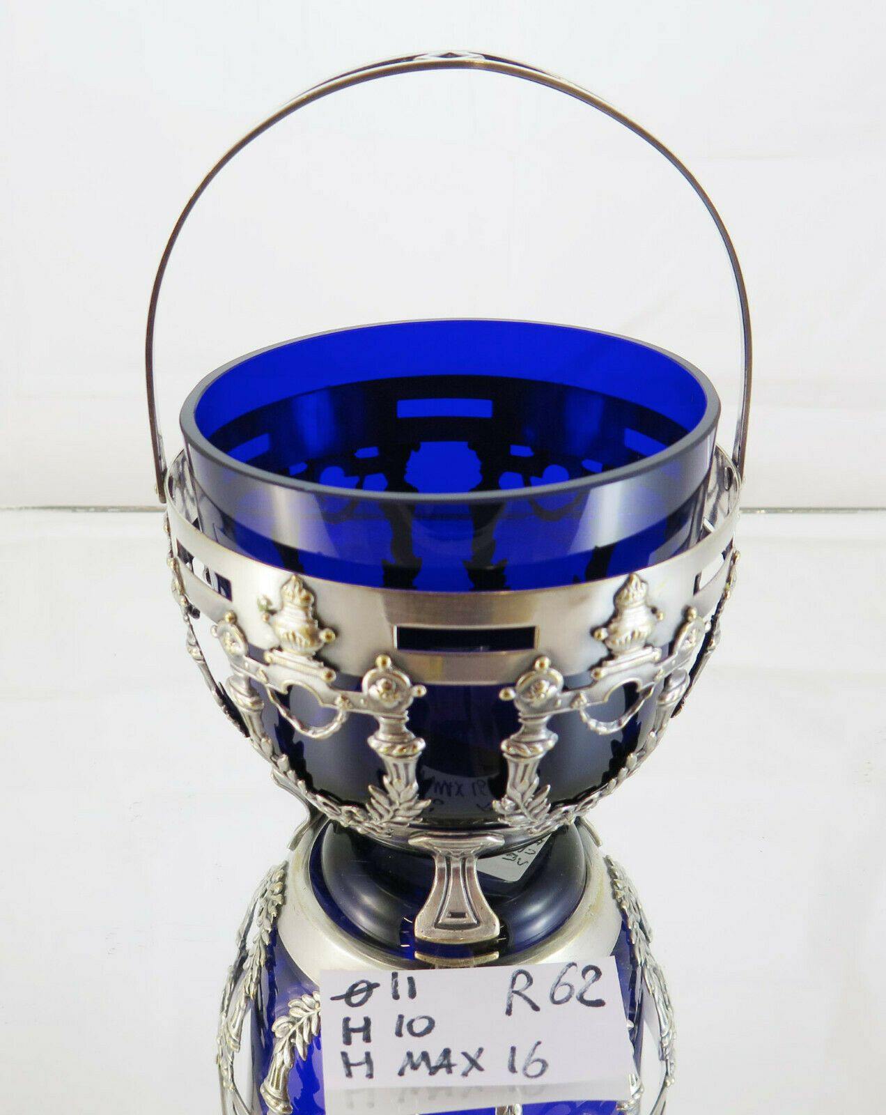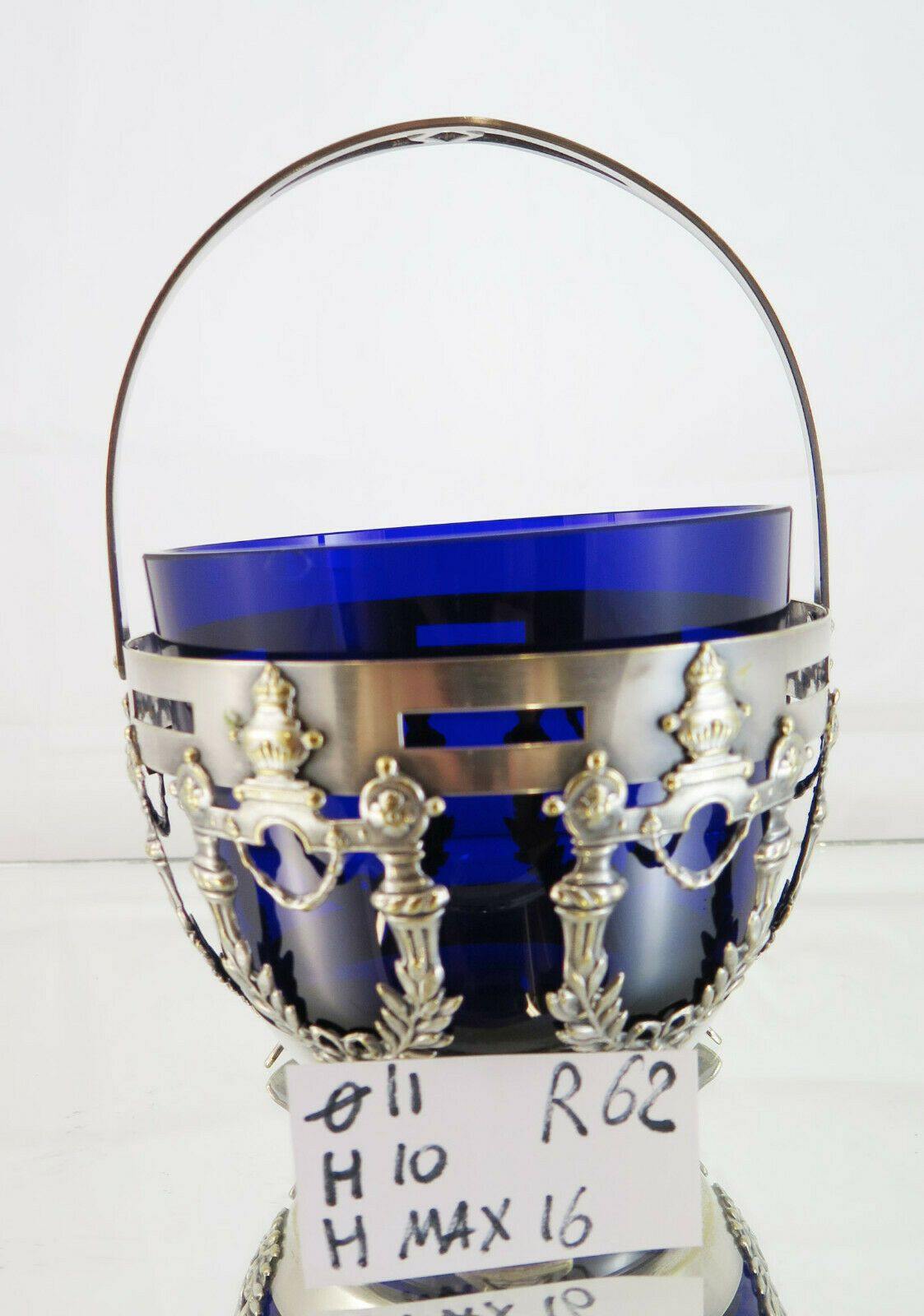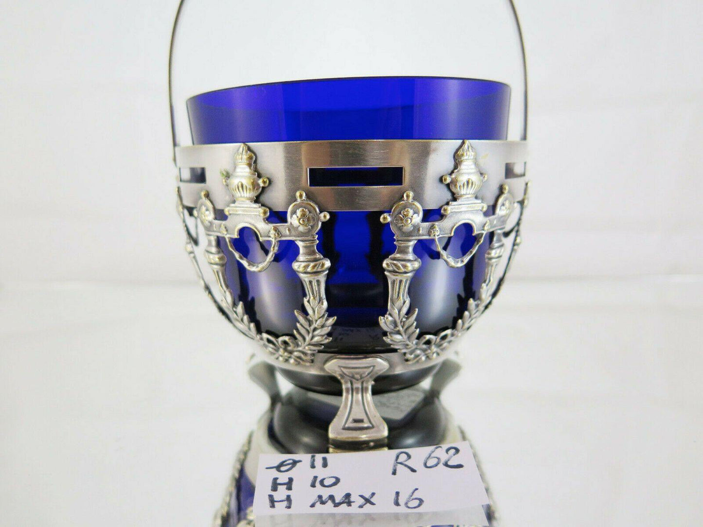 ELEGANTE ZUCCHERIERA ANTICA NEOCLASSICA ECLETTICA IN METALLO E VETRO BLU R62
