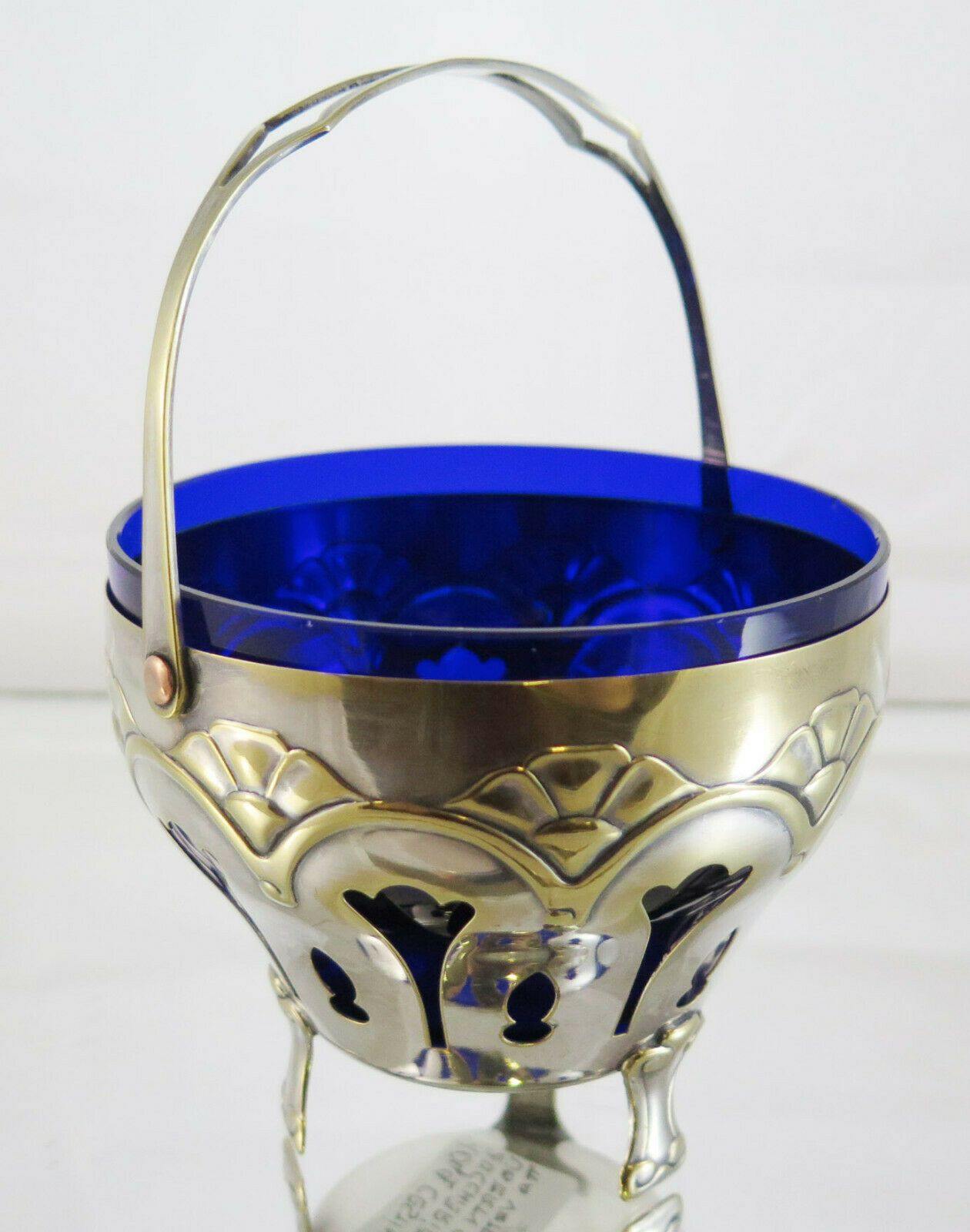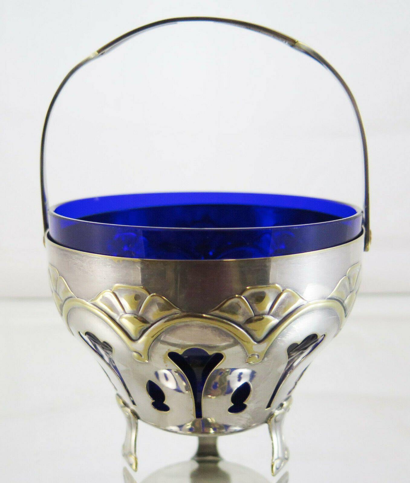 Elegante zuccheriera in metallo lavorato a sbalzo di gusto eclettico con coppa in vetro blu e sottile manico a mezzuluna superiore.