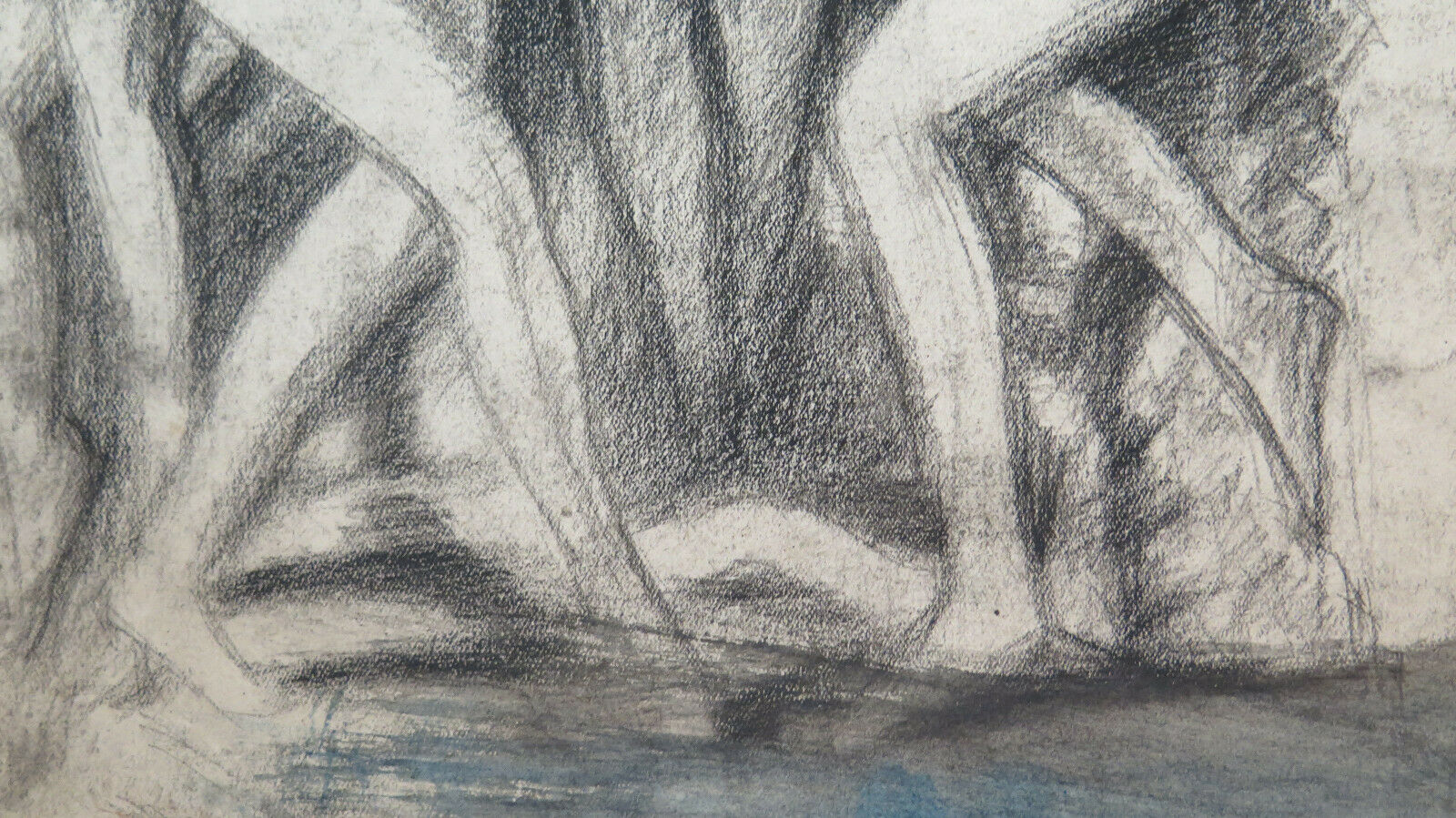 Large double-sided drawing with nudes on one side and old french village street view on the other.