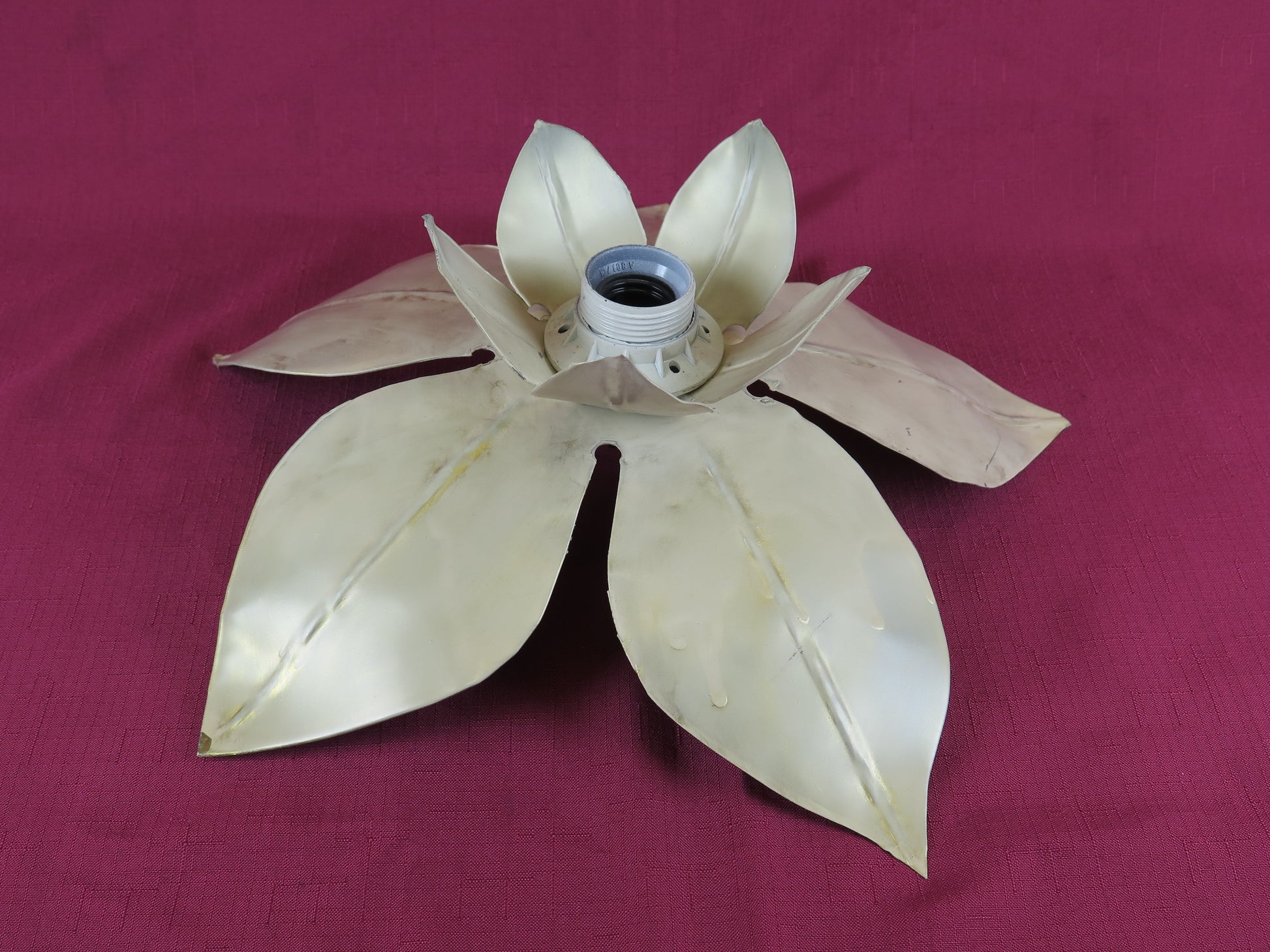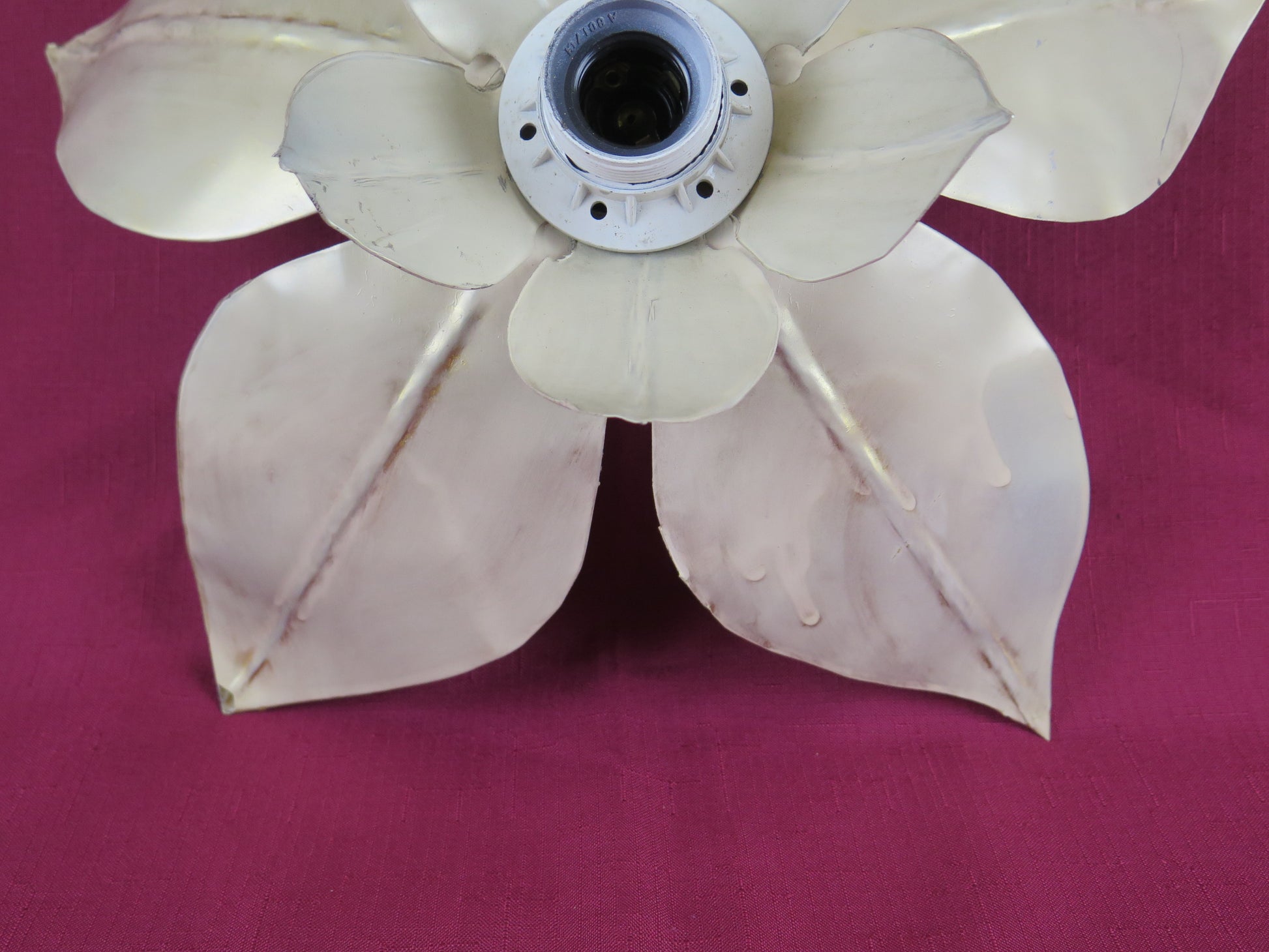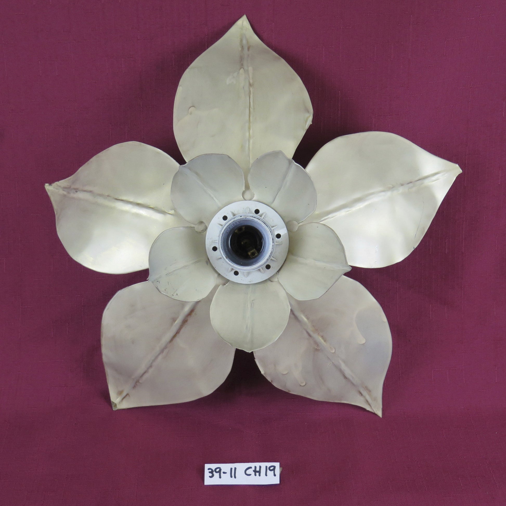Elegante applique in ferro battuto a forma di fiore, ideale sia da parete che da soffitto, dove la lampadina centrale è circondata da petali lavorati a sbalzo.