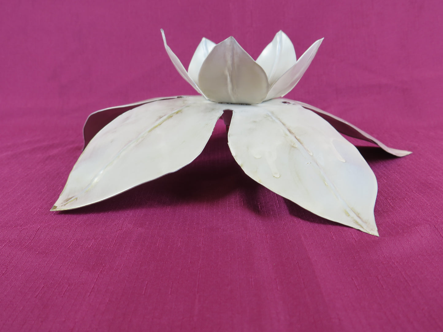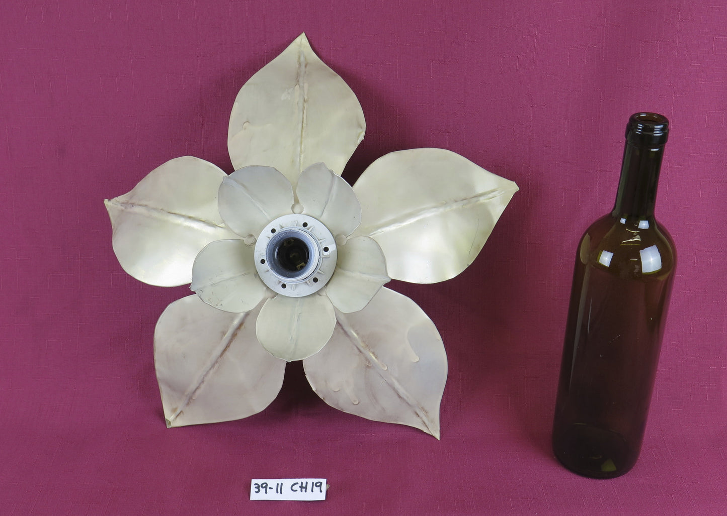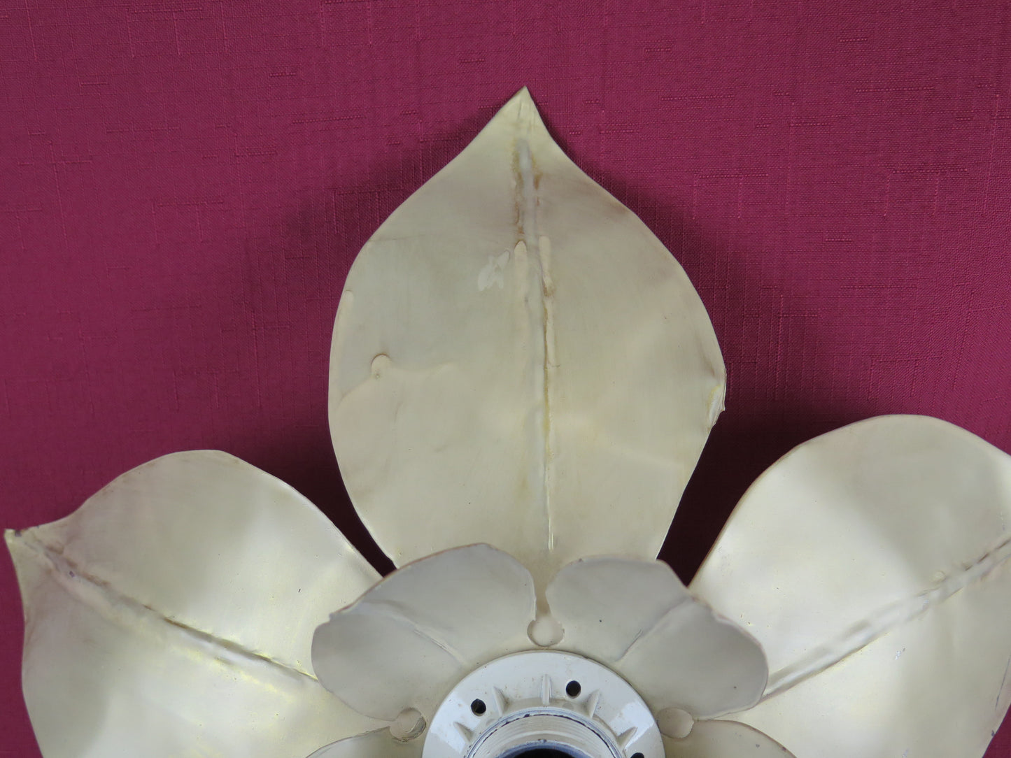Elegante applique in ferro battuto a forma di fiore, ideale sia da parete che da soffitto, dove la lampadina centrale è circondata da petali lavorati a sbalzo.
