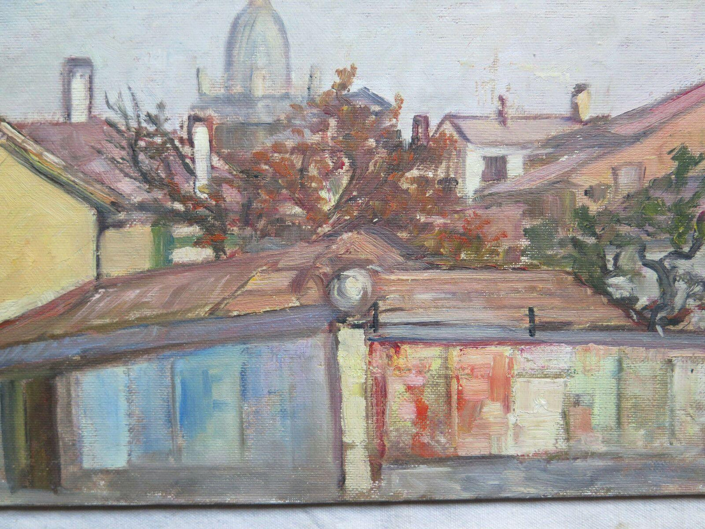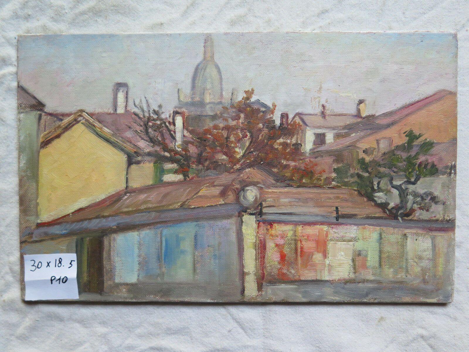 Antico dipinto ad olio su tavola realizzato dal pittore modenese Gaetano Pancaldi (1922-2014), veduta della città di Piumazzo famosa per lo storico locale notturno Kiwi Cathedral che si trovava proprio dietro la casa del pittore.