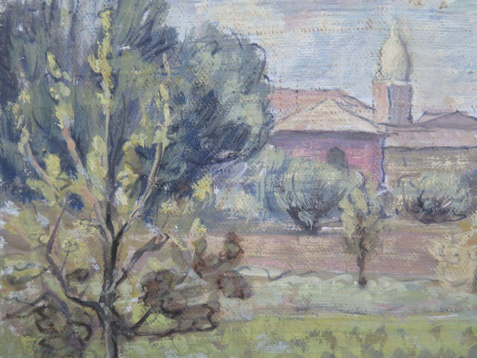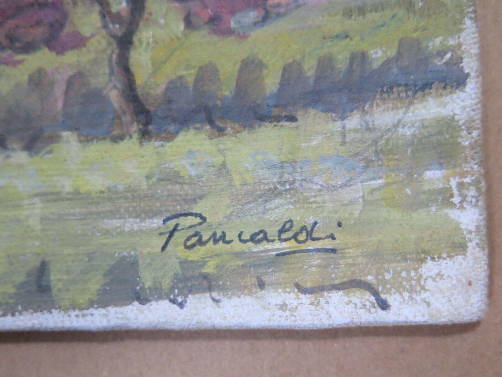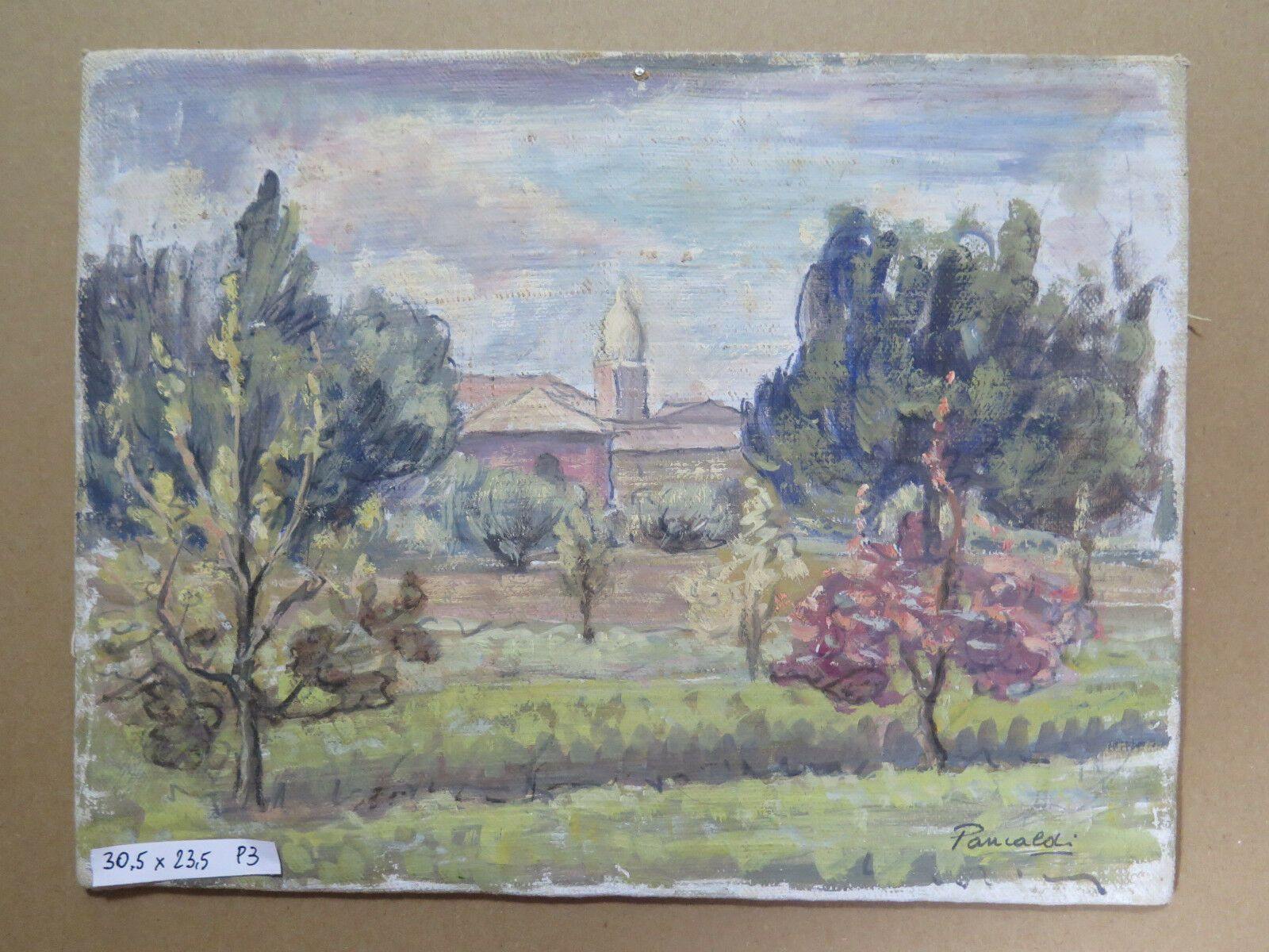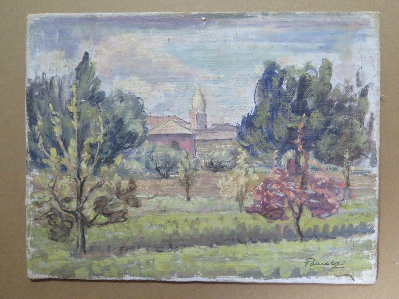 Antico dipinto ad olio su tavola, romantico paesaggio di campagna in stile impressionista, opera dell'artista Gaetano Pancaldi (1922-2014).