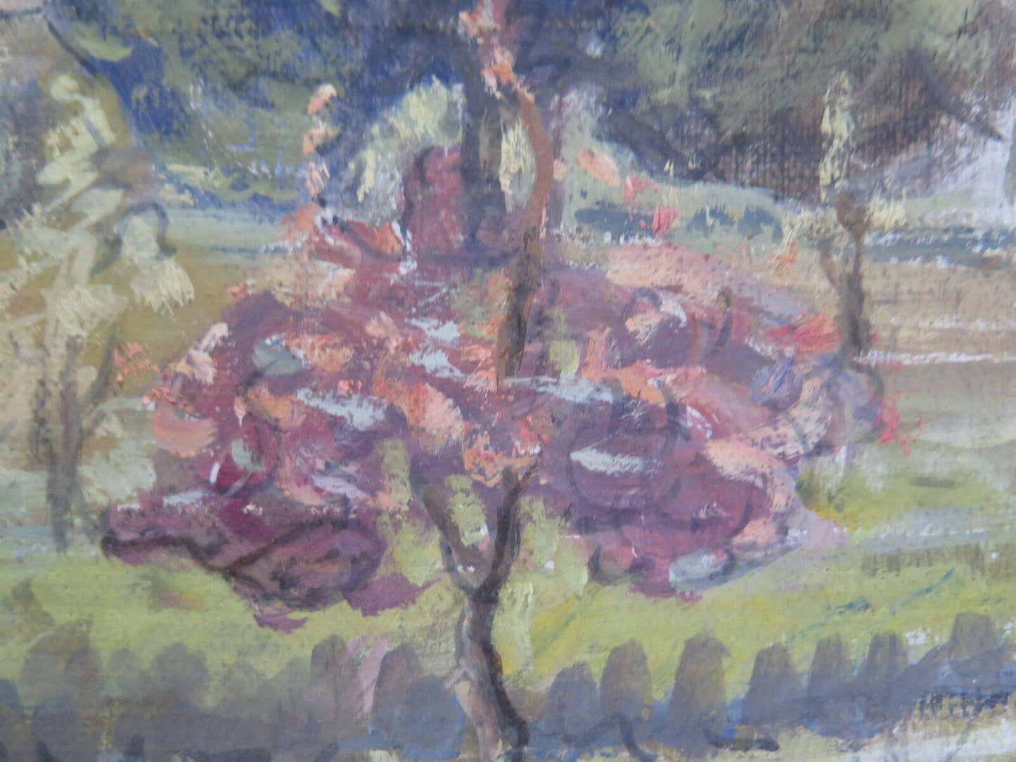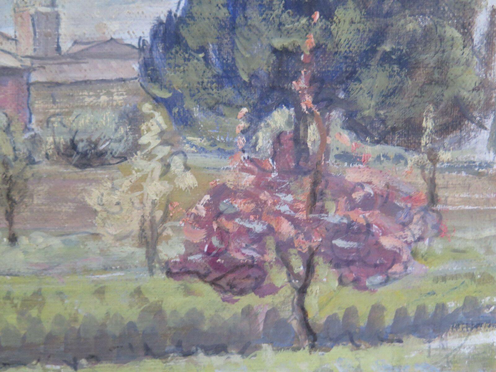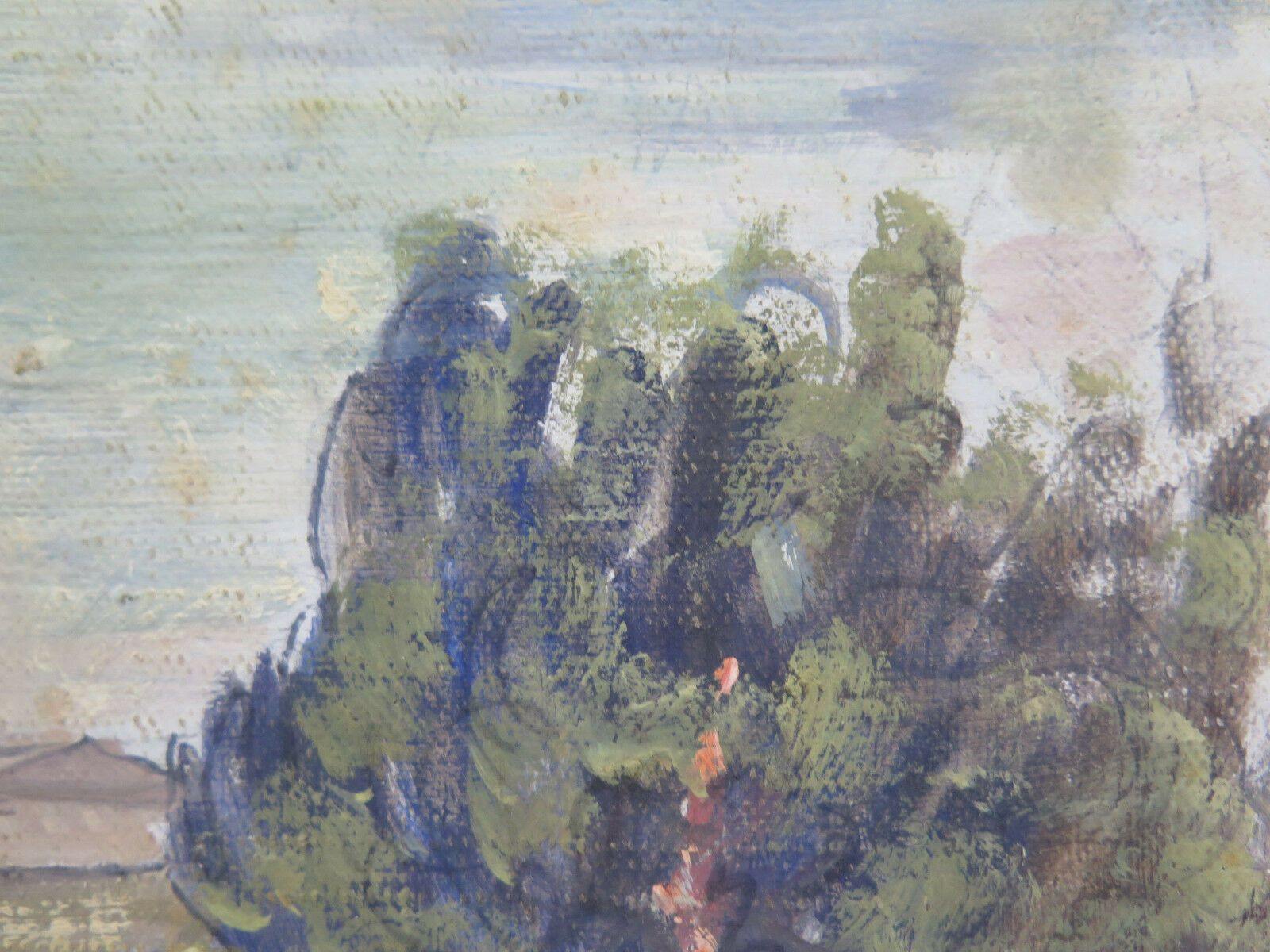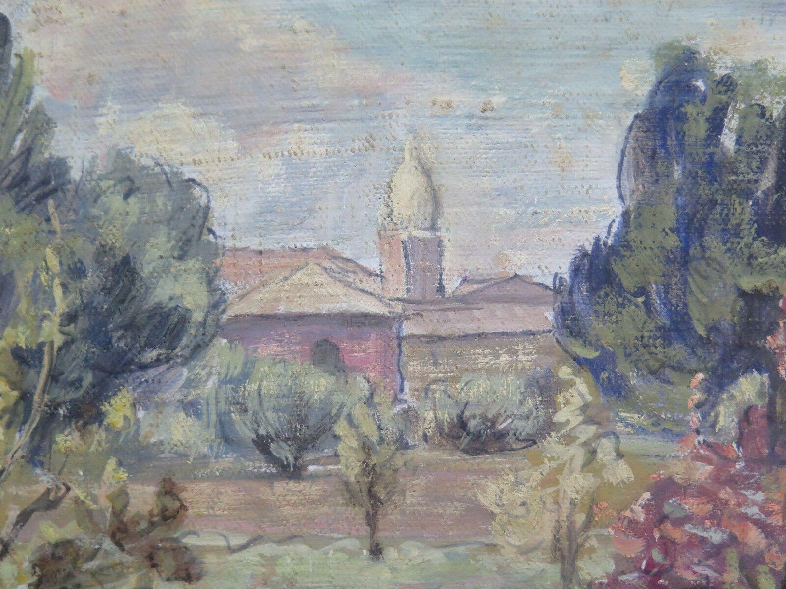 Antico dipinto ad olio su tavola, romantico paesaggio di campagna in stile impressionista, opera dell'artista Gaetano Pancaldi (1922-2014).