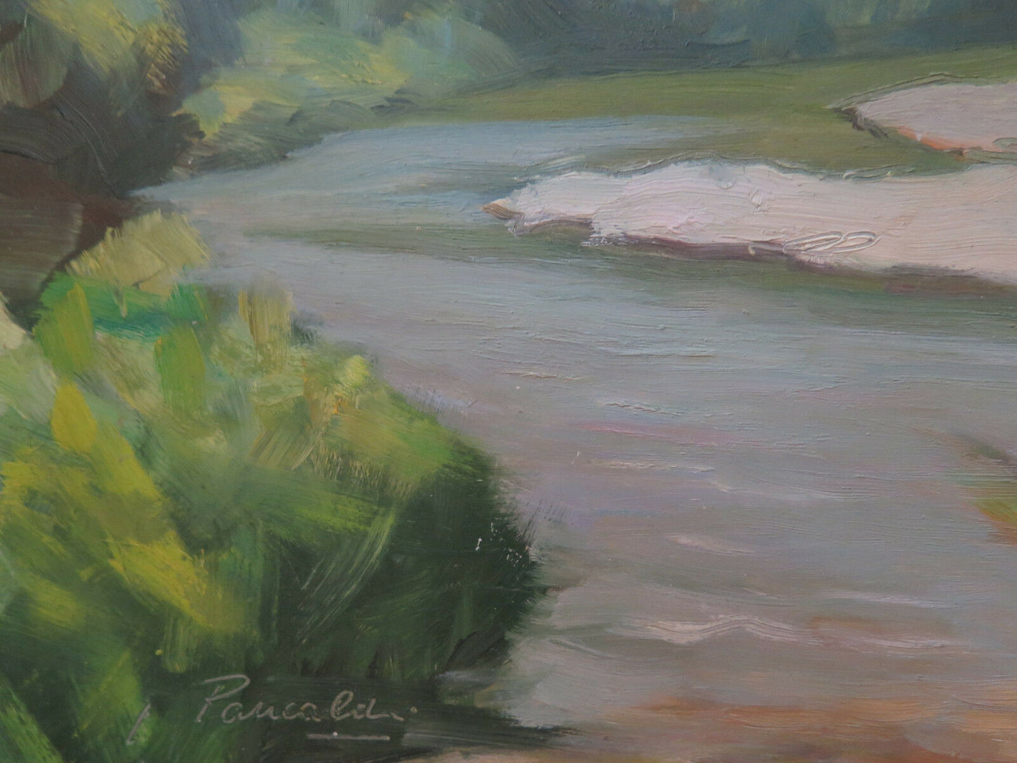 Antico dipinto ad olio su tavola realizzato dal pittore modenese Gaetano Pancaldi (1922-2014), bellissimo paesaggio della campagna emiliana. Firmato.