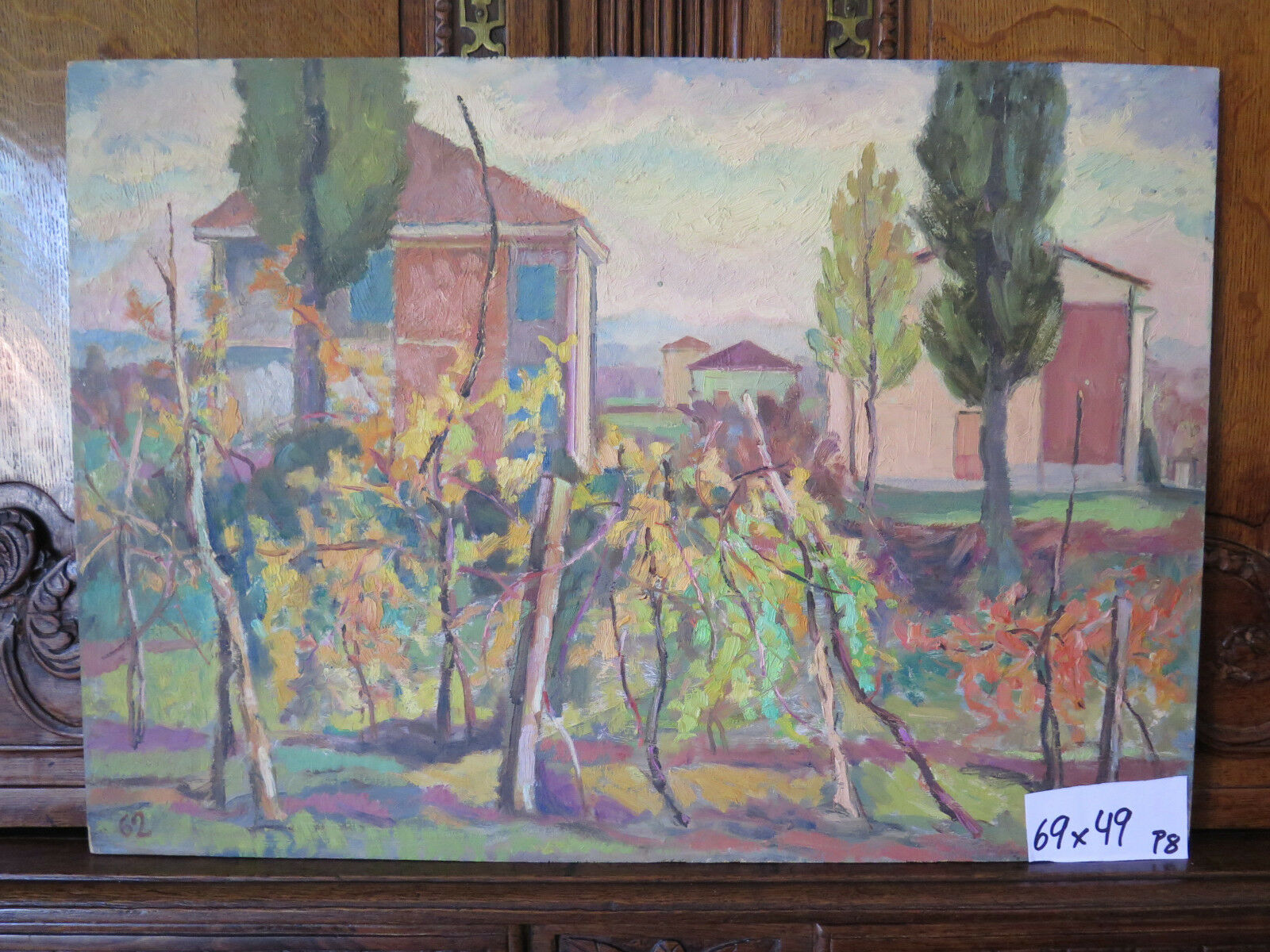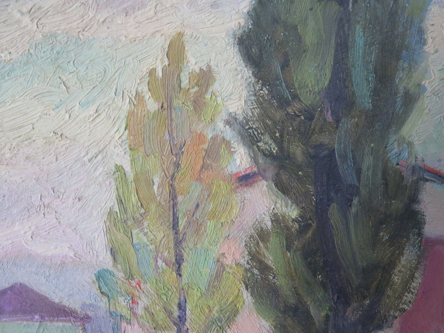 Particolare dipinto ad olio su tavola che raffigura una veduta di un paese della campagna emiliana dal gusto post impressionista, opera dell'artista Gaetano Pancaldi (1922-2014).