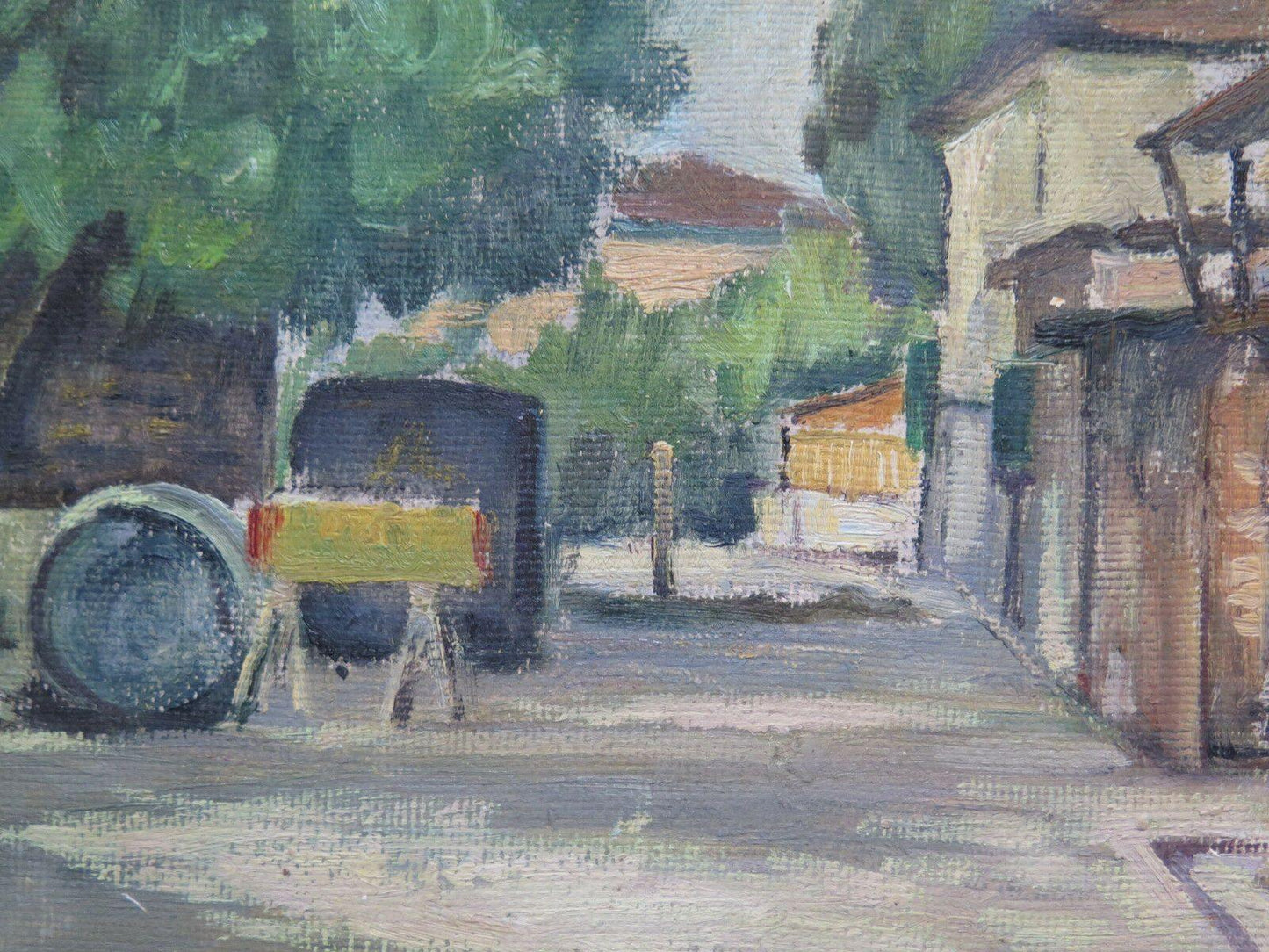 Particolare dipinto ad olio su tavola, romantica veduta di campagna, opera dell'artista Gaetano Pancaldi (1922-2014).