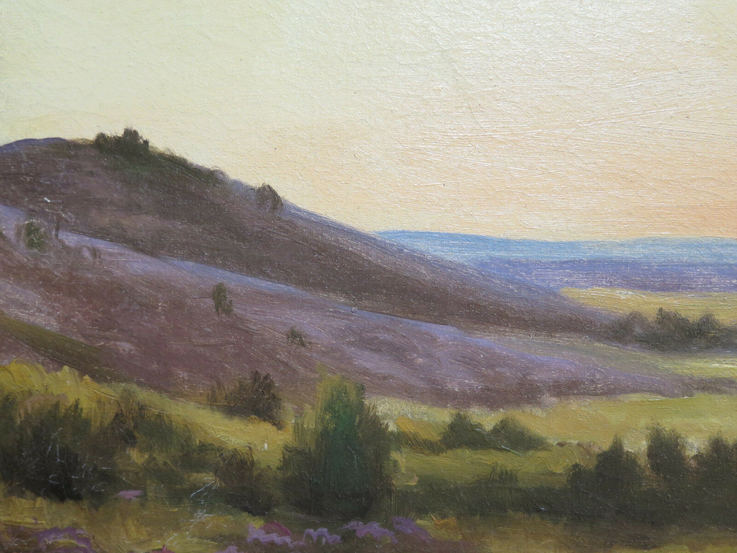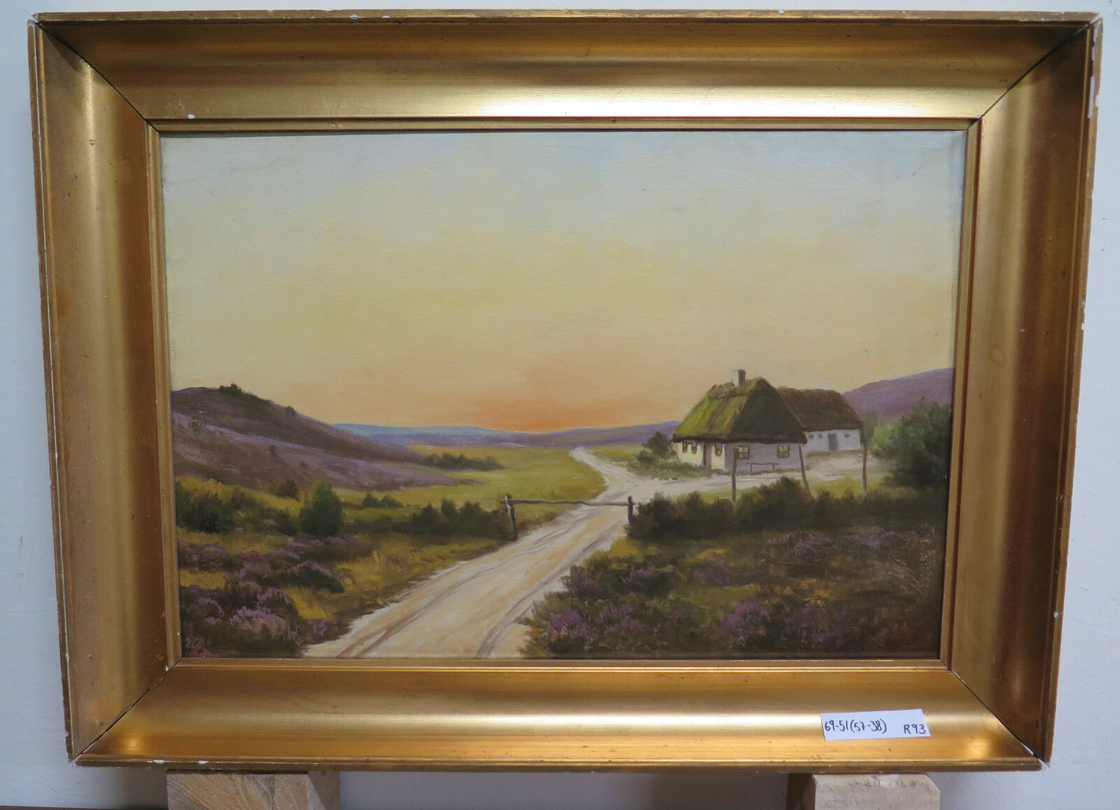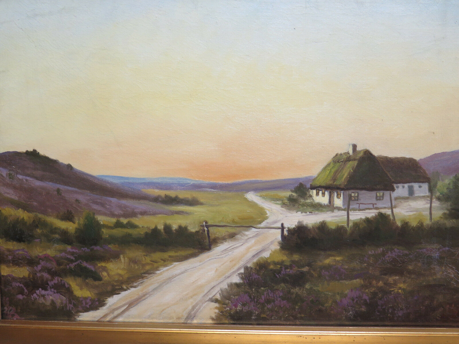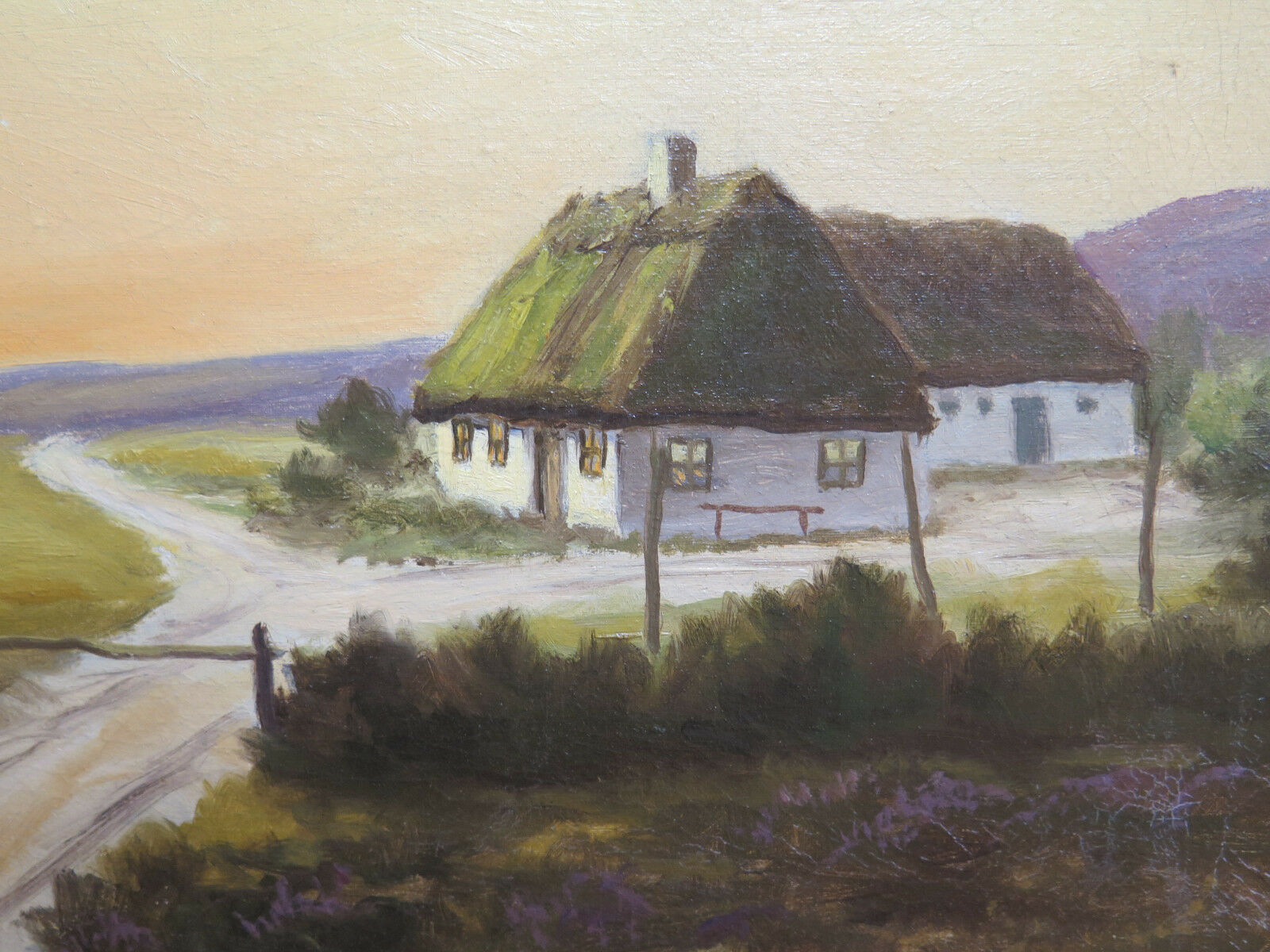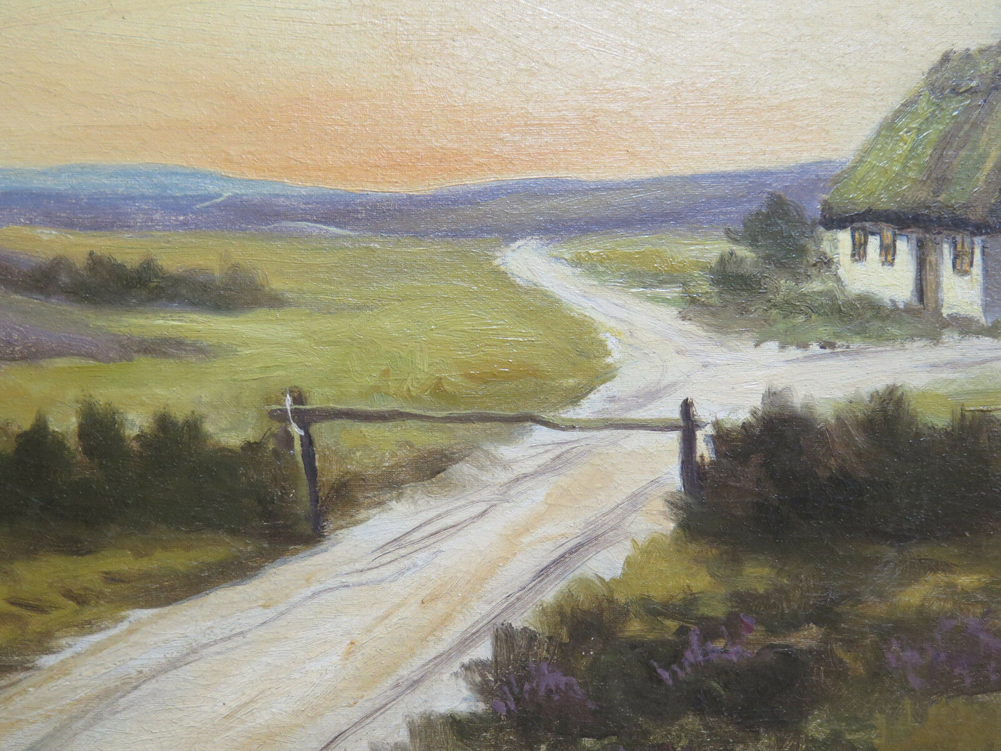 Antico dipinto ad olio raffigurante un paesaggio della campagna danese al tramonto, luce morbida e gusto impressionista.