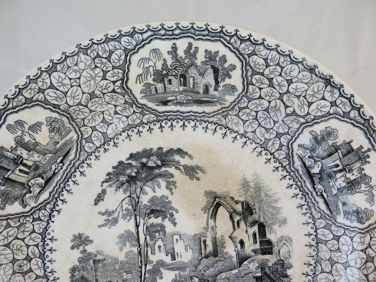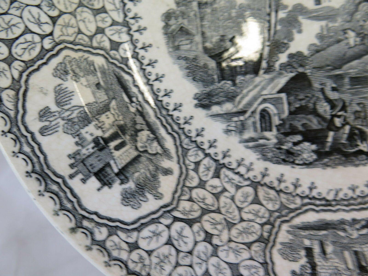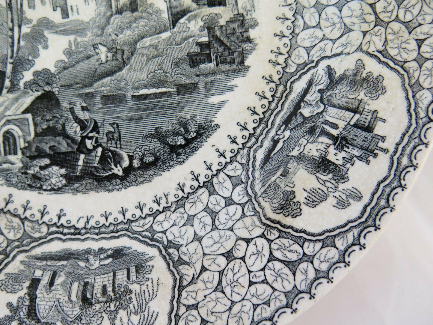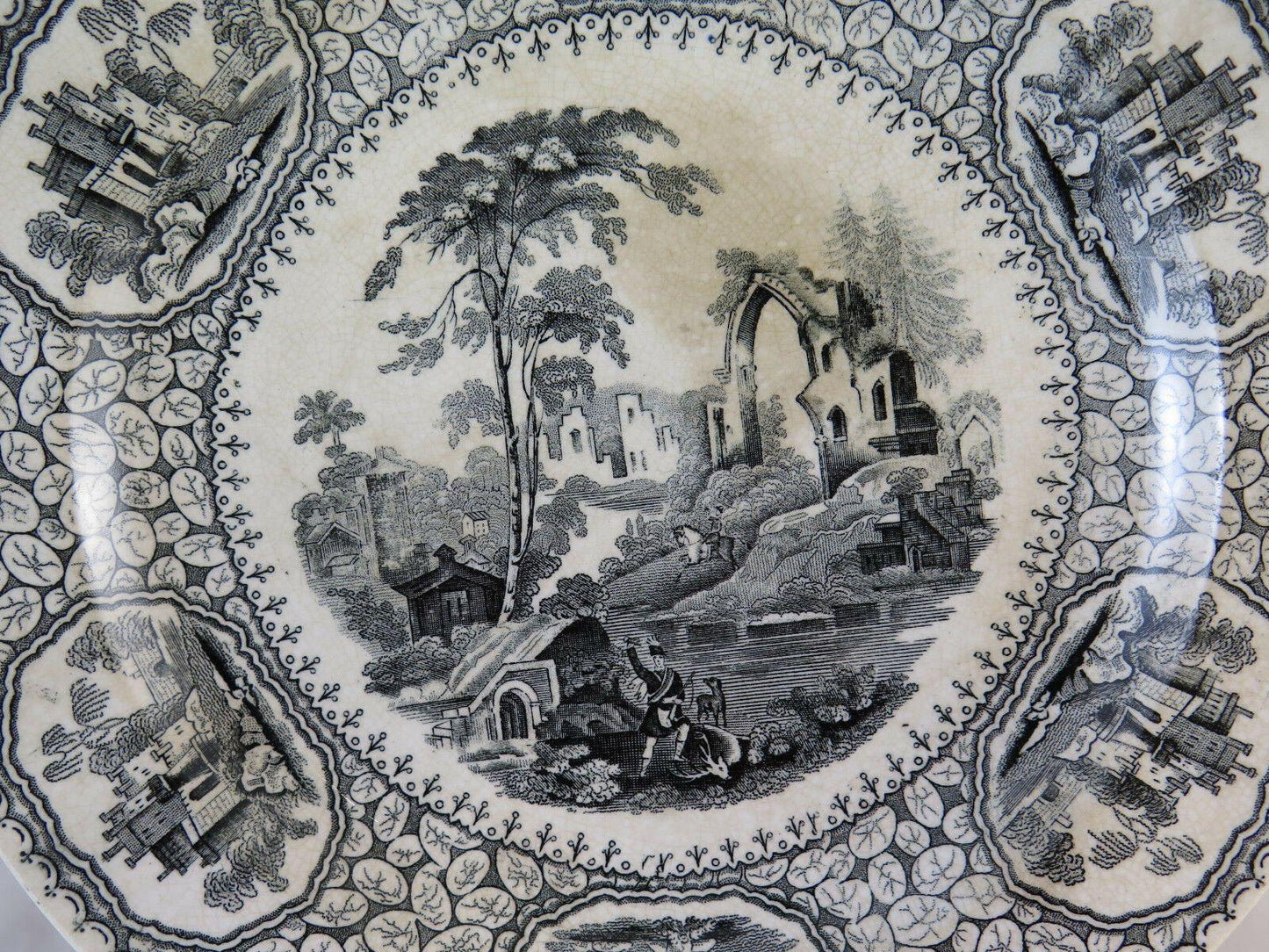 Antico piatto in cercamica di Jemmapes decorato con motivi floreali e paesaggi.