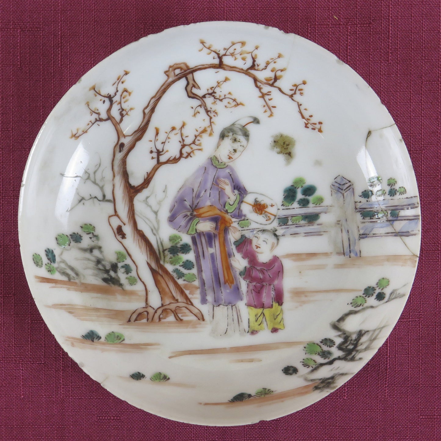 Piatto di porcellana bianca dipinto a mano con le figure di una mamma con bambino in un giardino.