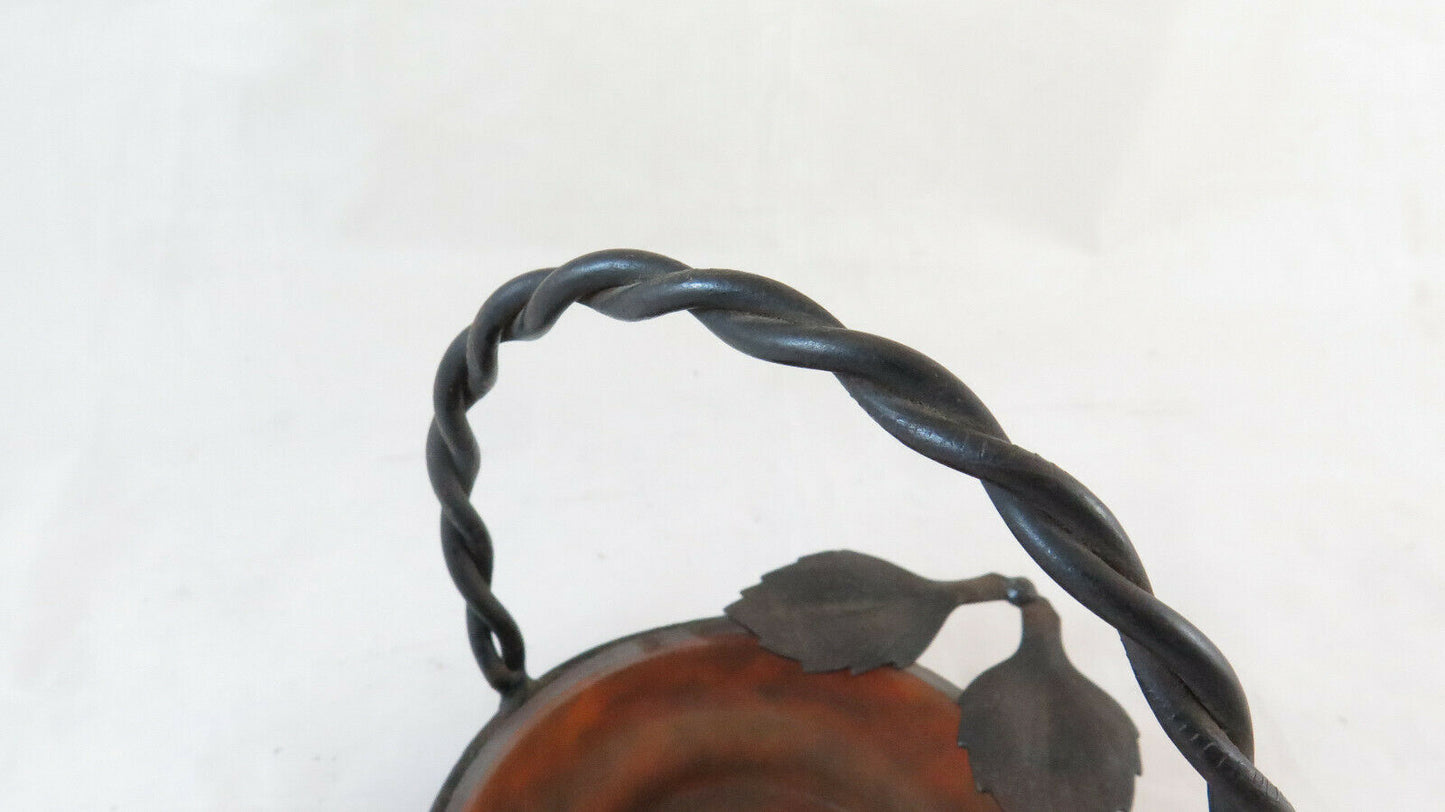 Elegante portacenere in vetro opalino con manico e supporto in ferro battuto decorato con motivi vegetali.