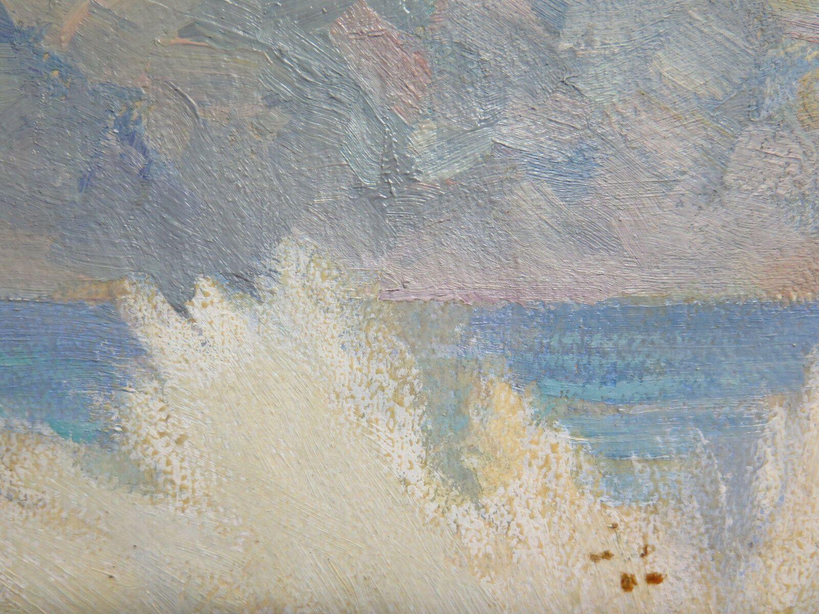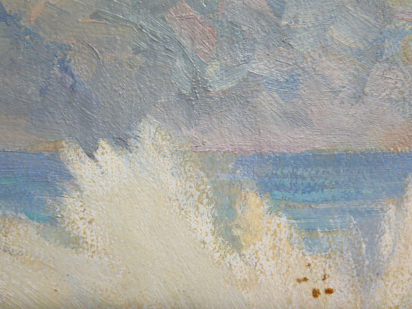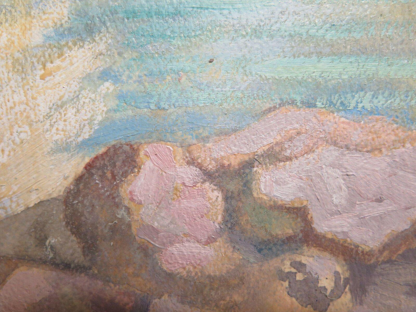 Particolare dipinto ad olio su cartoncino opera del pittore Gaetano Pancaldi (1922-2014) di Piumazzo di Castelfranco Emilia raffigurante un paesaggio di mare.